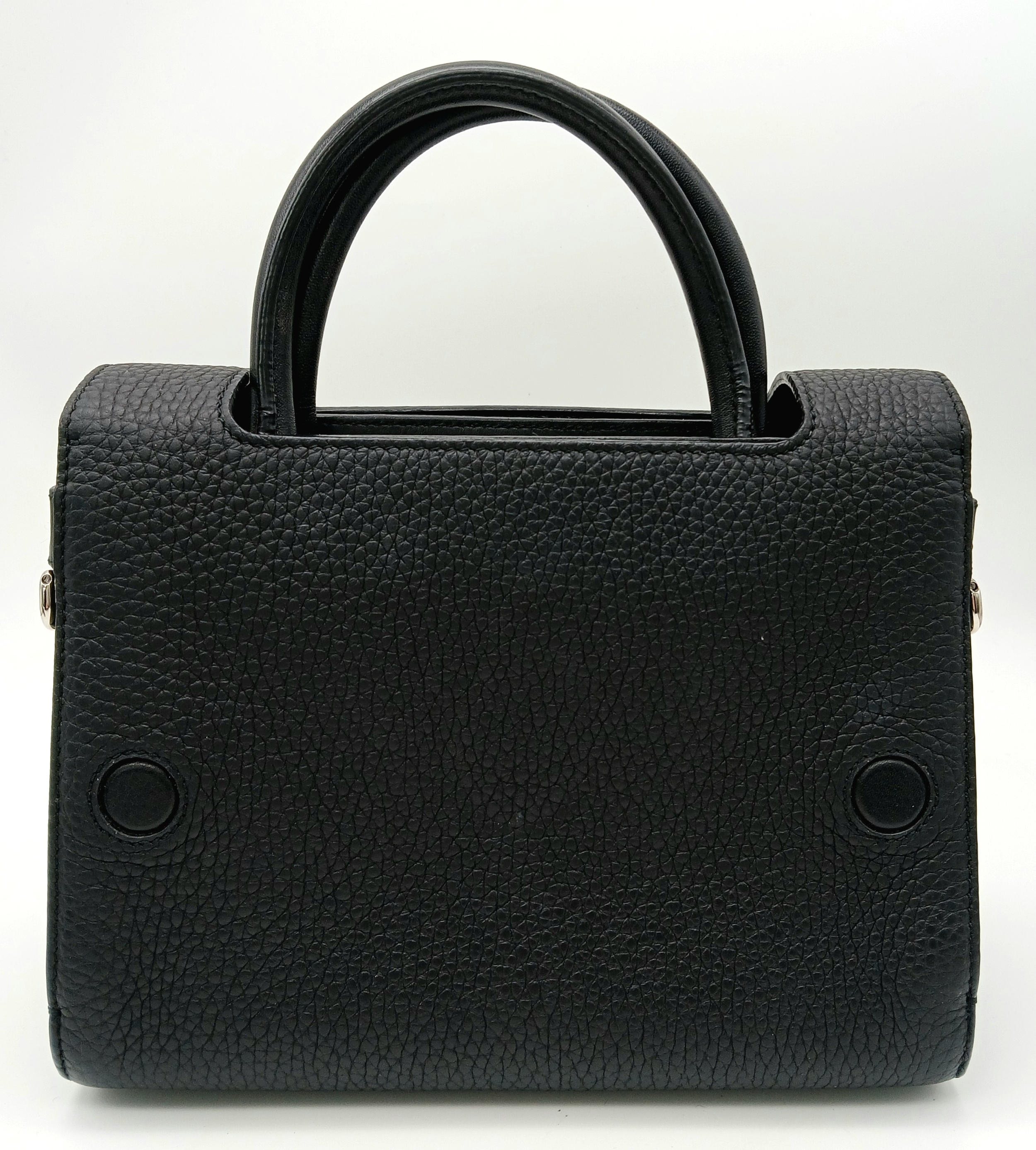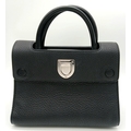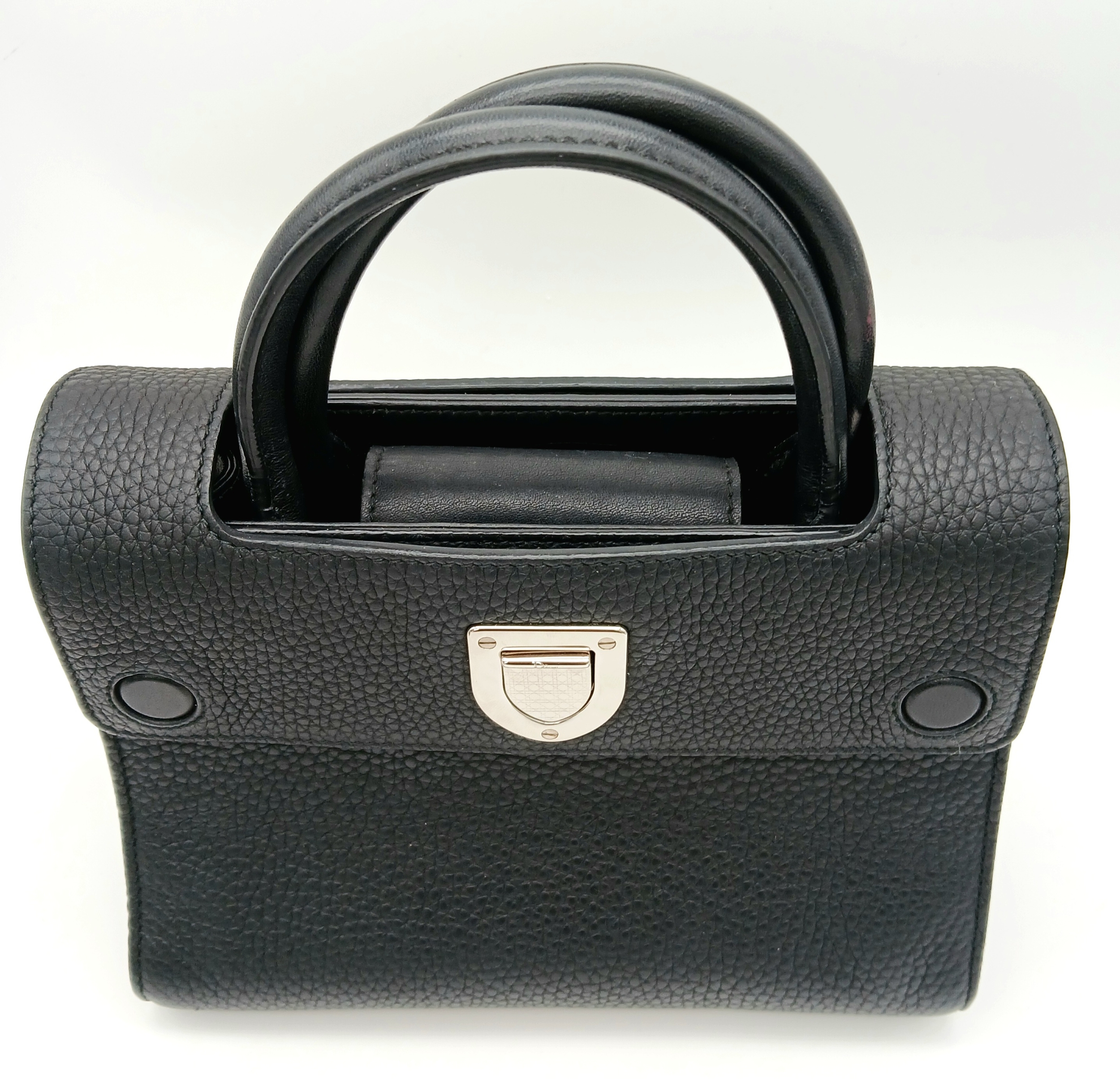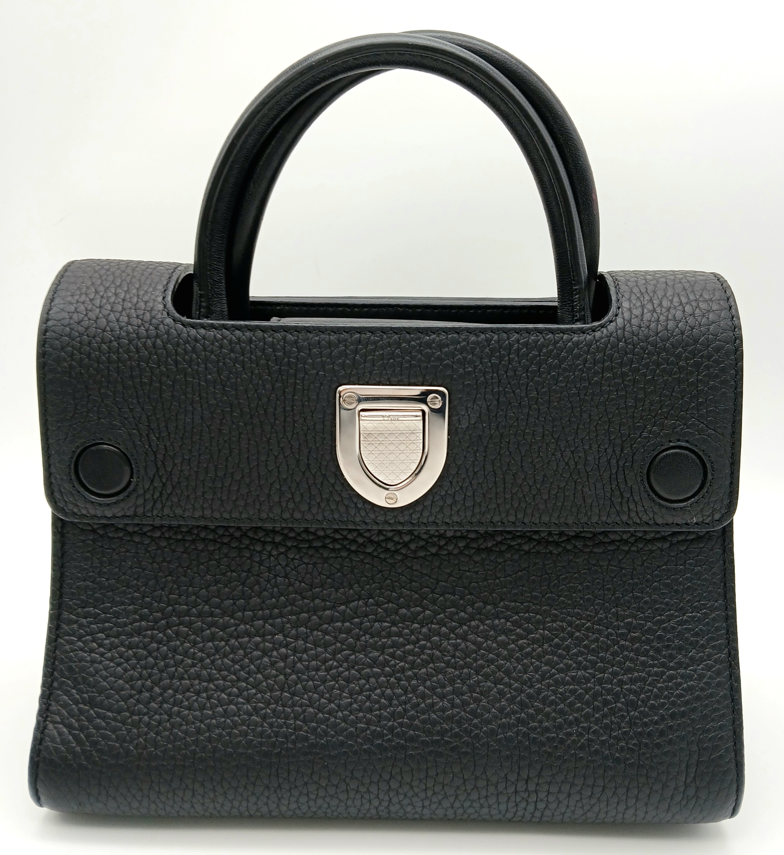 A Christian Dior Black Diorever Handbag. Leather exterior with silver-toned hardware, two rolled leather handles, four protective base studs, press stud closure expandable wings, and magnetic and push clasp closure. Black leather interior with two open side pockets. Approximately 21cm length x 15cm height. A few light stains to exterior, some signs of wear and light stains to interior - please see photos for conditions or request a condition report. Ref: 22969
