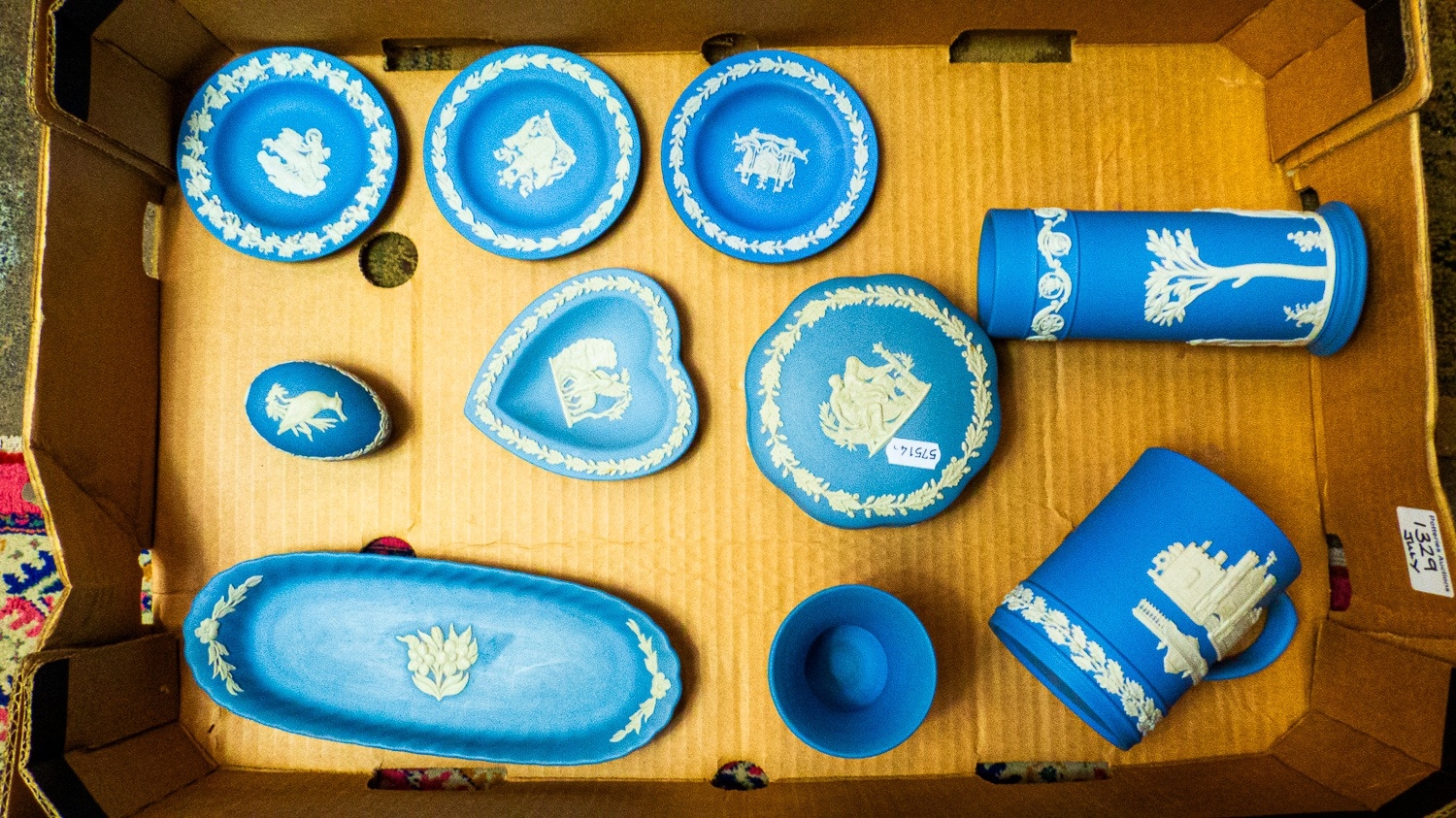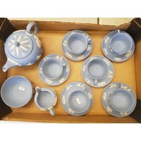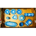Collection of Wedgwood powder blue jasperware to include a tankard, lidded pot, pin dishes, vases etc (1 tray).