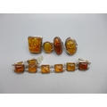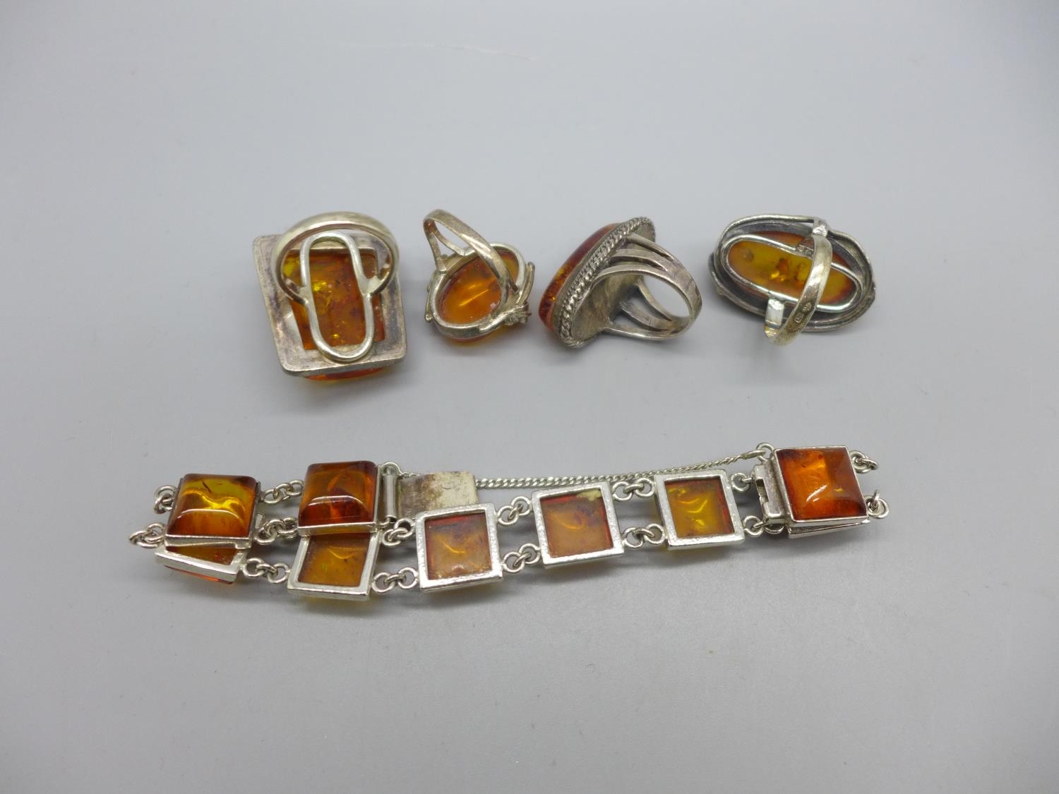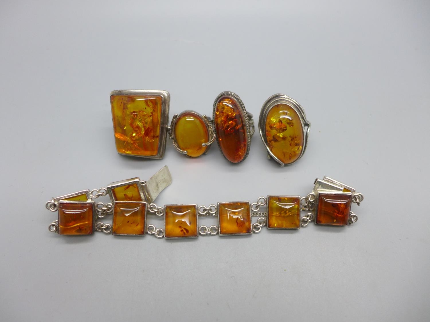 Four silver and amber rings and a silver and amber bracelet,...
