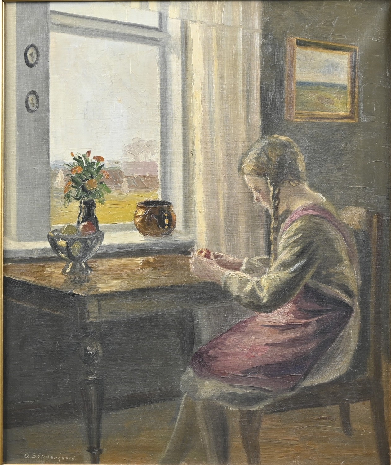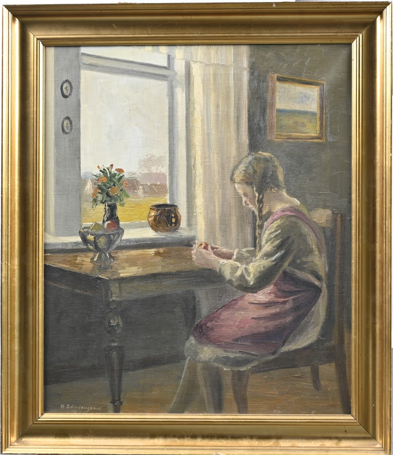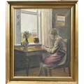 Ole Søndergaard (1876-1958) - A Young Girl Peeling an Orange, seated before a window, oil on canvas, 60.5 x 51cm