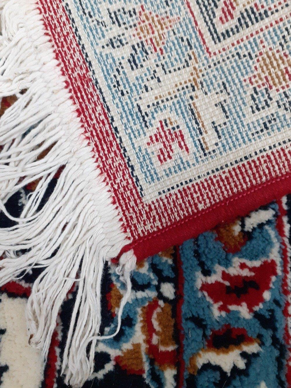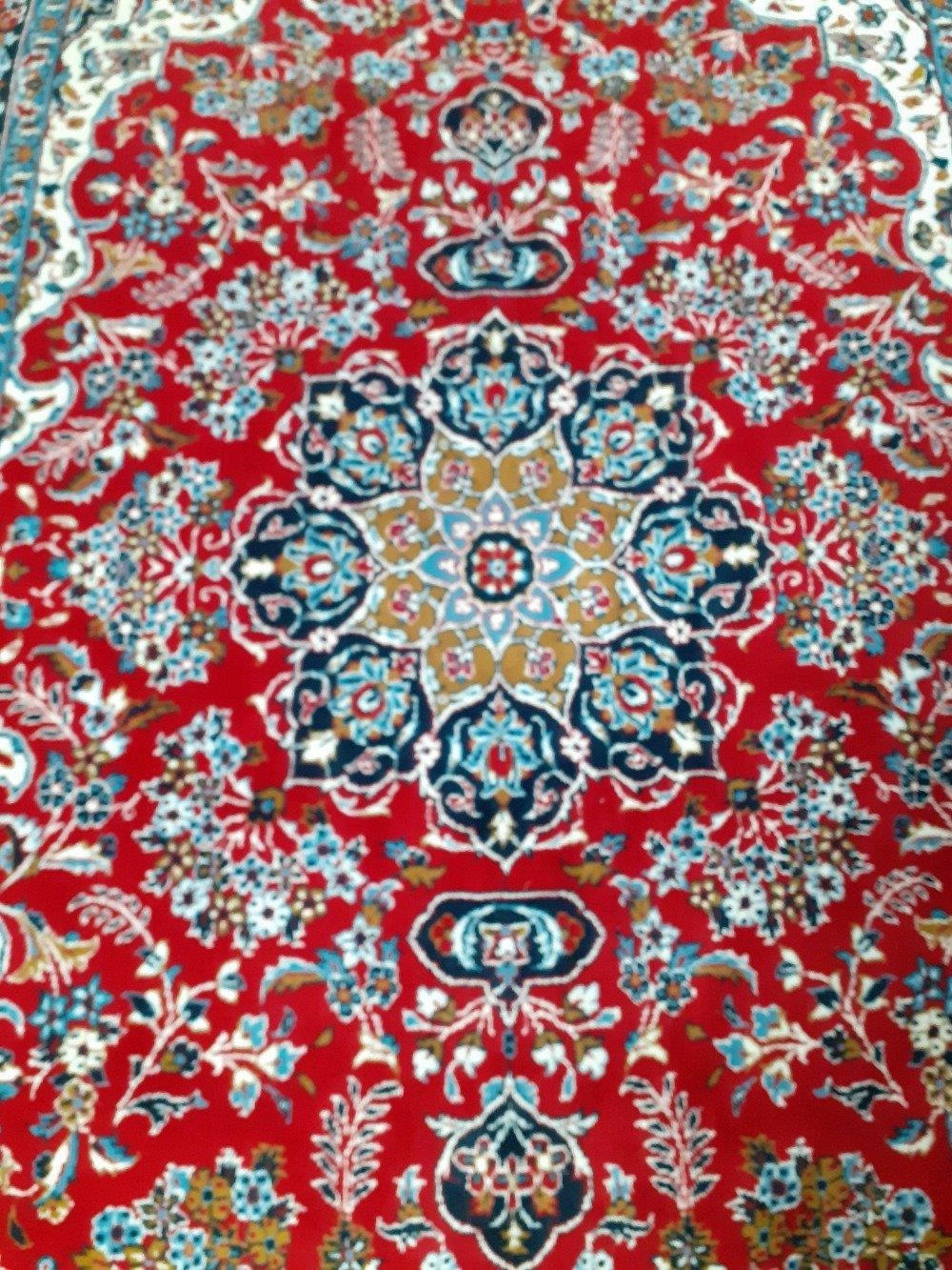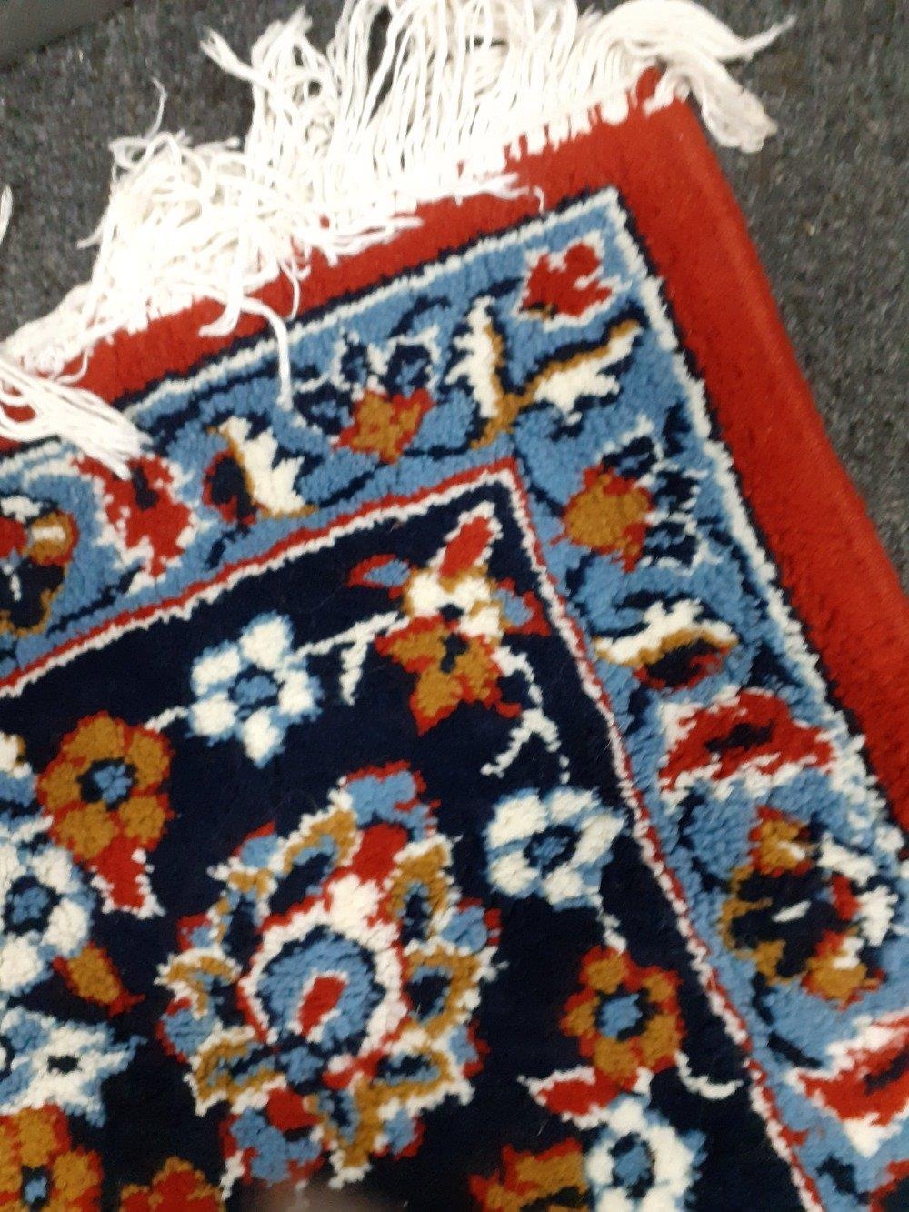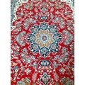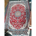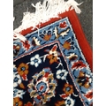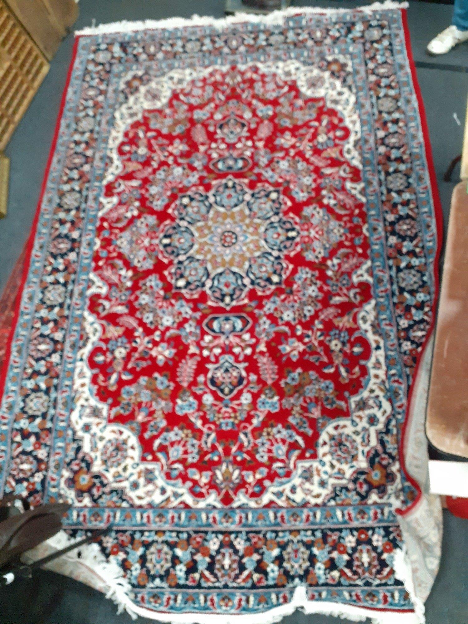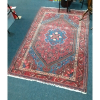 Large vintage Persian rug red base with blue surround and a brown central medallion and intricate floral decoration throughout. A very attractive piece in good condition. 300 x 180 cm approx