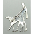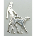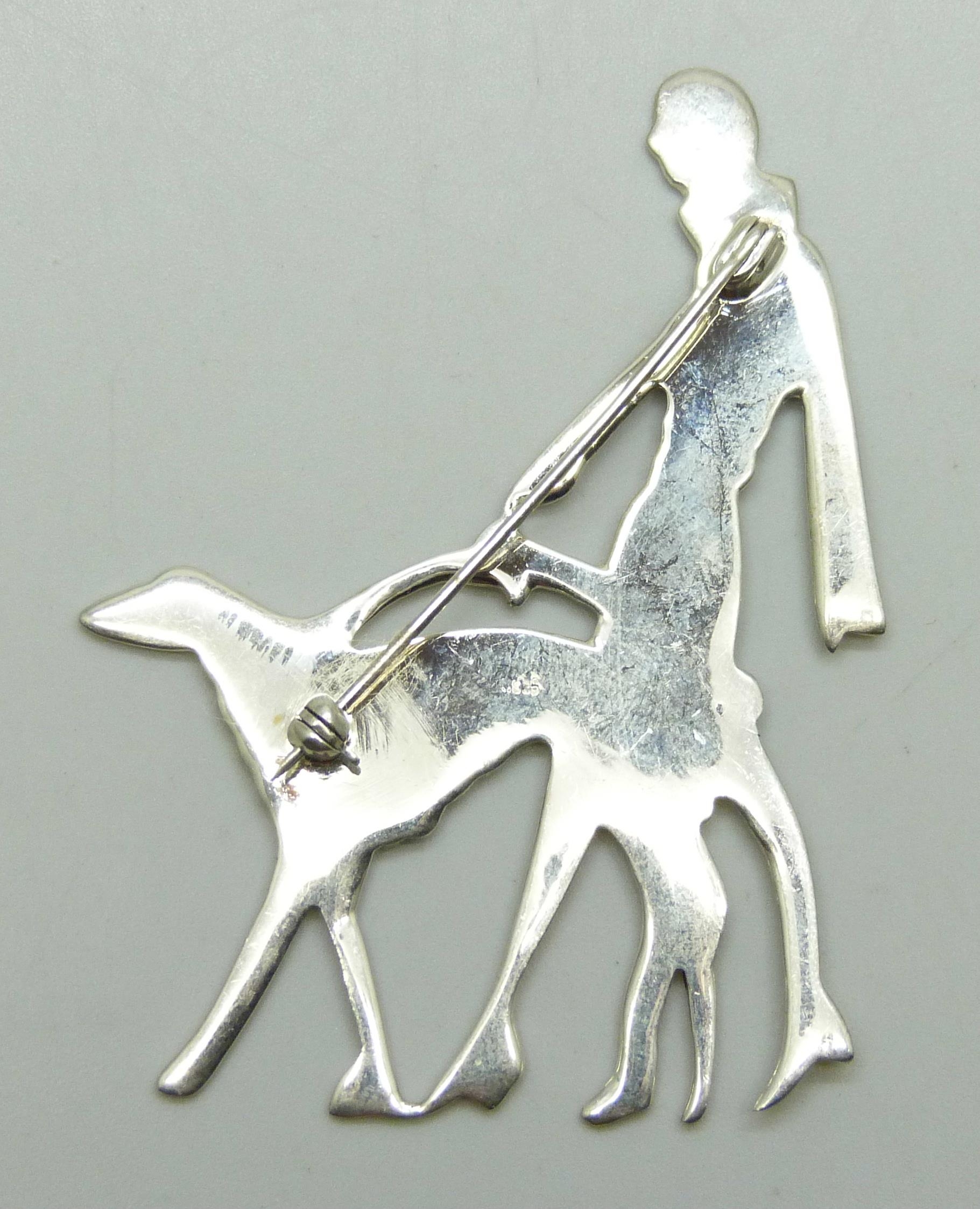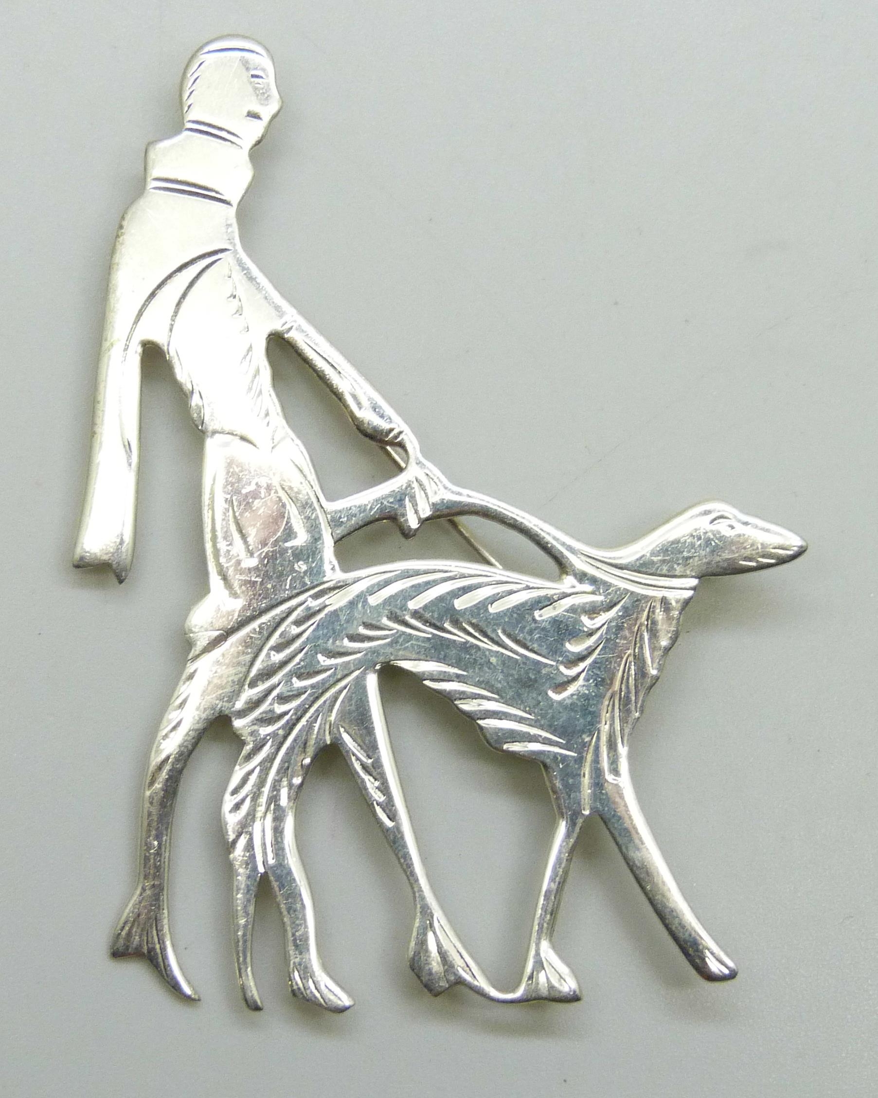 An Art Deco style silver brooch in the form of a lady walking a dog, 6.6cm
