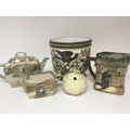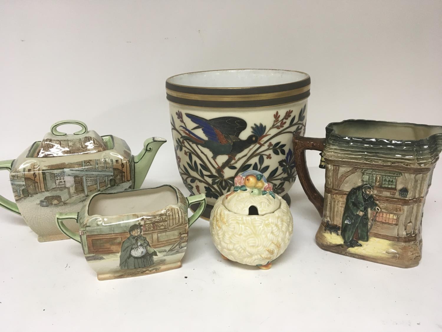 A Royal Doulton tea pot and conforming sugar bow Clarice Cliff preserve pot a Doulton Oliver Twist Jug and a porcelain jardiniere. (tea pot crazed otherwise no obvious damage)