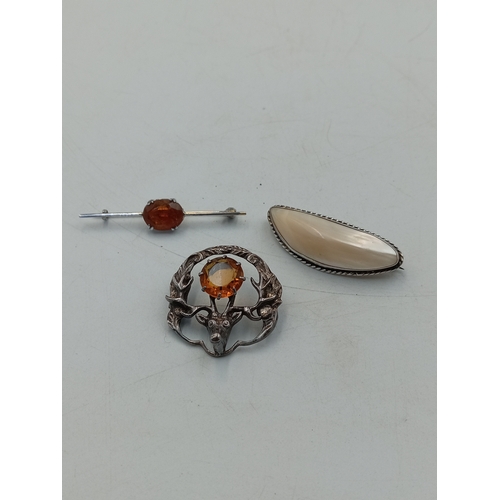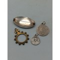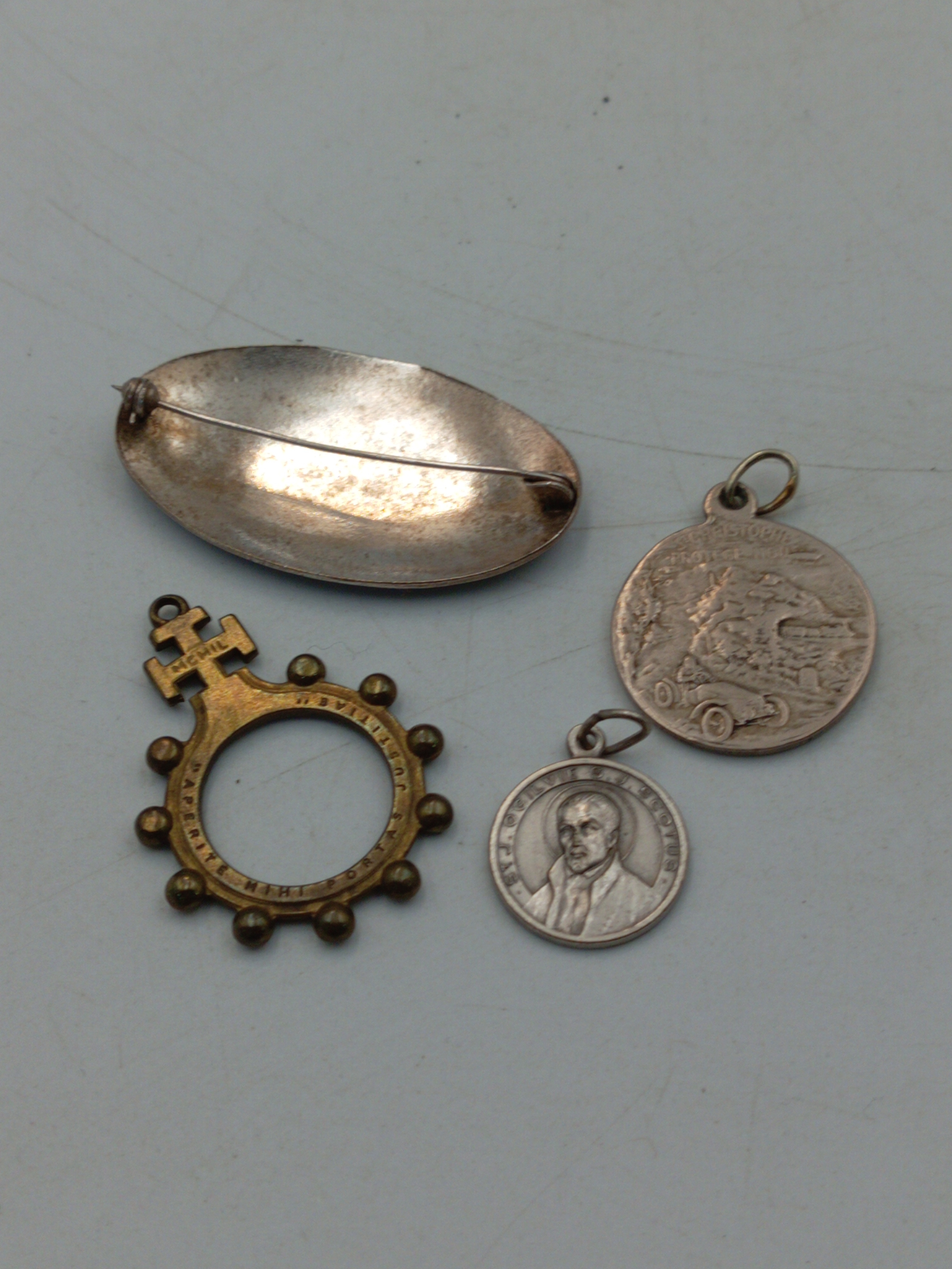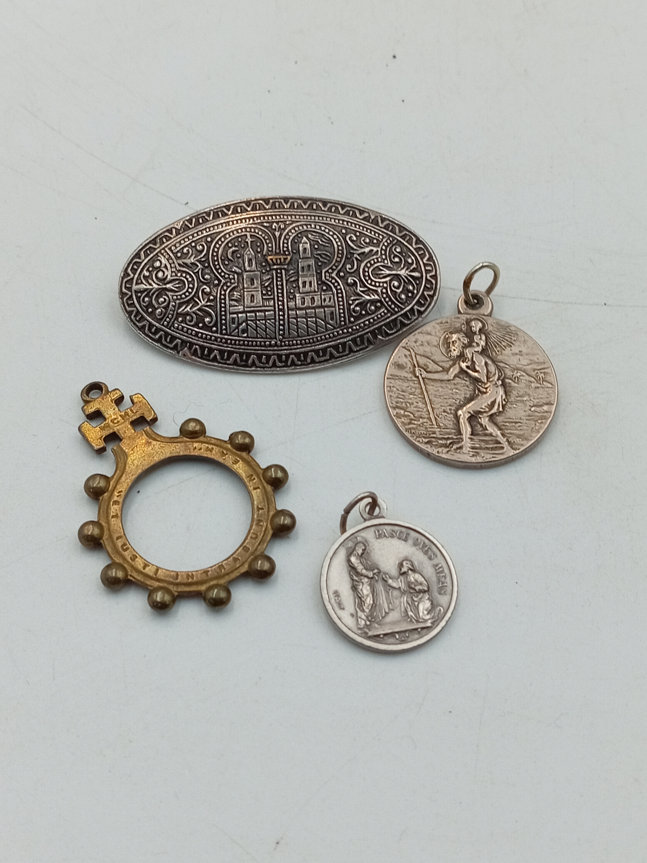 An antique brass rosary ring together with a middle Eastern silver tone brooch, a St. Christopher pendant and a similar charm