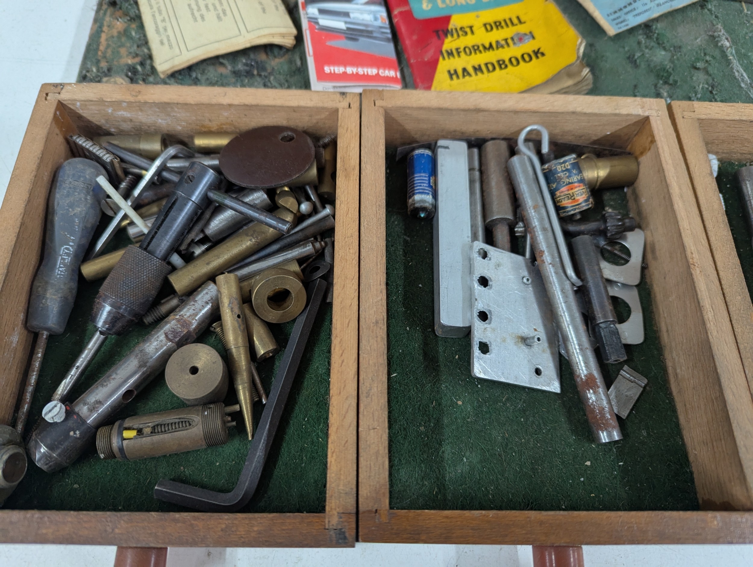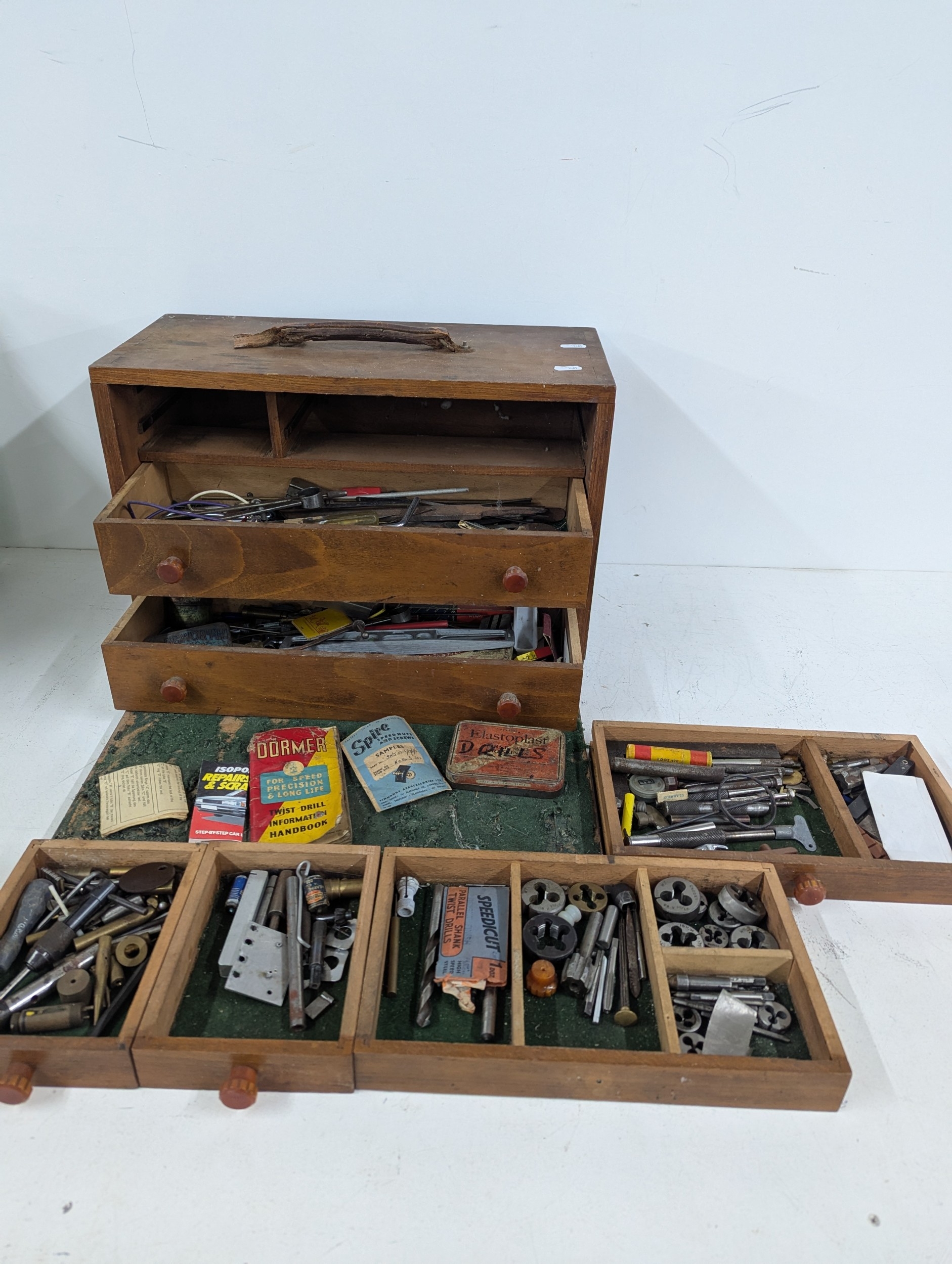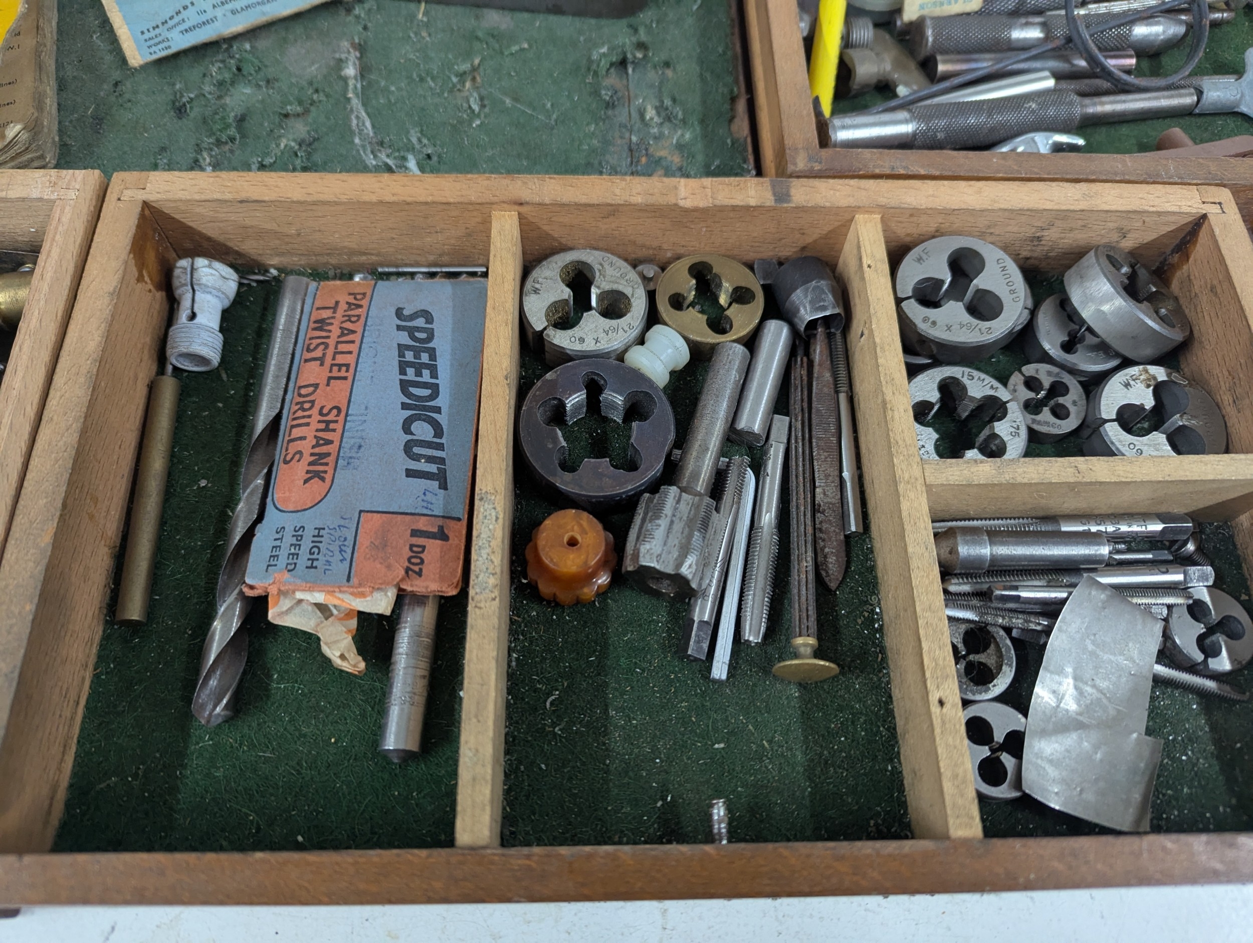 A machinist wood tool box A/F to include vintage taps and dies and others