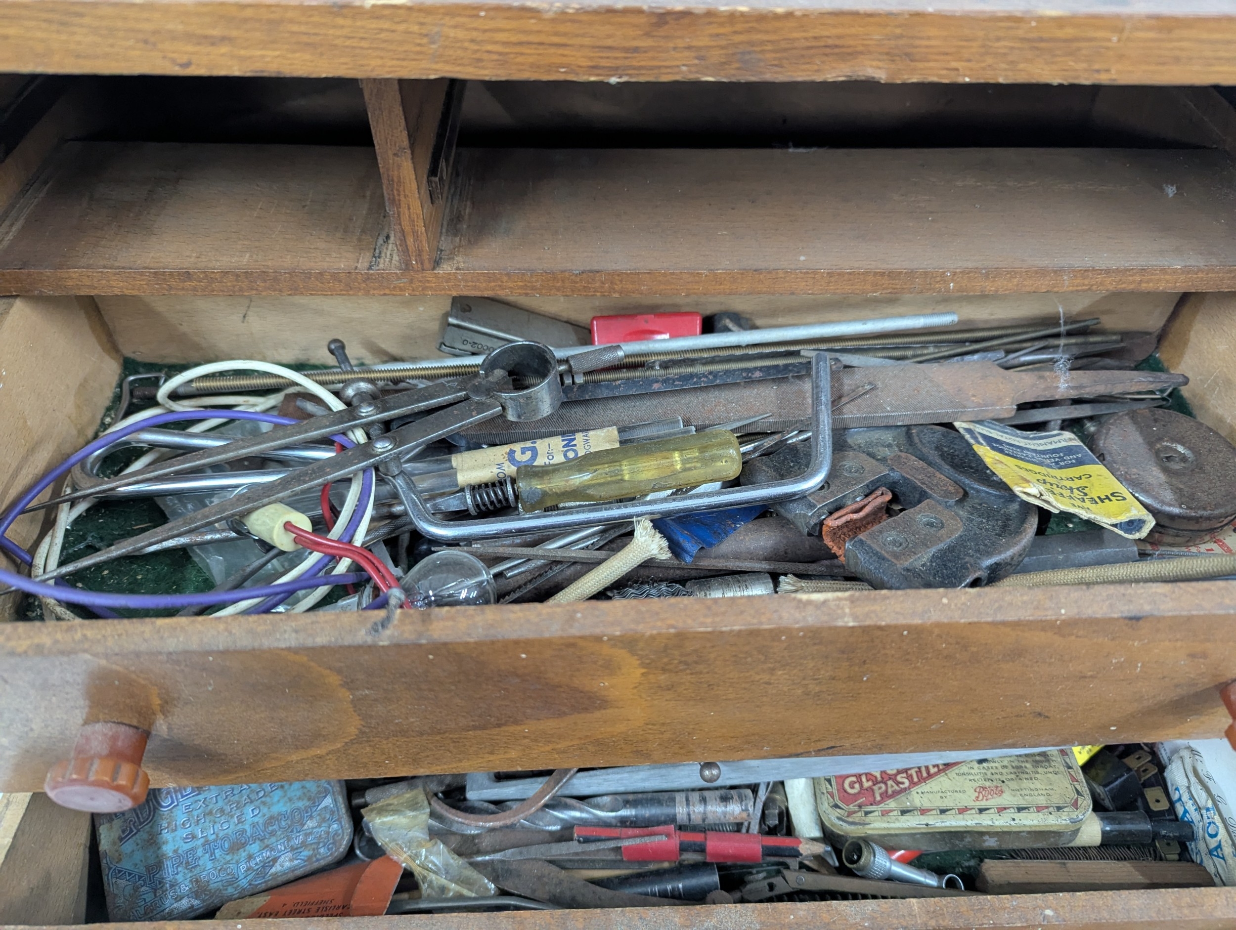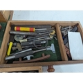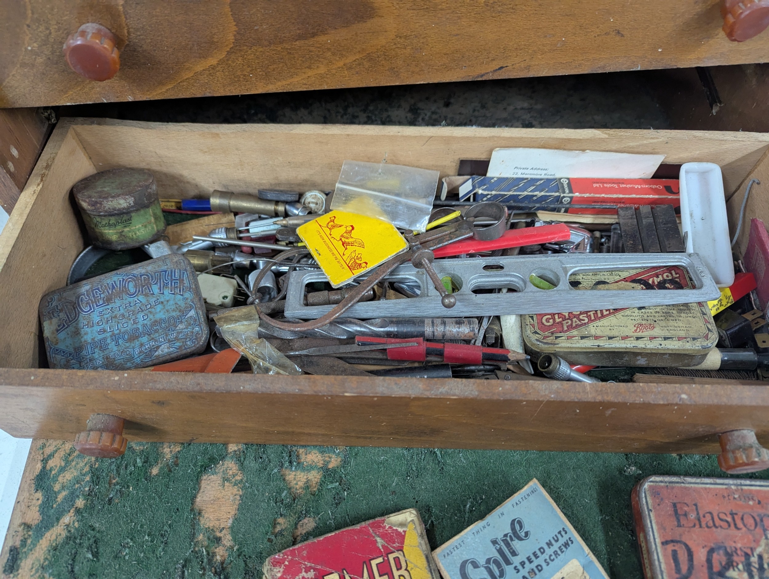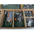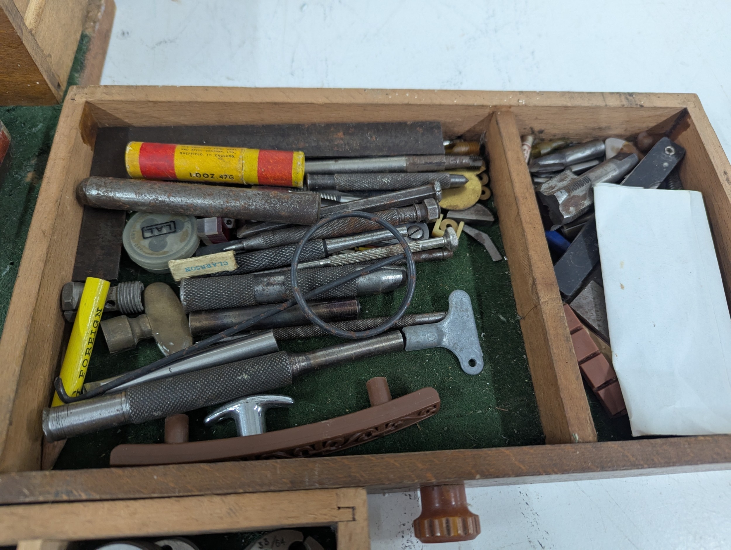 A machinist wood tool box A/F to include vintage taps and dies and others