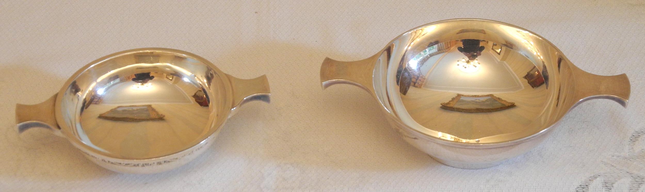 An Elizabeth II silver wine taster, lug handles, 15cm wide, David Shaw Silverware Ltd, Birmingham 1981; another, smaller, 12cm wide, Hamilton & Inches Edinburgh 1986, 200g, (6.43 ozt)