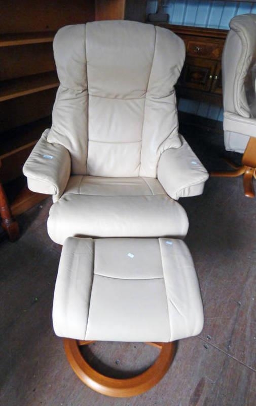CREAM LEATHER RECLINING ARMCHAIR & STOOL