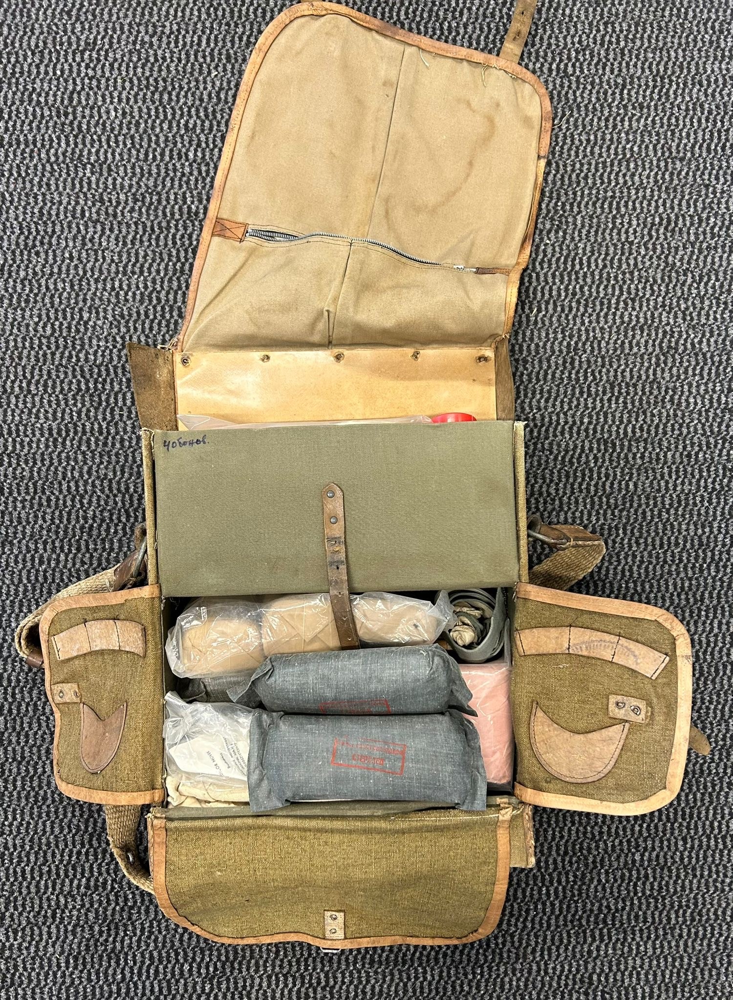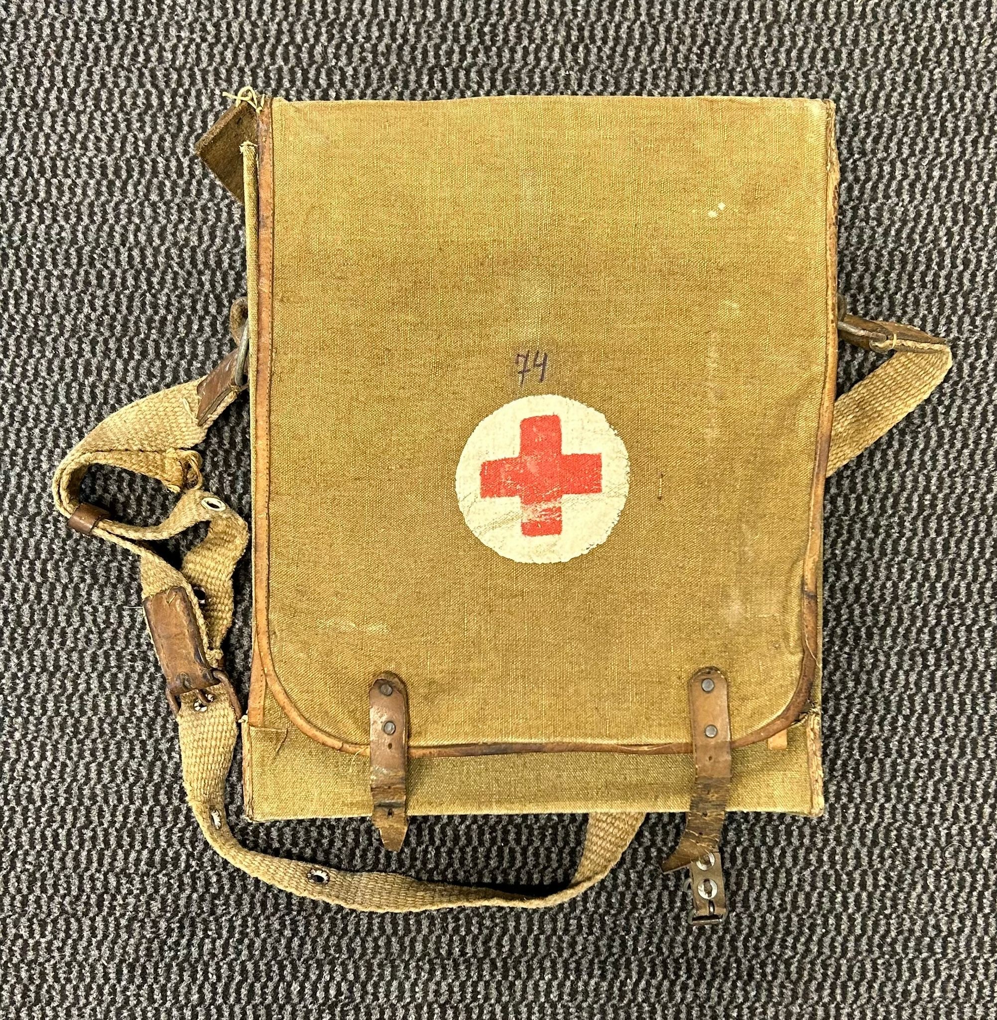 WW1 Bulgarian army medical Tornister Pack Red Cross to the front filled with post war bandages.
