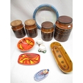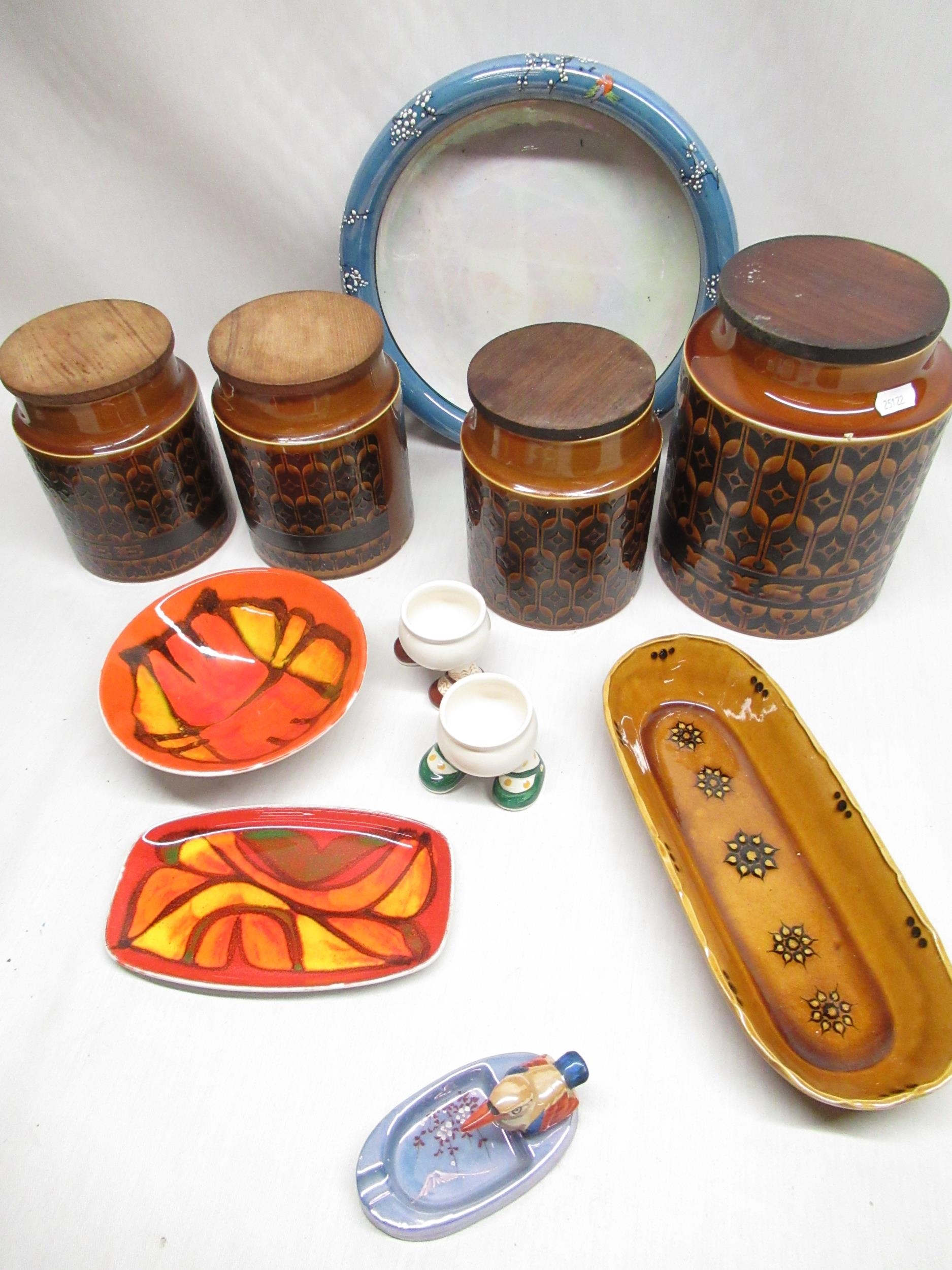 Early C20th W&R "Carlton Ware" blue luster ware bowl with raised enamel highlights, four 1970's Hornsey "Heirloom" storage jars, two Poole Pottery flambé ware trays, other decorative ceramics
