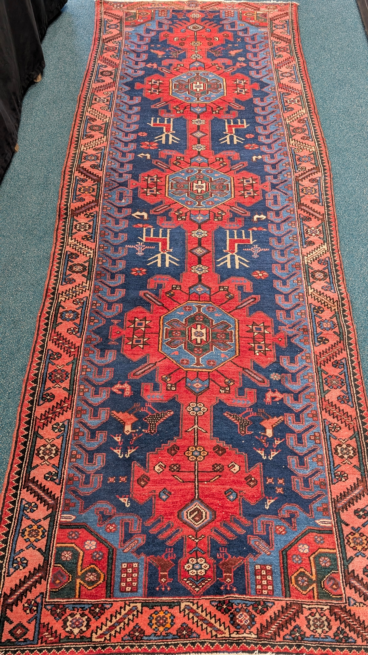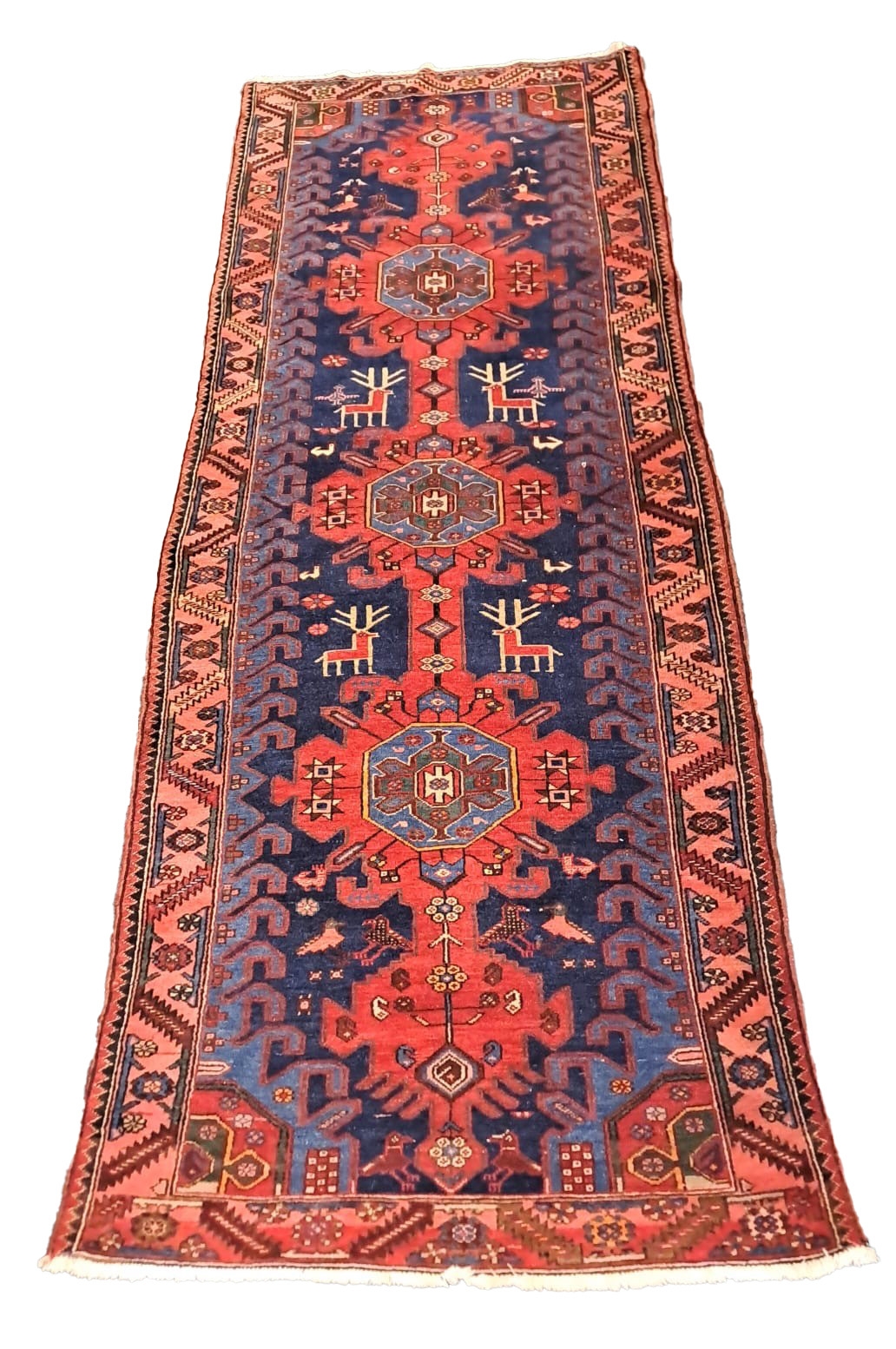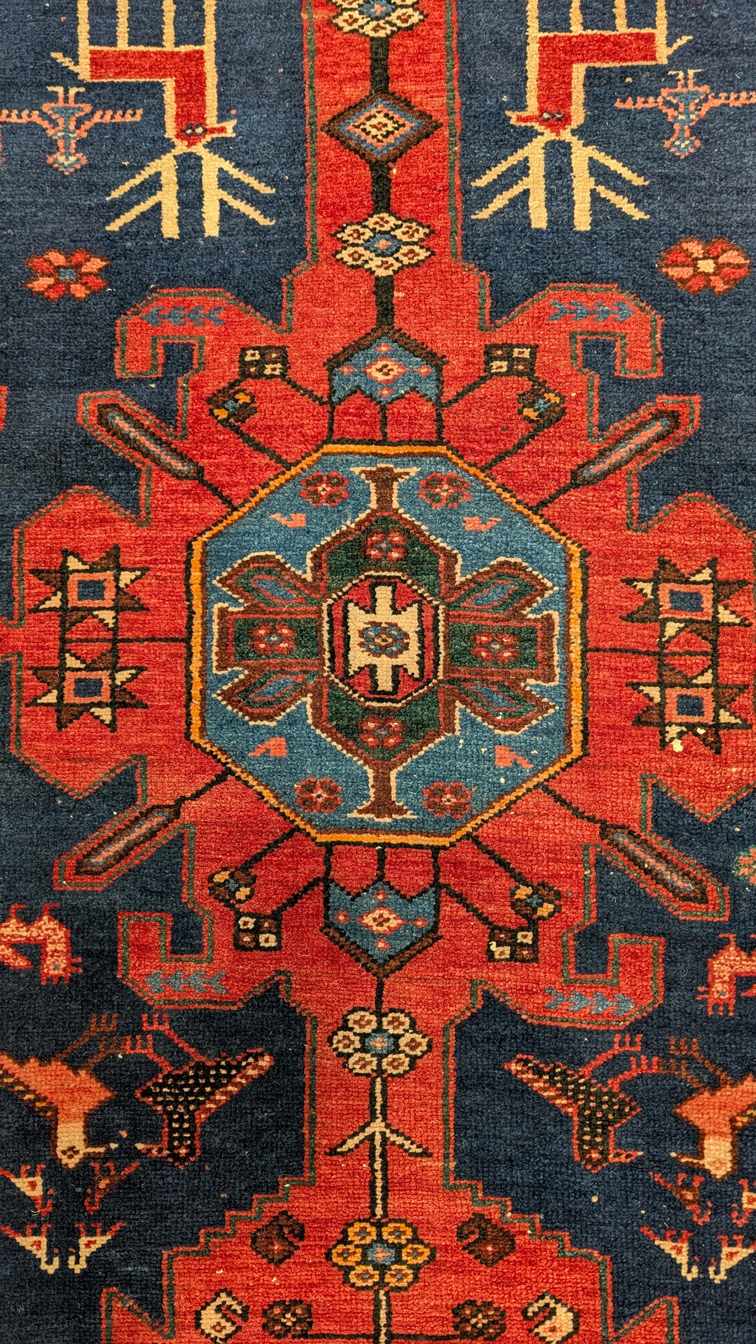 With three mid-blue guls on red linear medallions and a blue ground populated by deer and birds, within geometric borders.