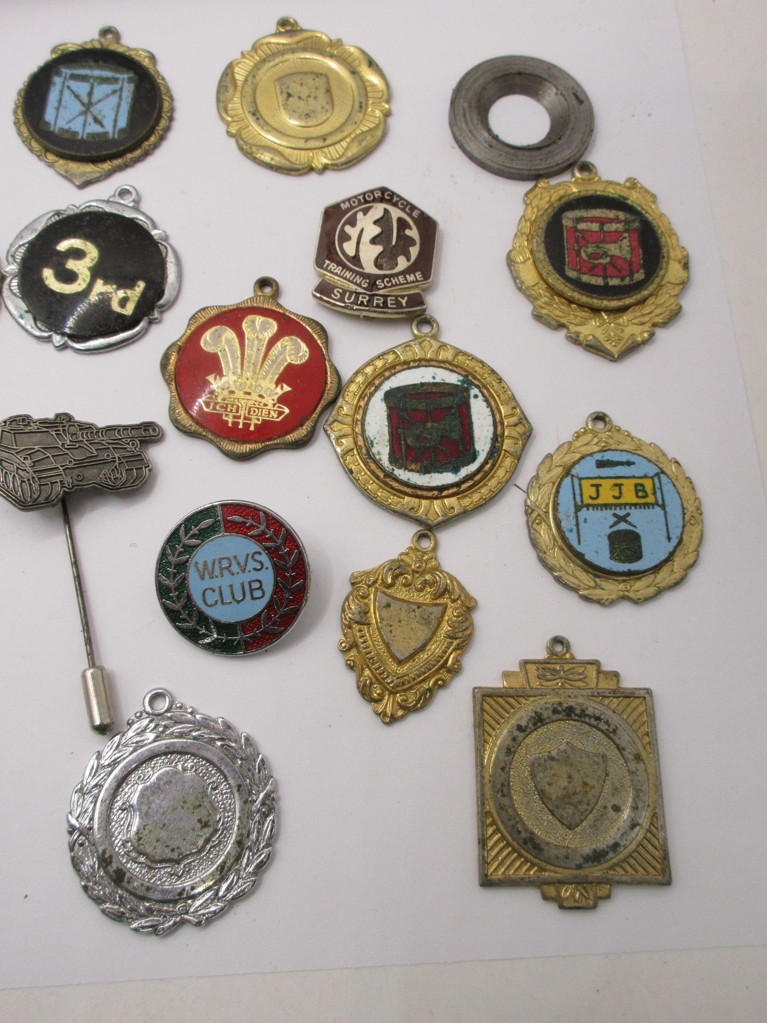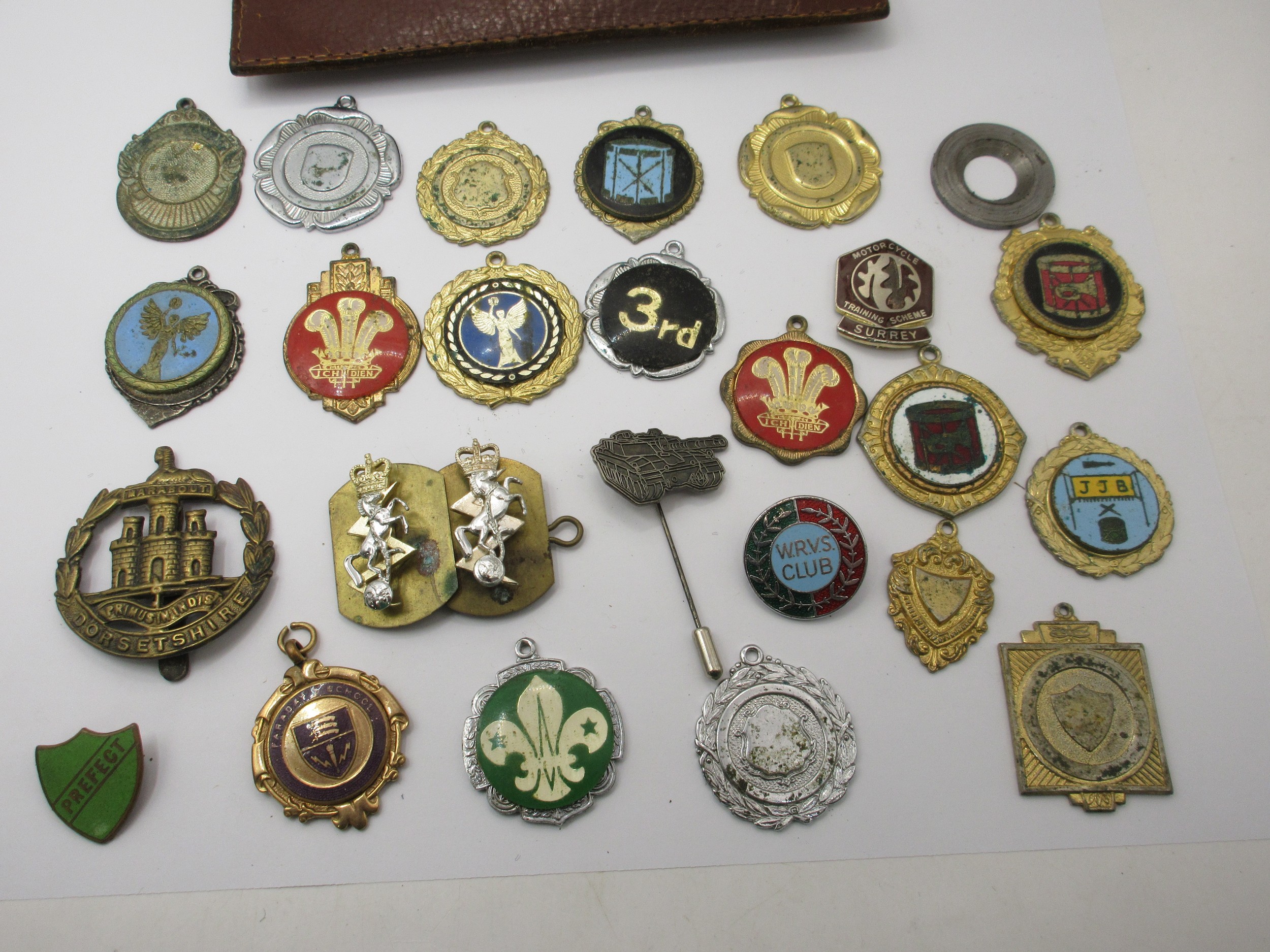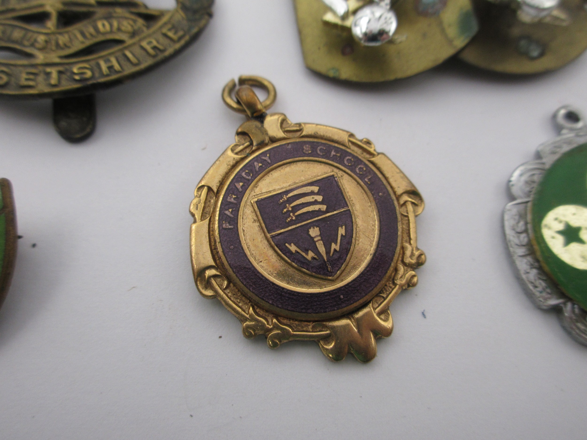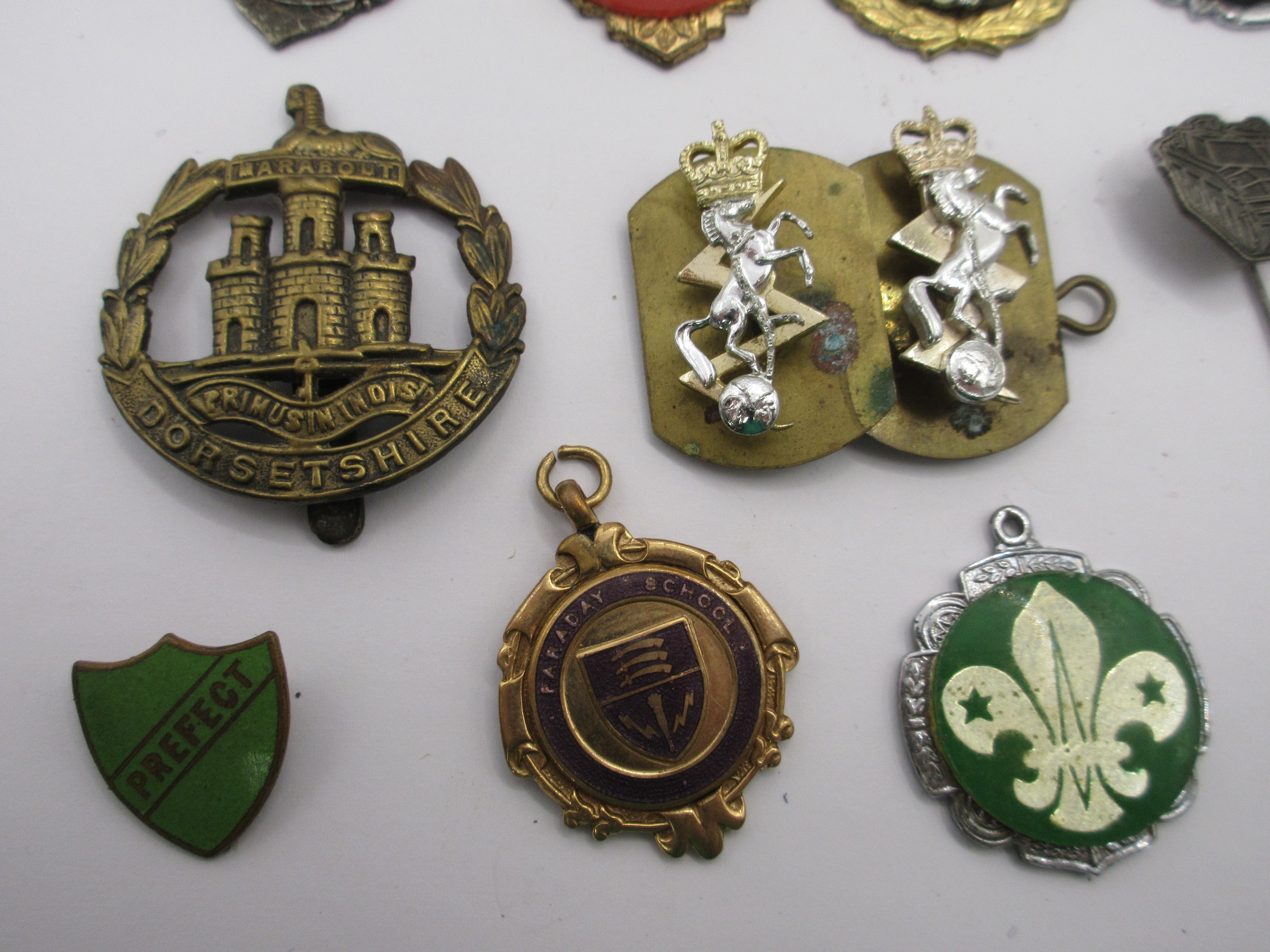 Royal signals colar patches ,along with Dorsetshire cap badge and an aray of other interesting medalions from The scout movement ,motorcycle training scheme, School perfect and others all as per pictures
