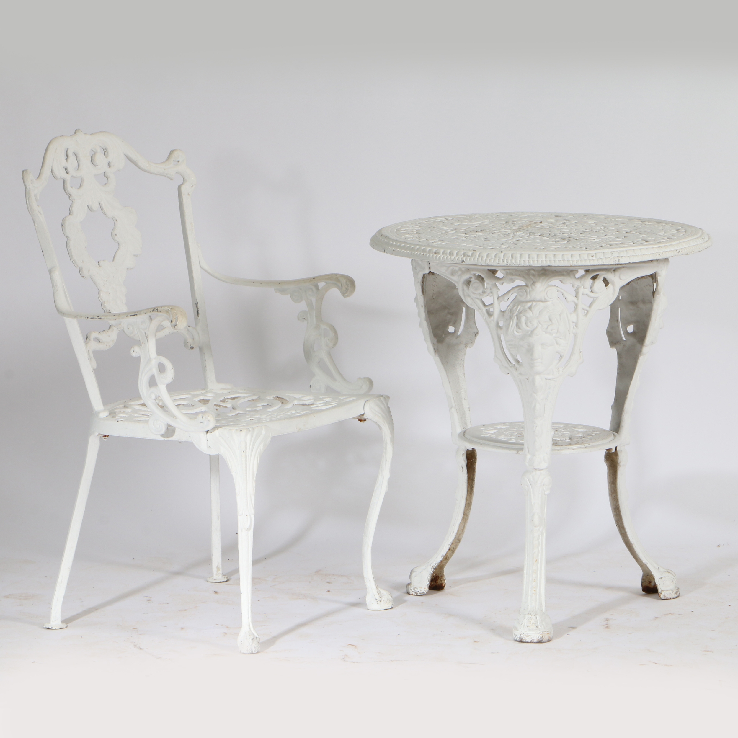 A LATE 19TH/EARLY 20TH CENTURY CAST IRON TABLE TOGETHER WITH AN ALUMINUM ARMCHAIR. both being painted in white and having a pierced design, the table decorated with classical mask terms, the table 68cm high, 60cm diameter the chair 85cm high.