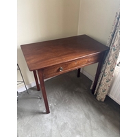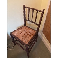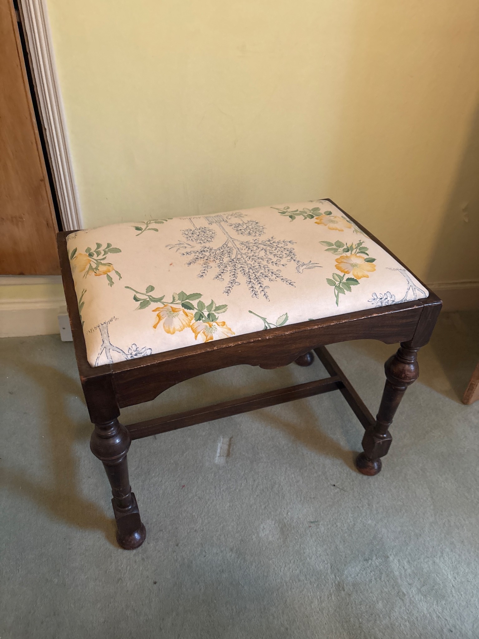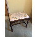 Wooden bench with floral upholstered seat and turned legs.