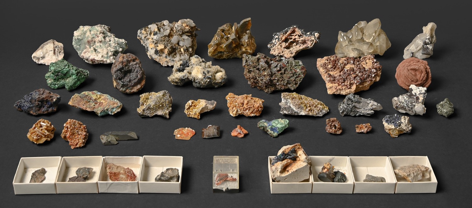 Vanadinite, Mines d'Aouli, Midelt, Morocco, 112mm, Calcite and Rhodochrosite, Quartz, Sphalerite, Galena and Pyrite, Stari Trg Mine, Trepca, Yugoslavia, 107mm, Baryte, Silius, Nr Cagliri, Sardinia, 95mm and others, Harker Collection label, with location and year of find or acquisition (40*)