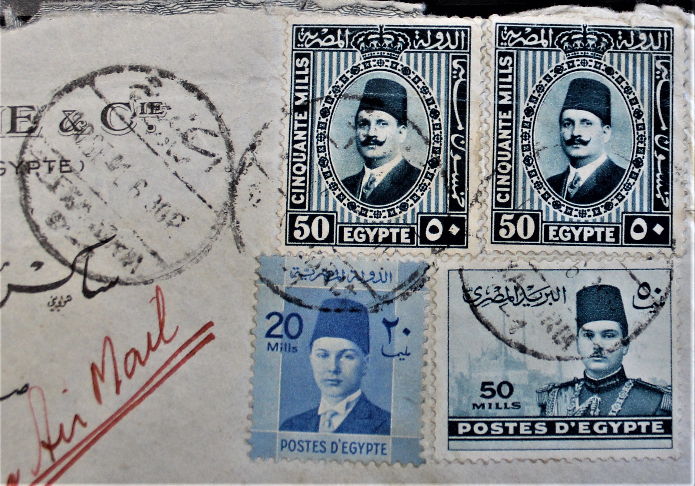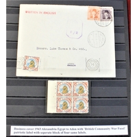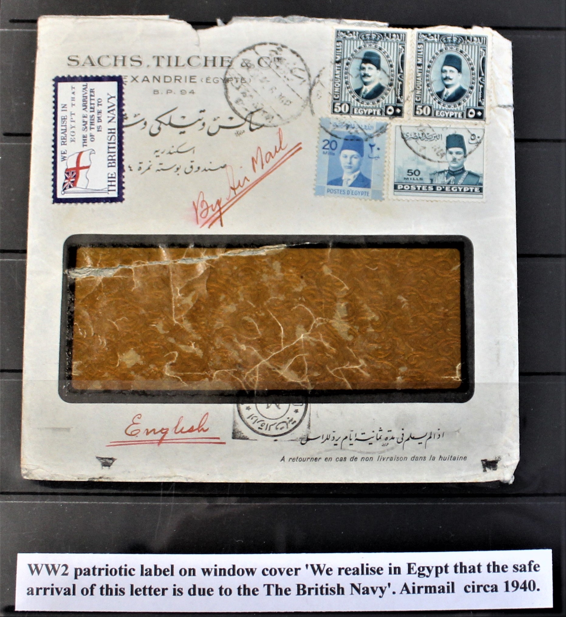 Patriotic and Propaganda Cinderella Labels - Egypt commercial envelope posted Airmail Alexandria to Ciro 1941-Egyptian censor cancel-patriotic label 'We realise in Egypt that save arrival of this letter is due to The British Navy"
