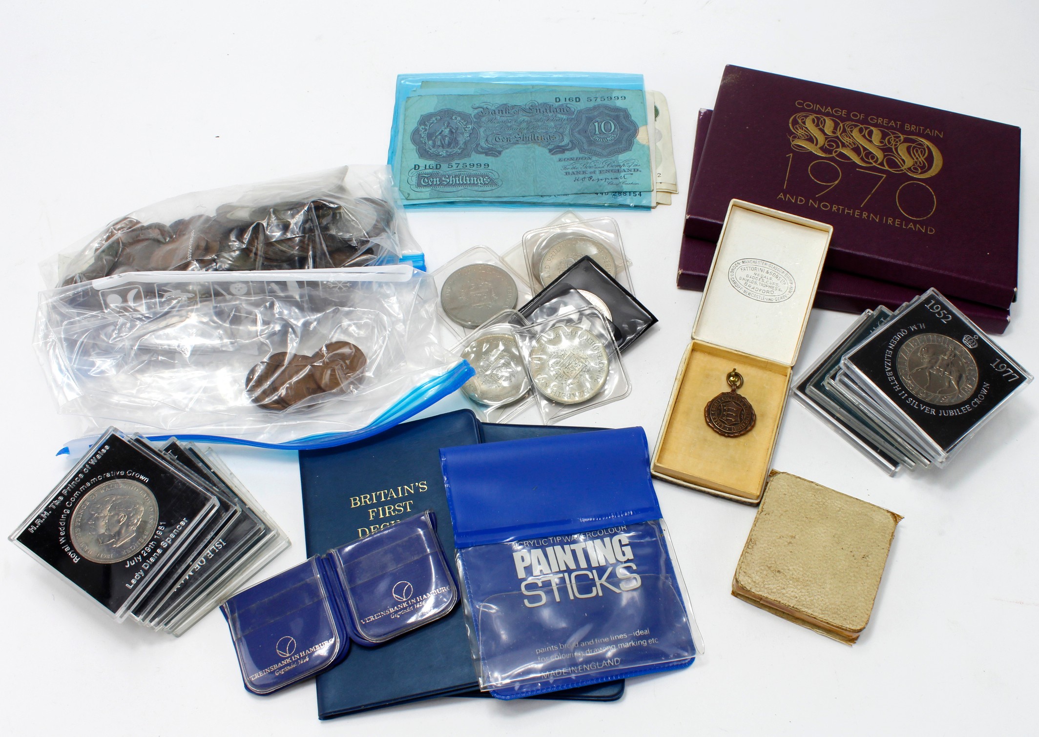 GB & World Coins, mostly GB assortment including 2x 1970 'flat pack' proof sets, crowns, a little silver noted, a few GB & French "war-time" banknotes.