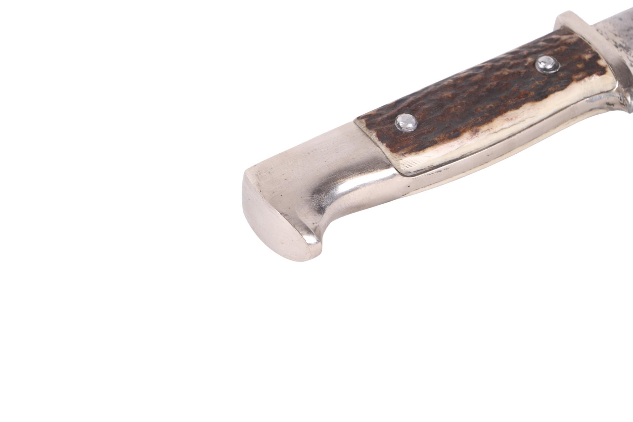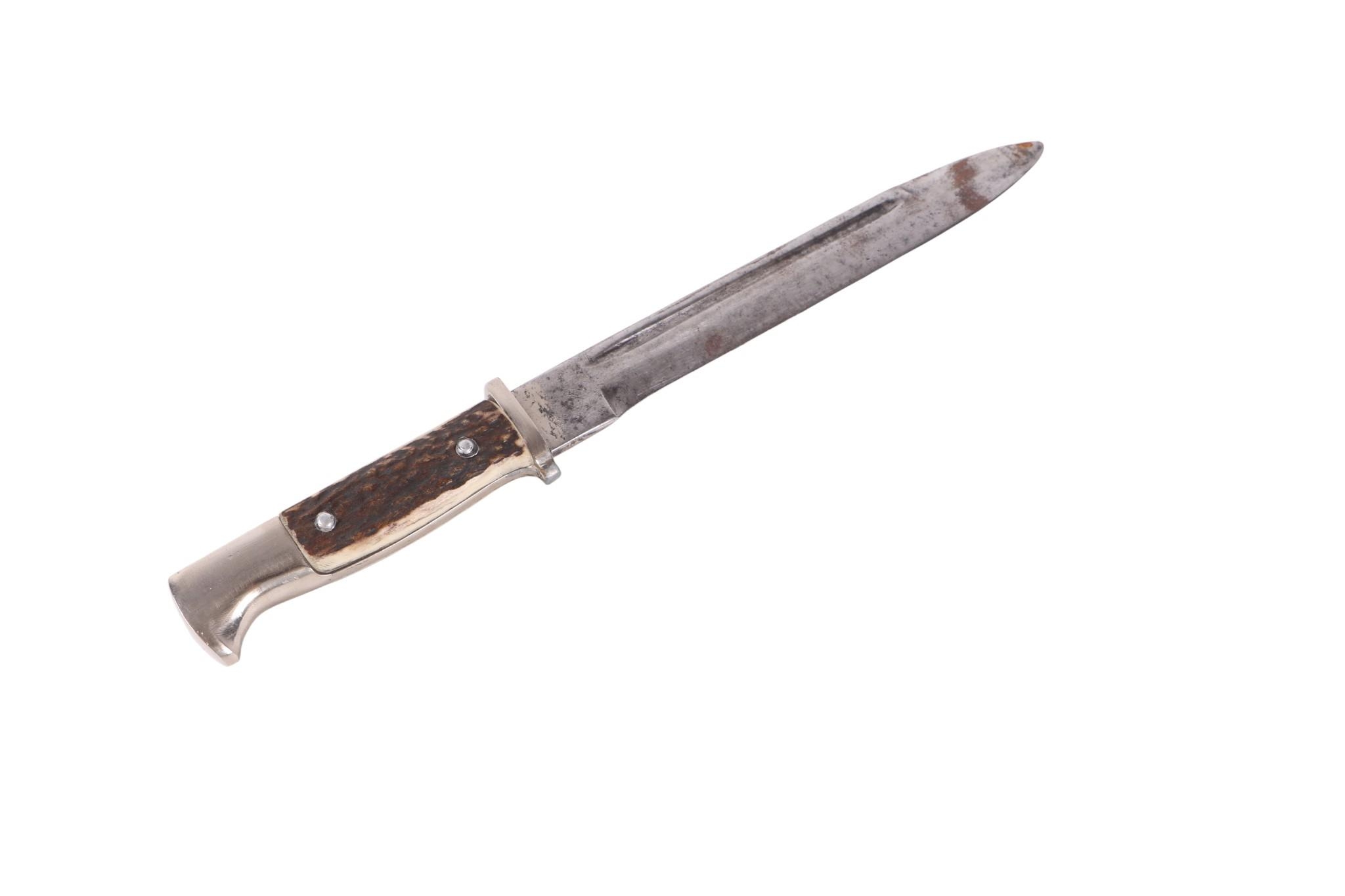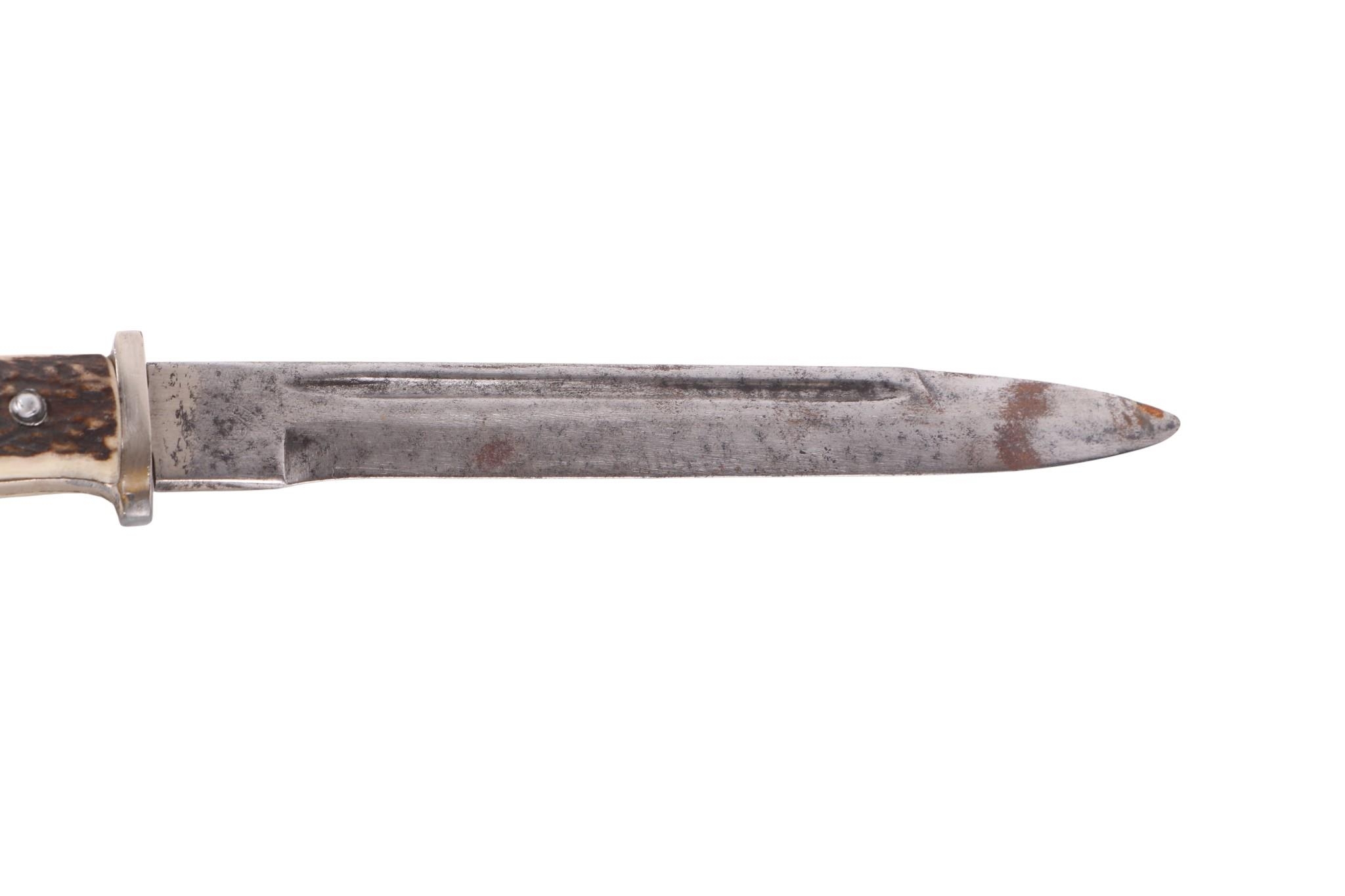 A German parade bayonet with stag horn grips. Indistinct makers mark on the ricasso. Blade length 19cms.