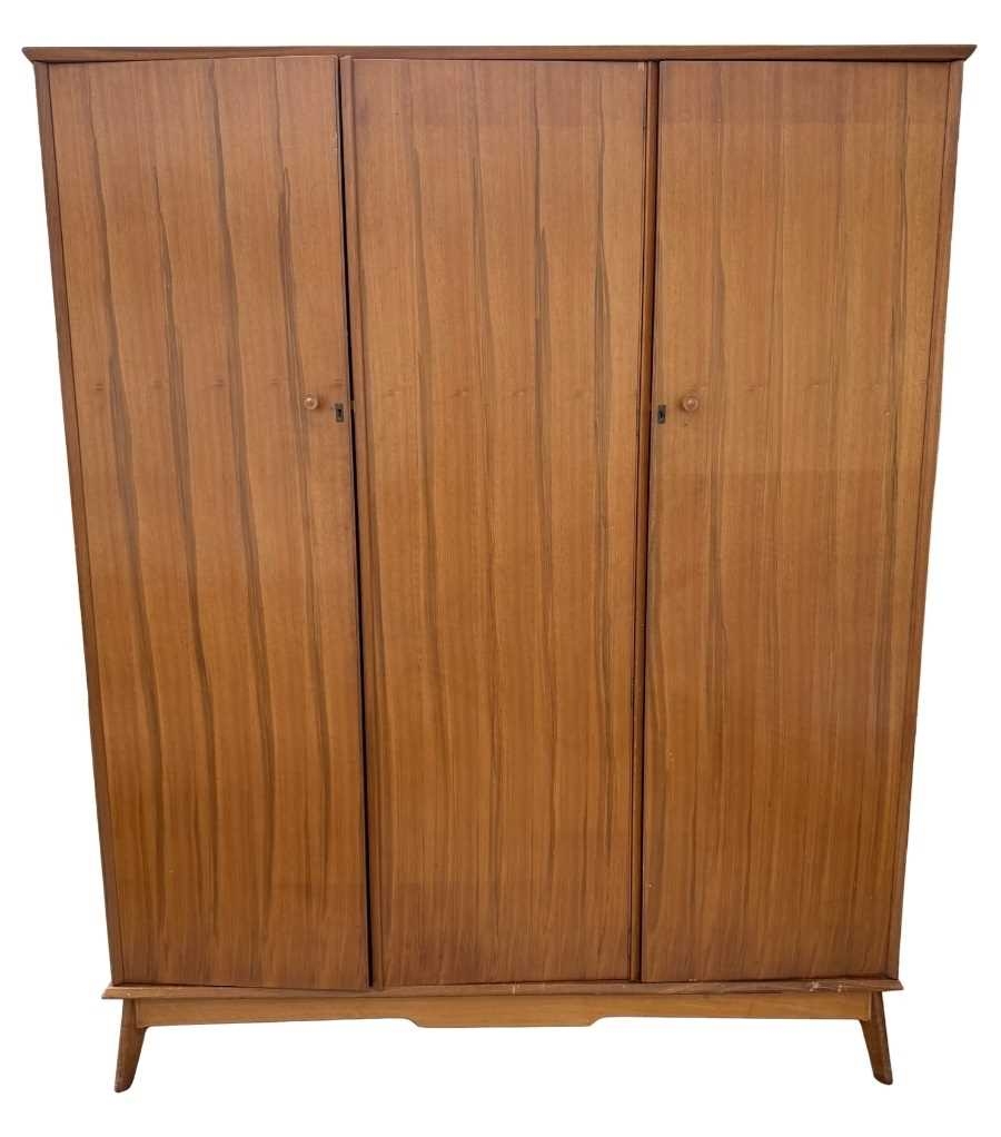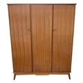 Alfred Cox for AC furniture, a mid-century teak triple wardrobe, c.1950, the end doors with tapered turned handles, the left pair opening to hanging space, the single right opening to six shelves, alternating between open and glass fall fronts with gilt knobs, on a square tapering splayed-leg plinth, size approx; height 190cm, width 160cm, depth 57cm (1)