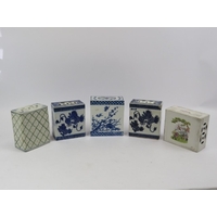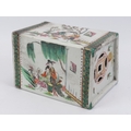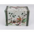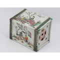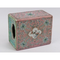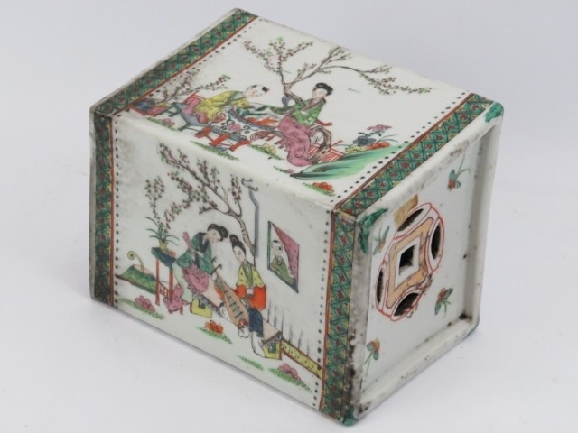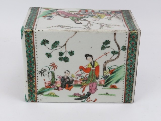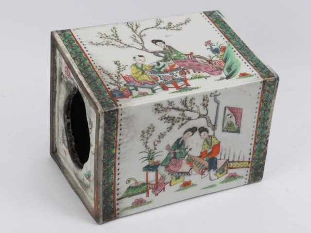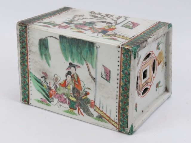 A large Chinese famille verte decorated porcelain pillow, early 20th century. Depicting figures in a garden setting. 20.2 cm length.