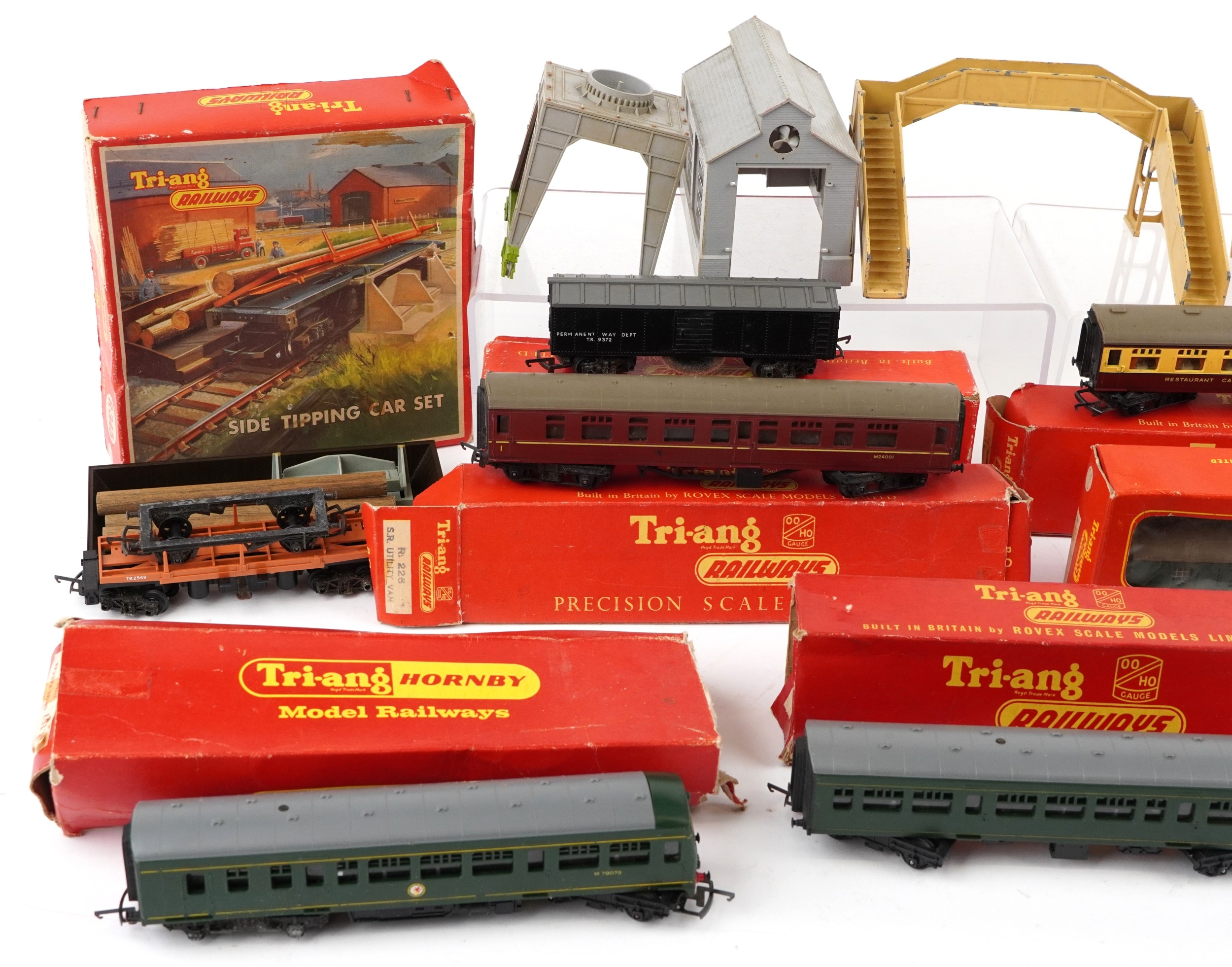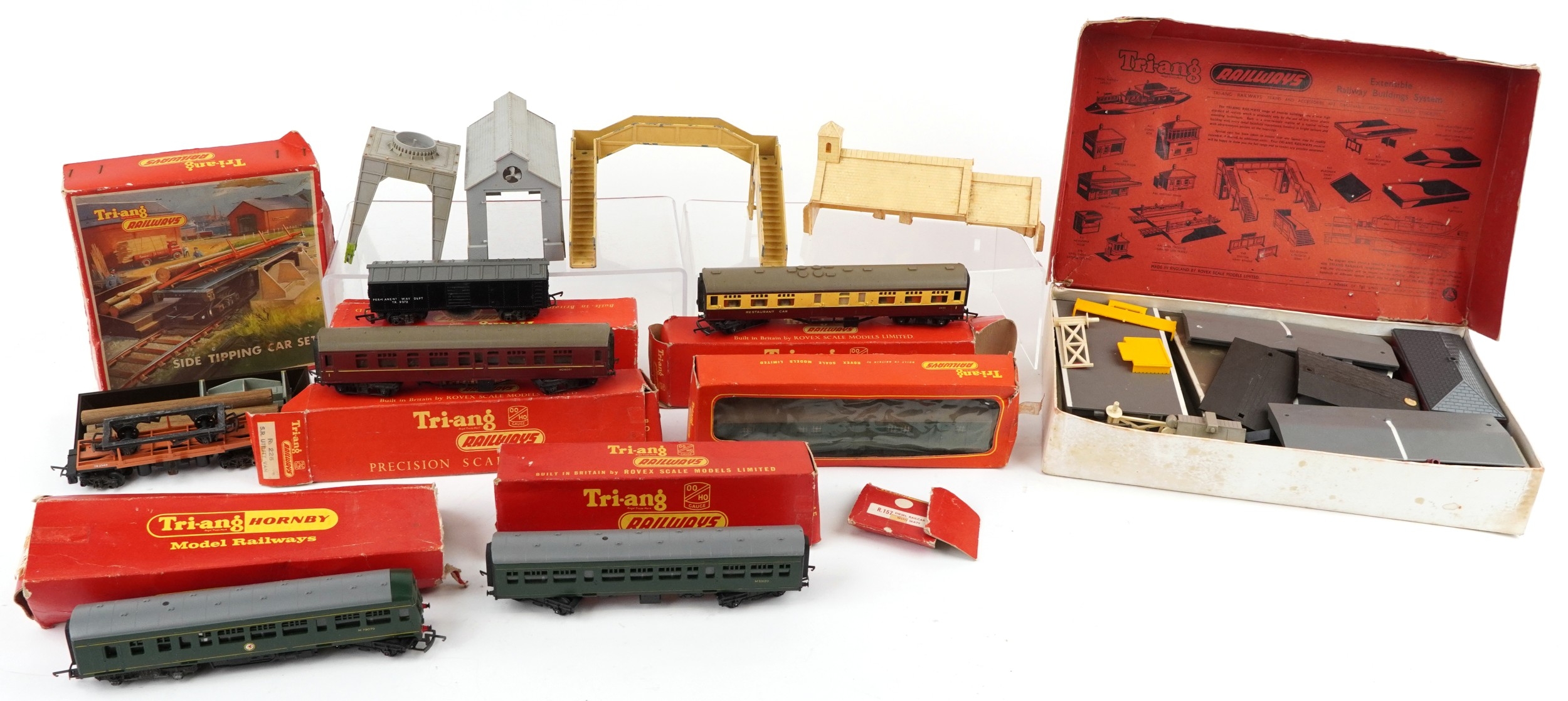 Tri-ang OO gauge model railway carriages, buildings and accessories, some with boxes, including Station Set R81 and Side Tipping Car set R345.