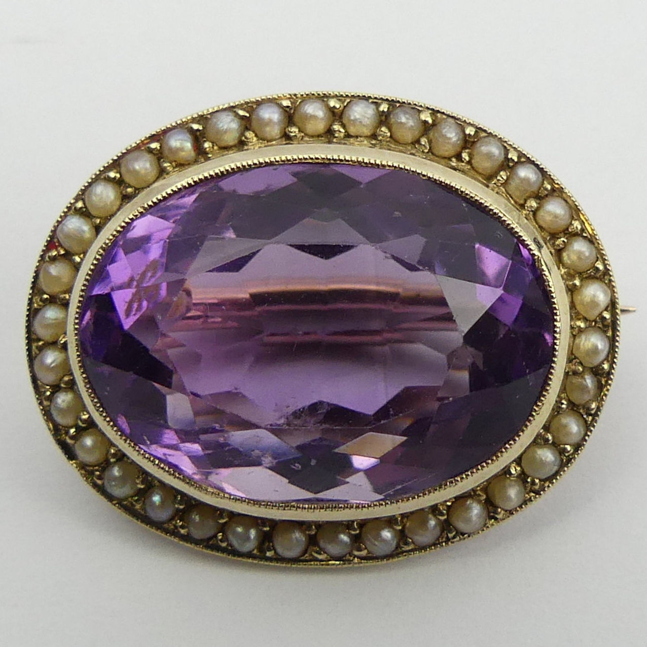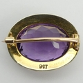 9ct gold amethyst and seed pearl brooch, 5.6 grams, 23 x 18mm. UK Postage £12.