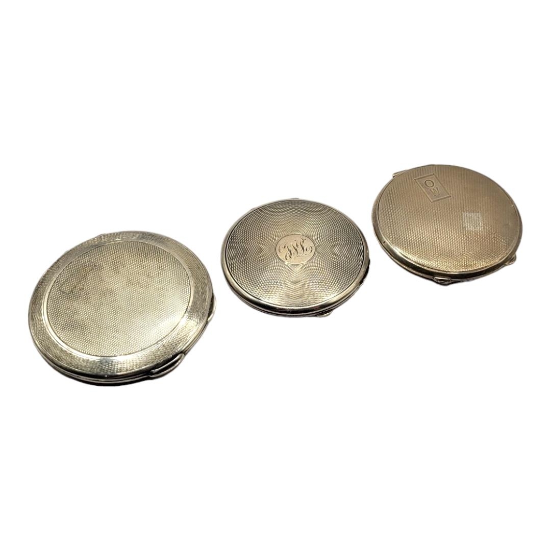 HARRODS LTD, AN ART DECO MIRRORED SILVER COMPACT, HALLMARKED LONDON 1939. TOGETHER WITH TWO OTHER ART DECO SILVER COMPACTS