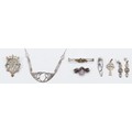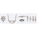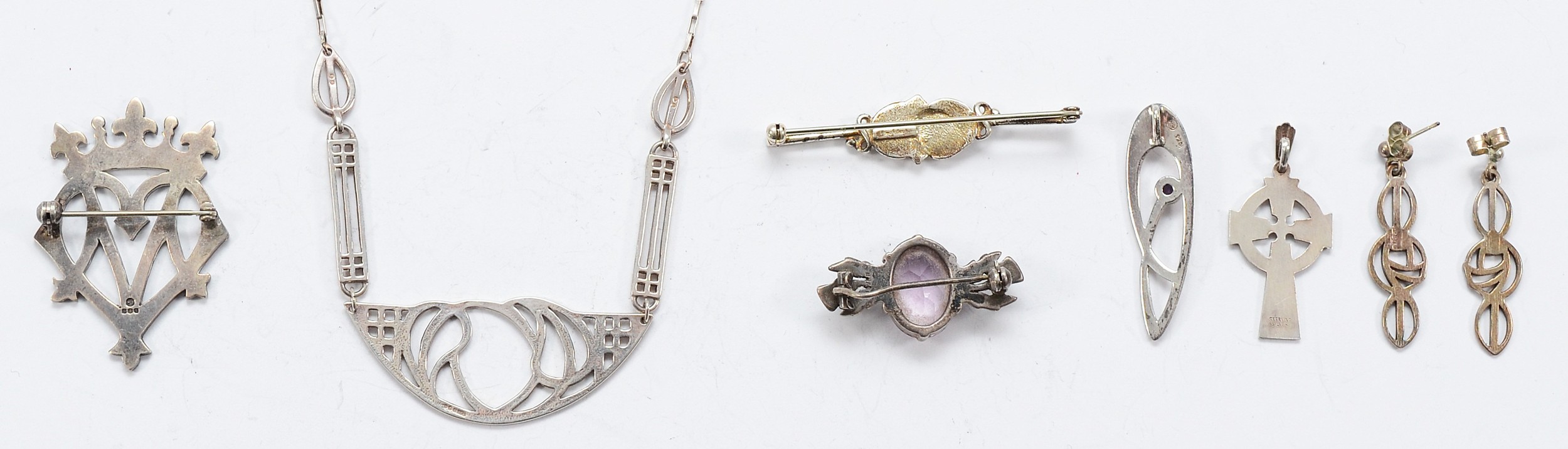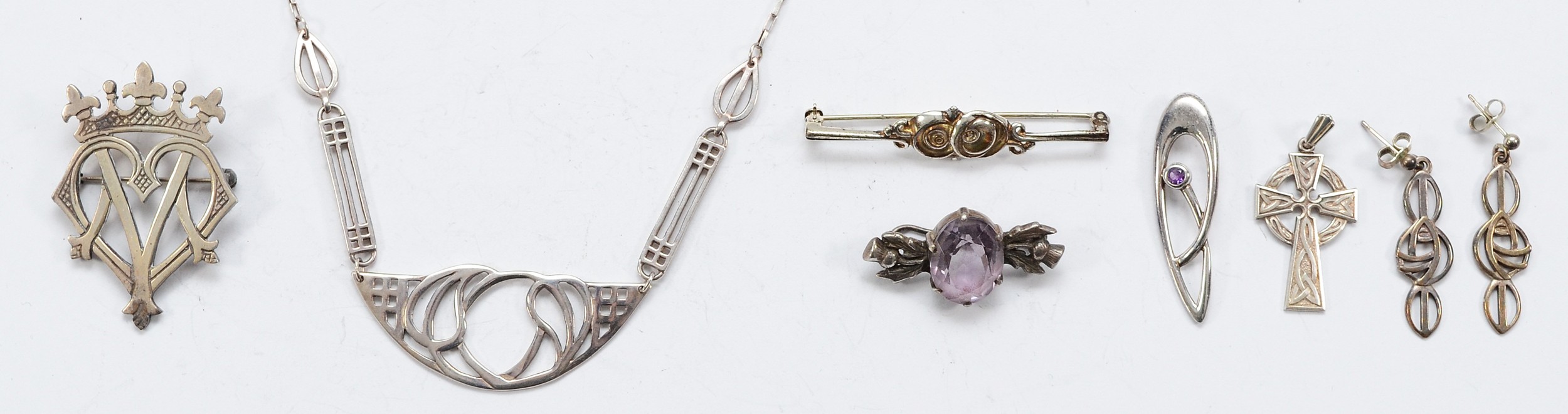 Ola Gorie, a silver brooch, Malcolm Gray, a Scottish silver Luckenbooth brooch and a 925 silver pendant, a silver Celtic necklace, a pair of 925 silver earrings, a sterling silver cross pendant and an unmarked silver gemset brooch, 38g