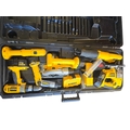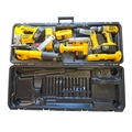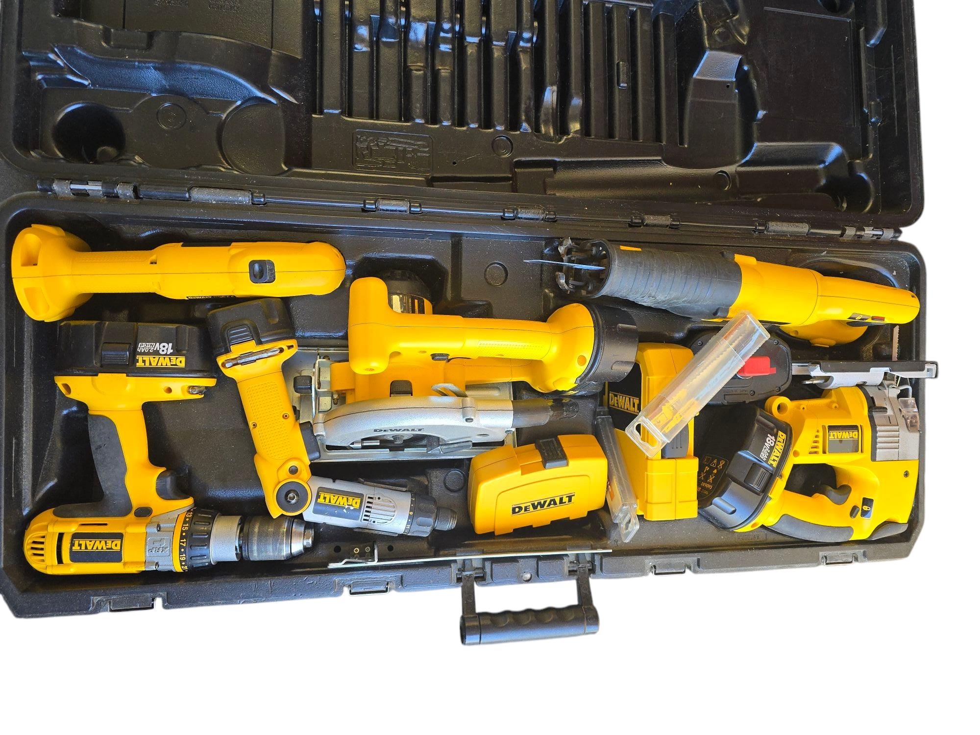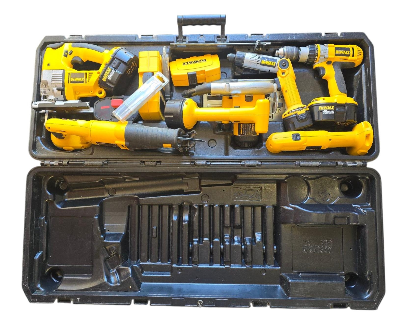 Assorted DeWalt tools including screwdriver DW920 type 1; drill DW960-XJ type 1; drill DW988 type 10, drill bits, and other accessories within a DeWalt case.