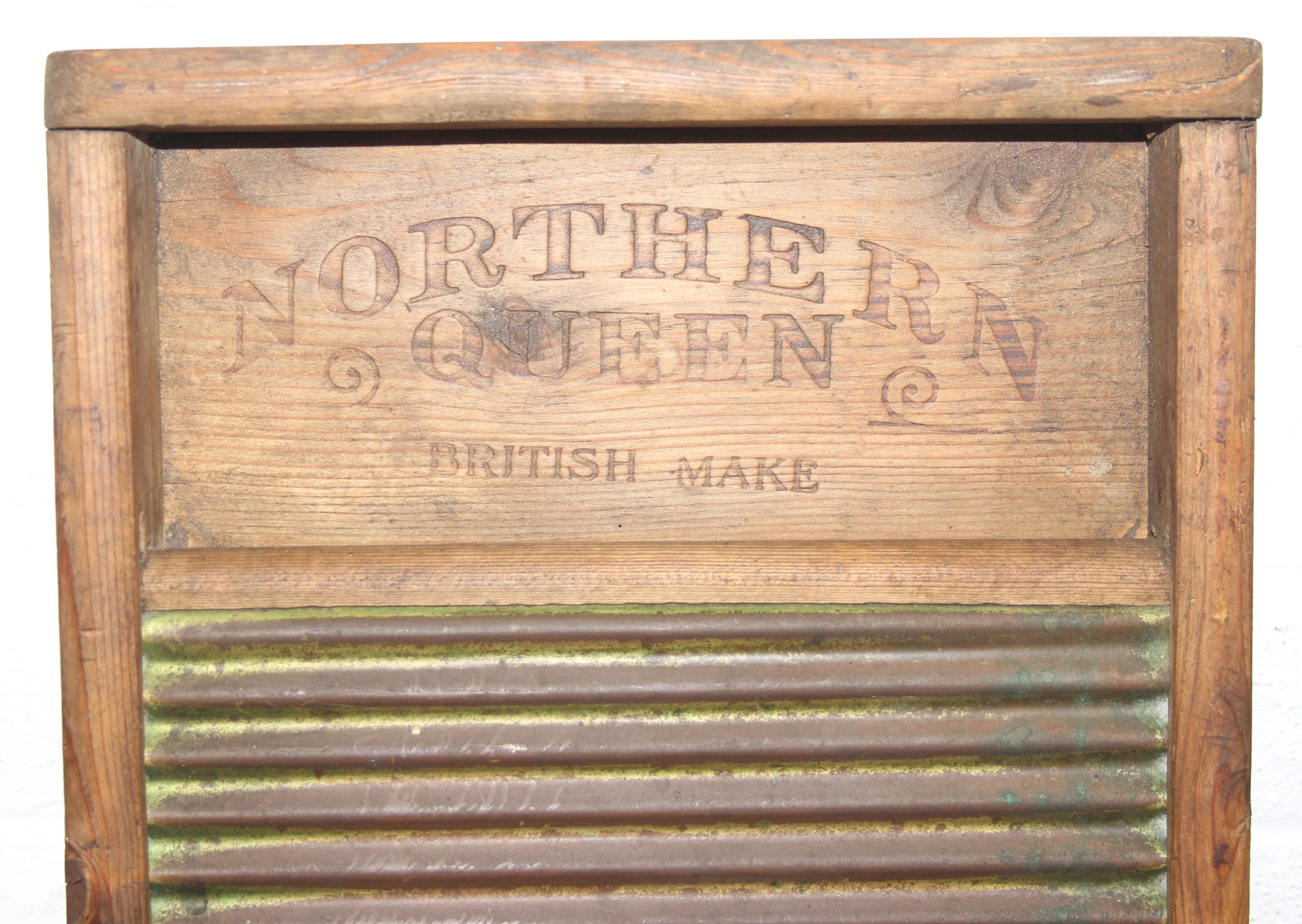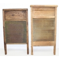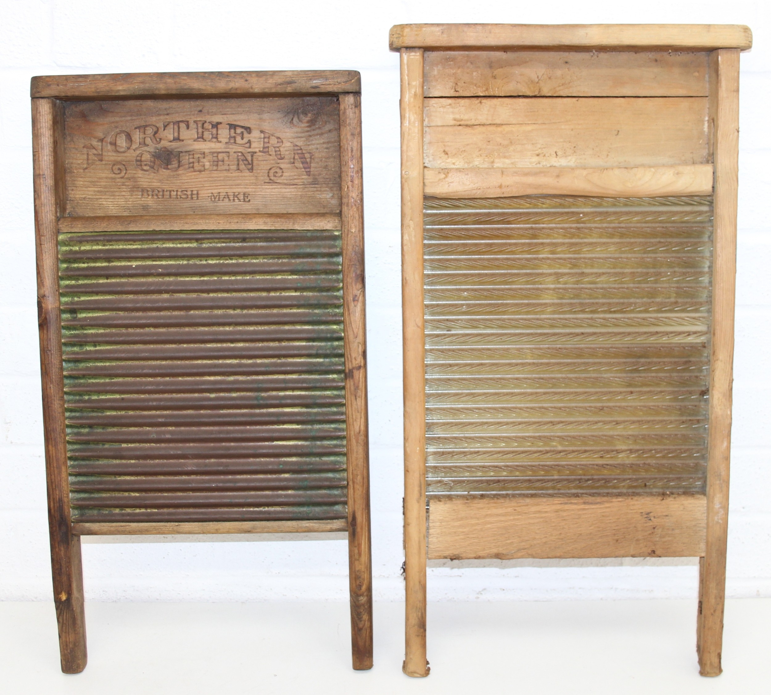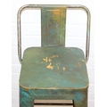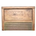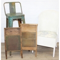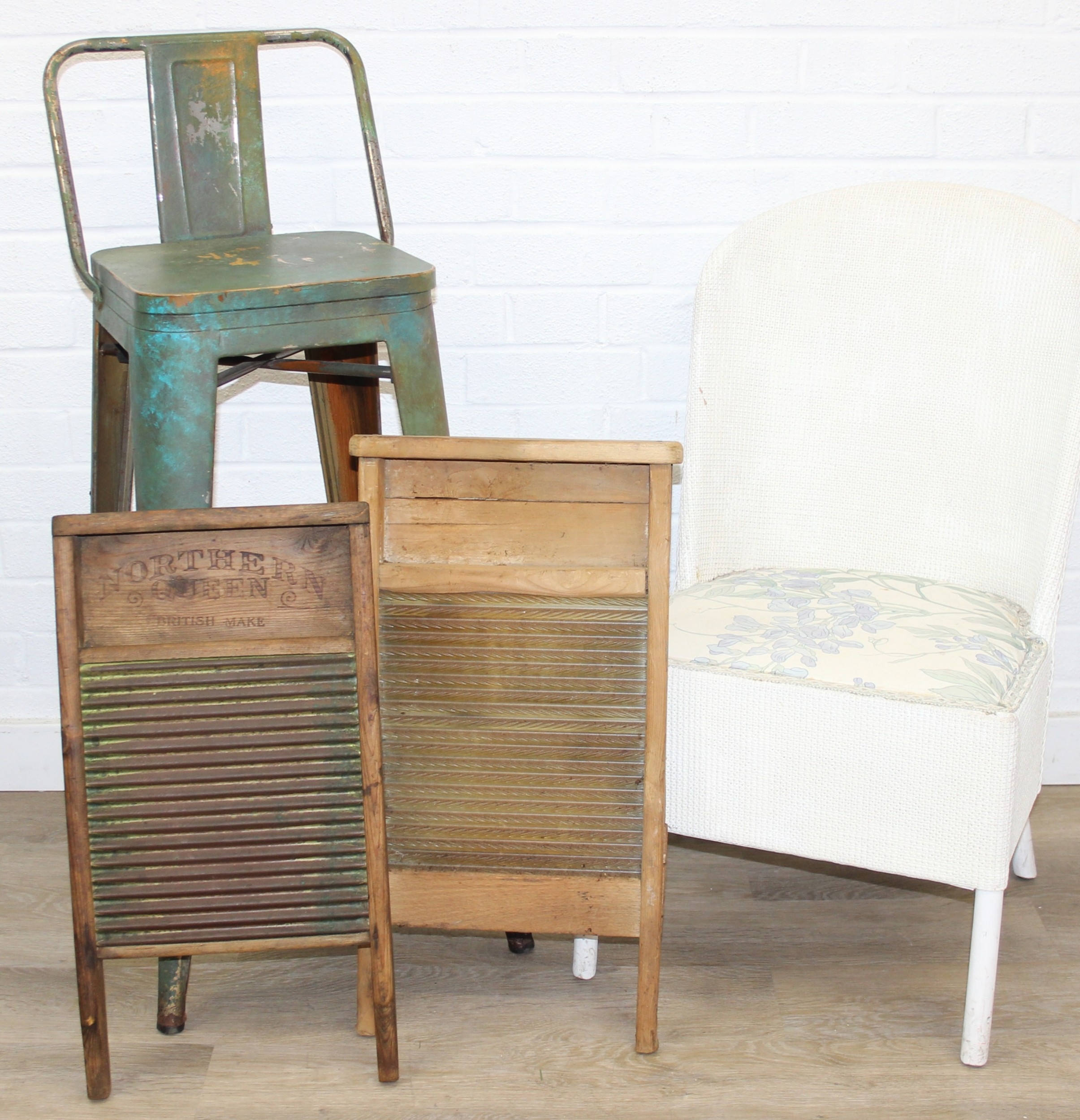 Four items of vintage furniture or woodenware to inc a green painted industrial style stool, a Lloyd Loom style low chair and two wooden framed washboards, one with advertising, the stool 100cm tall [4]