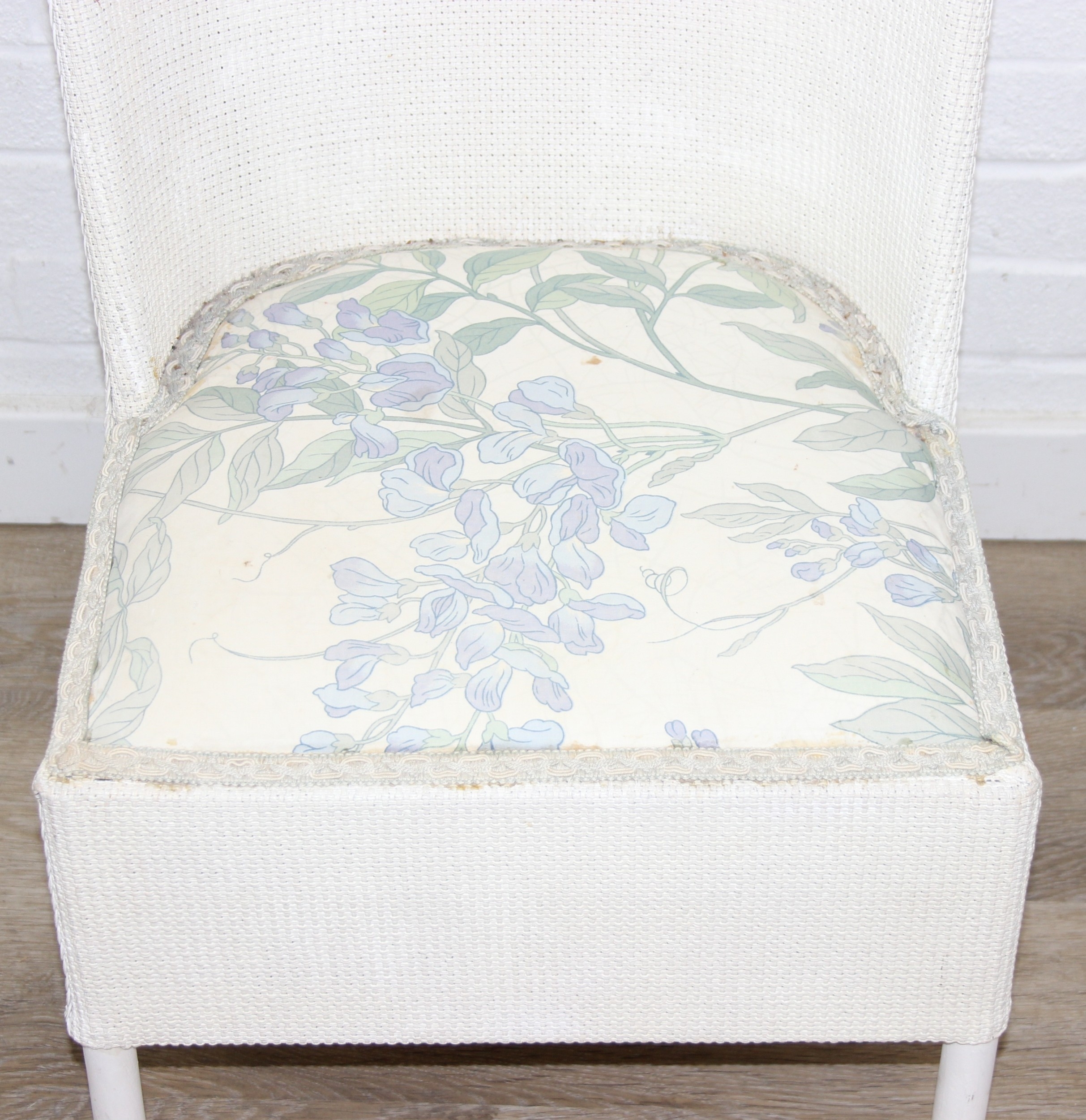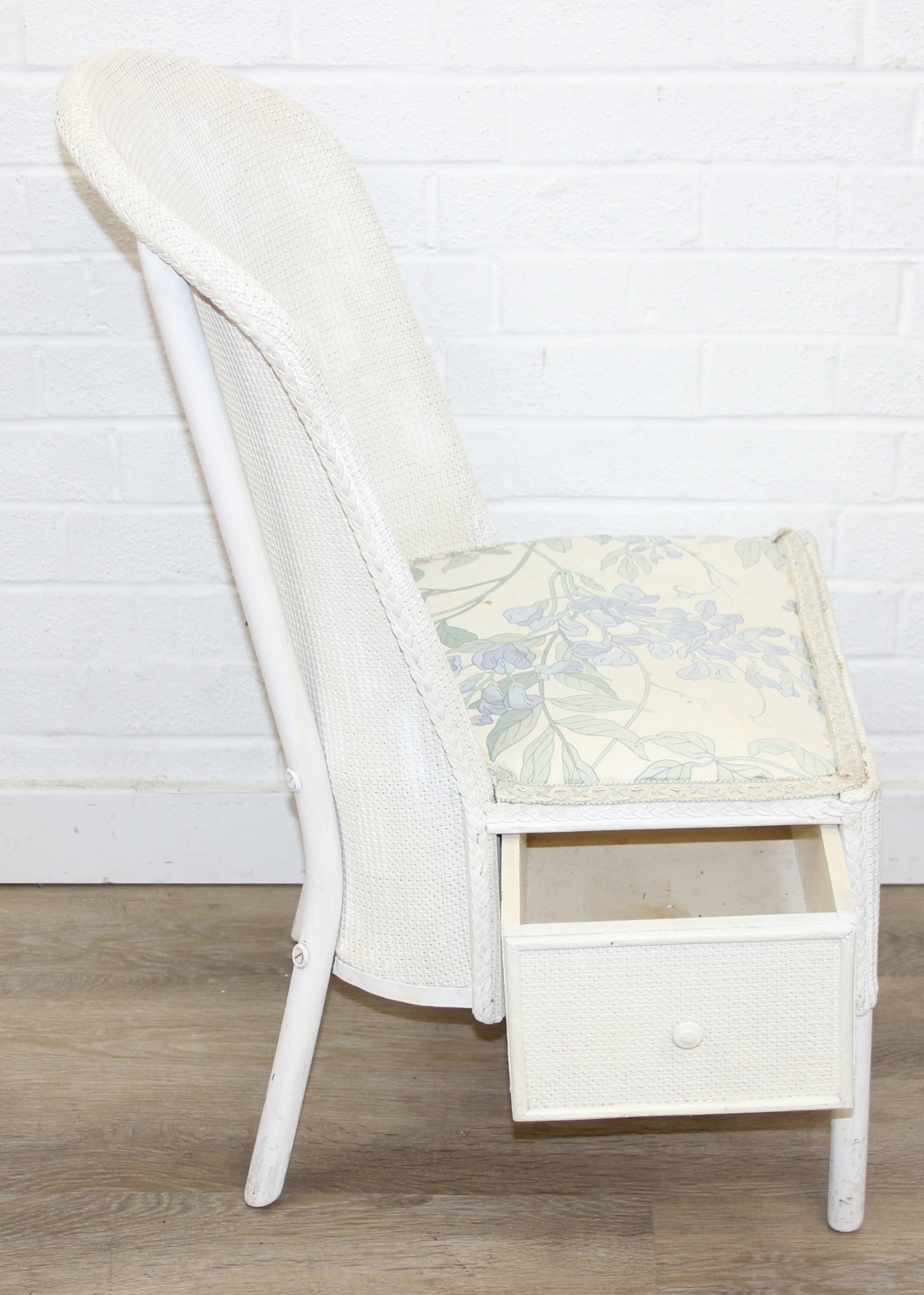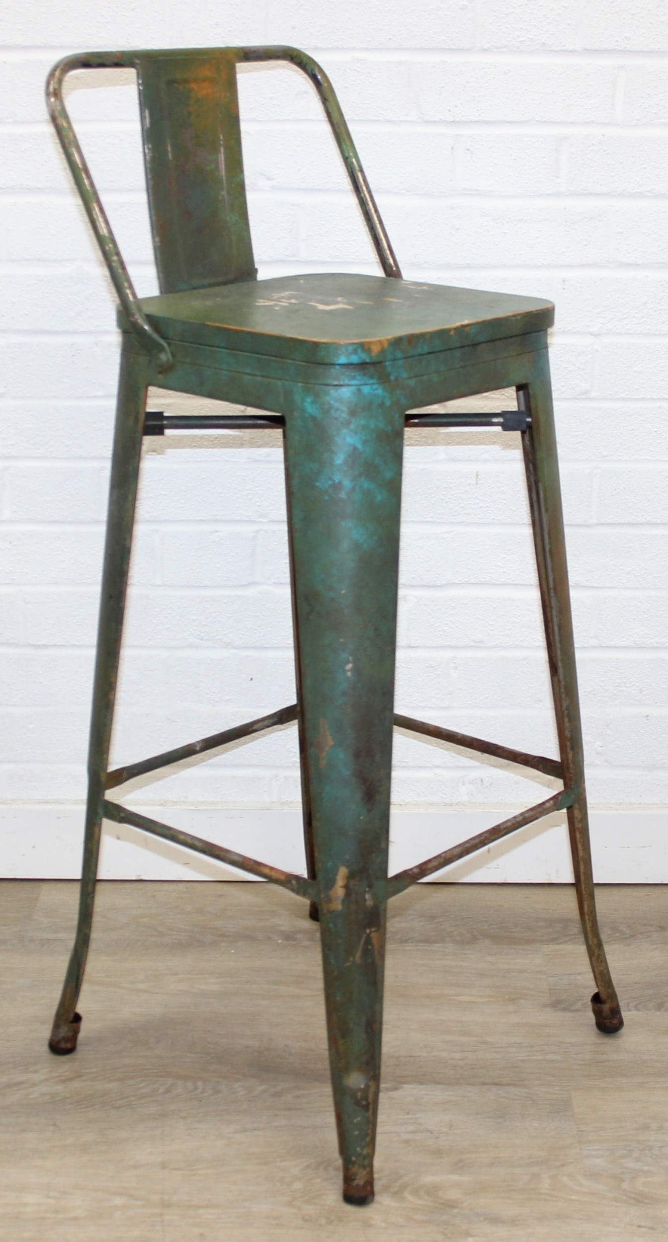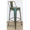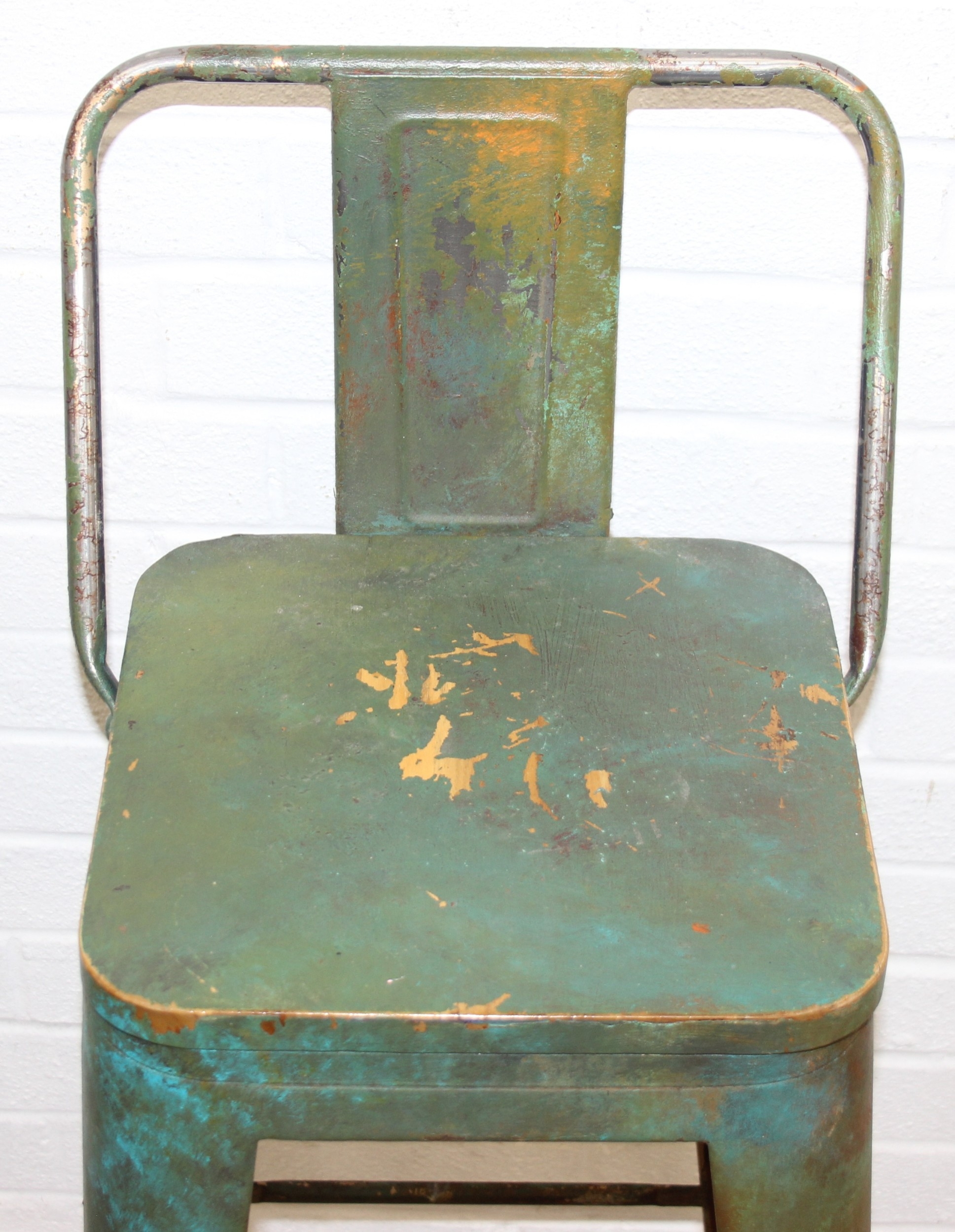 Four items of vintage furniture or woodenware to inc a green painted industrial style stool, a Lloyd Loom style low chair and two wooden framed washboards, one with advertising, the stool 100cm tall [4]
