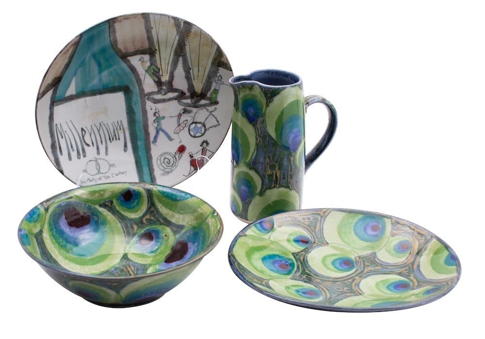 Dartington Pottery four stoneware pieces comprising a plate, dish and jug with peacock decoration together with a limited edition millennium party plate, largest dish 34cm long, impressed marks.