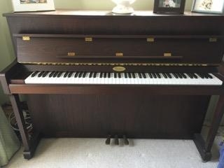 Kemble (c1996) An upright piano in a traditional satin mahogany case; together with a matching stool.