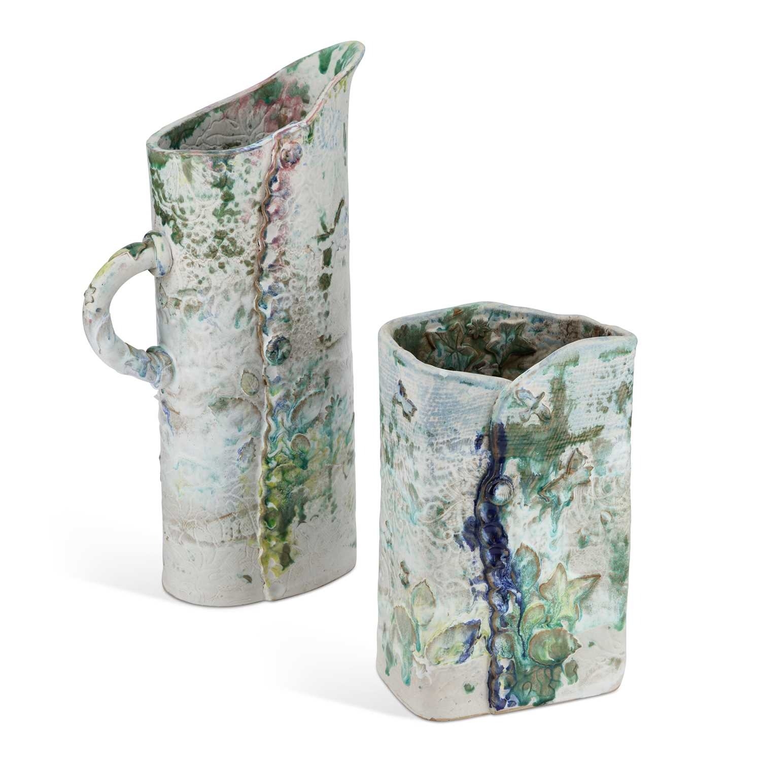 each modelled with flowers, leaves and butterflies, labelled. (2) Jug 44cm high