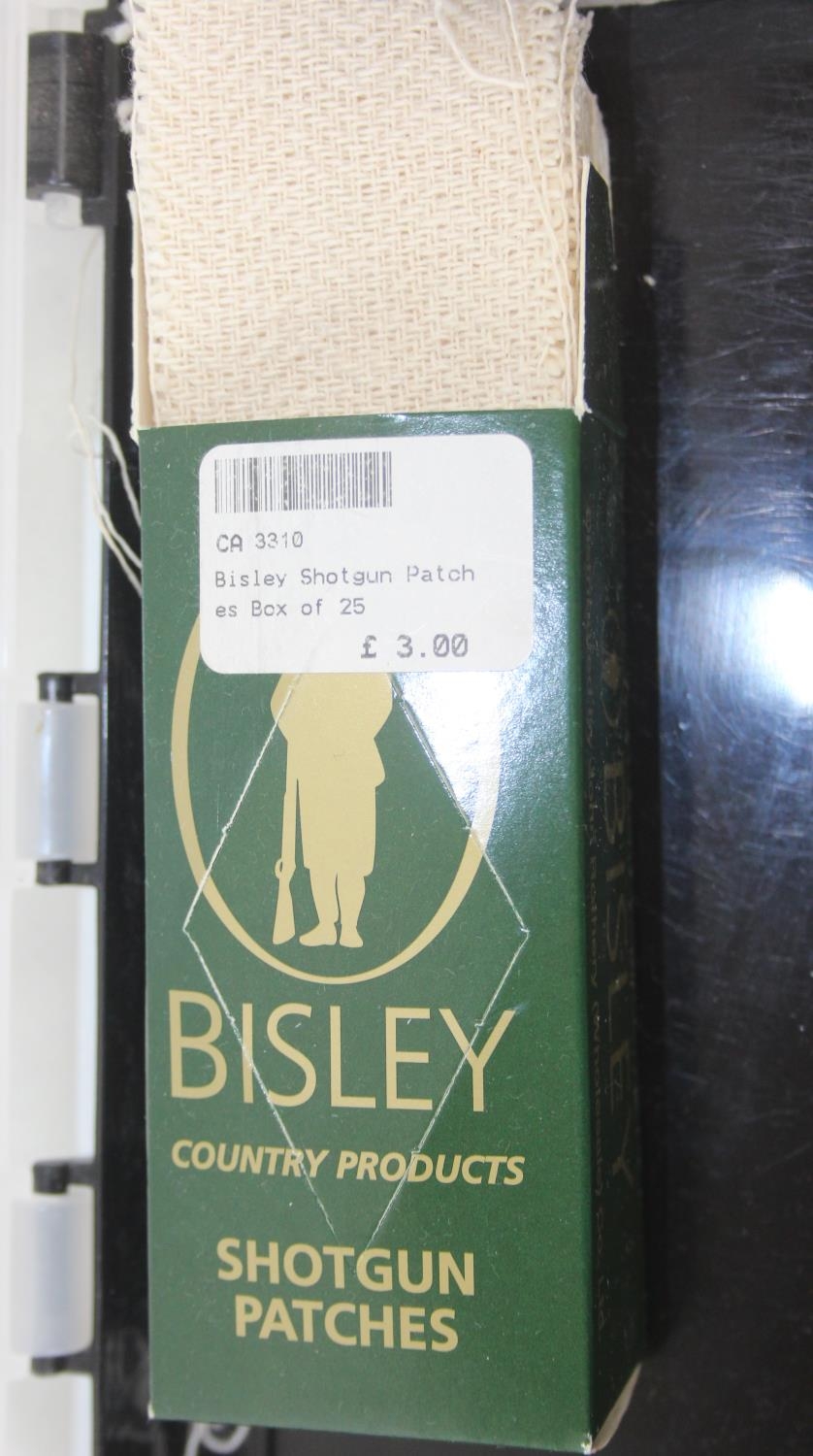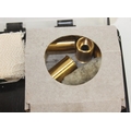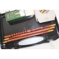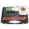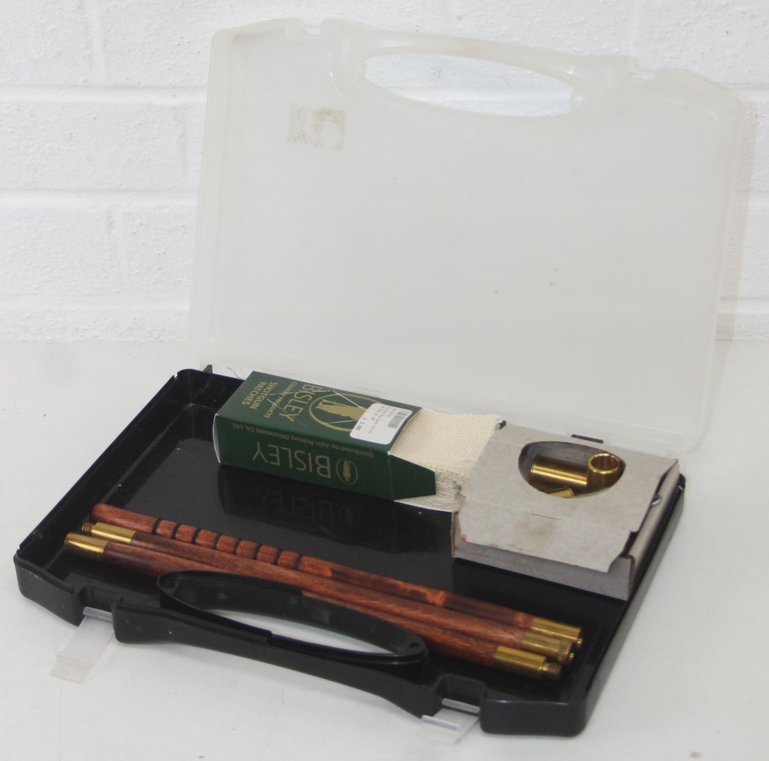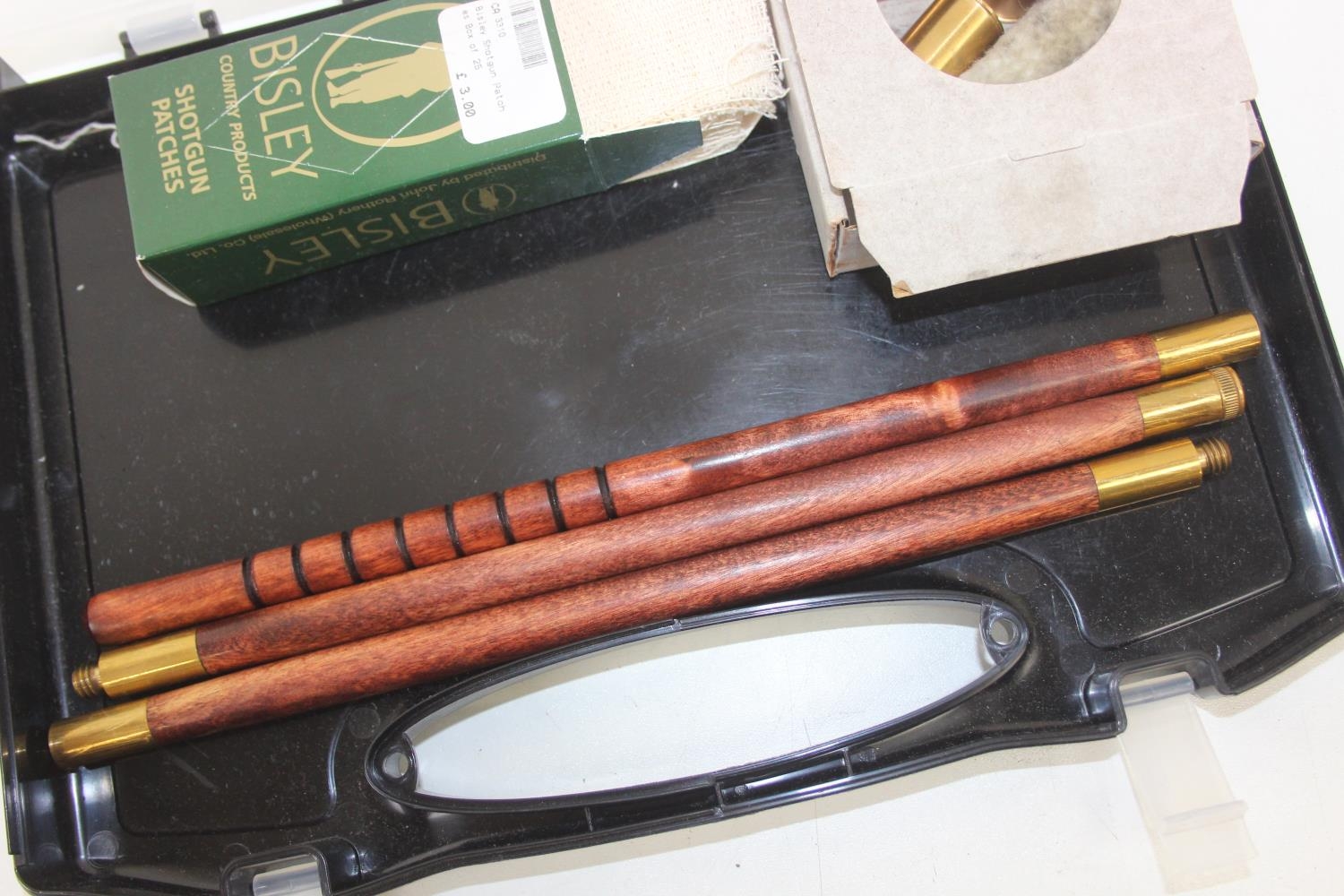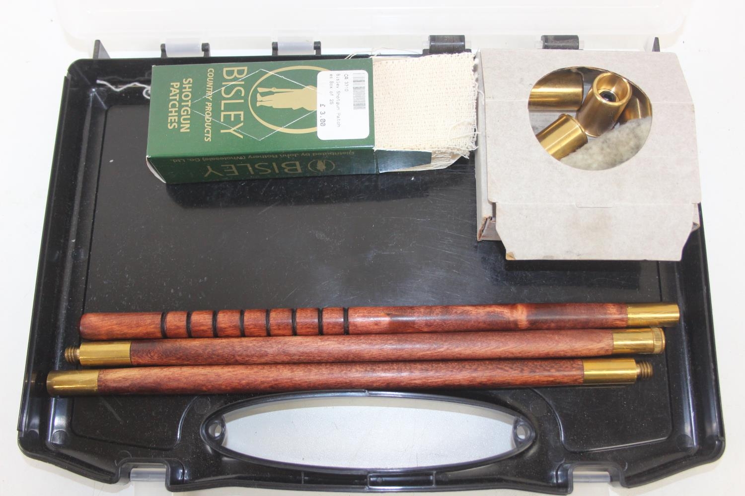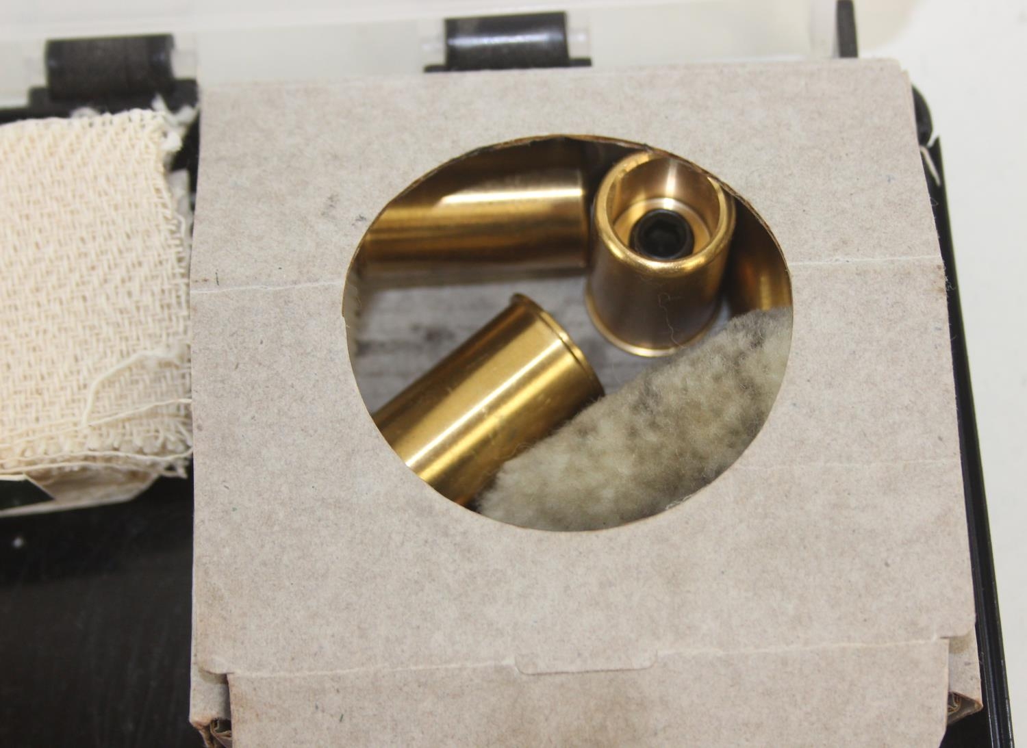 Wooden and brass shotgun cleaning kit in plastic carry case