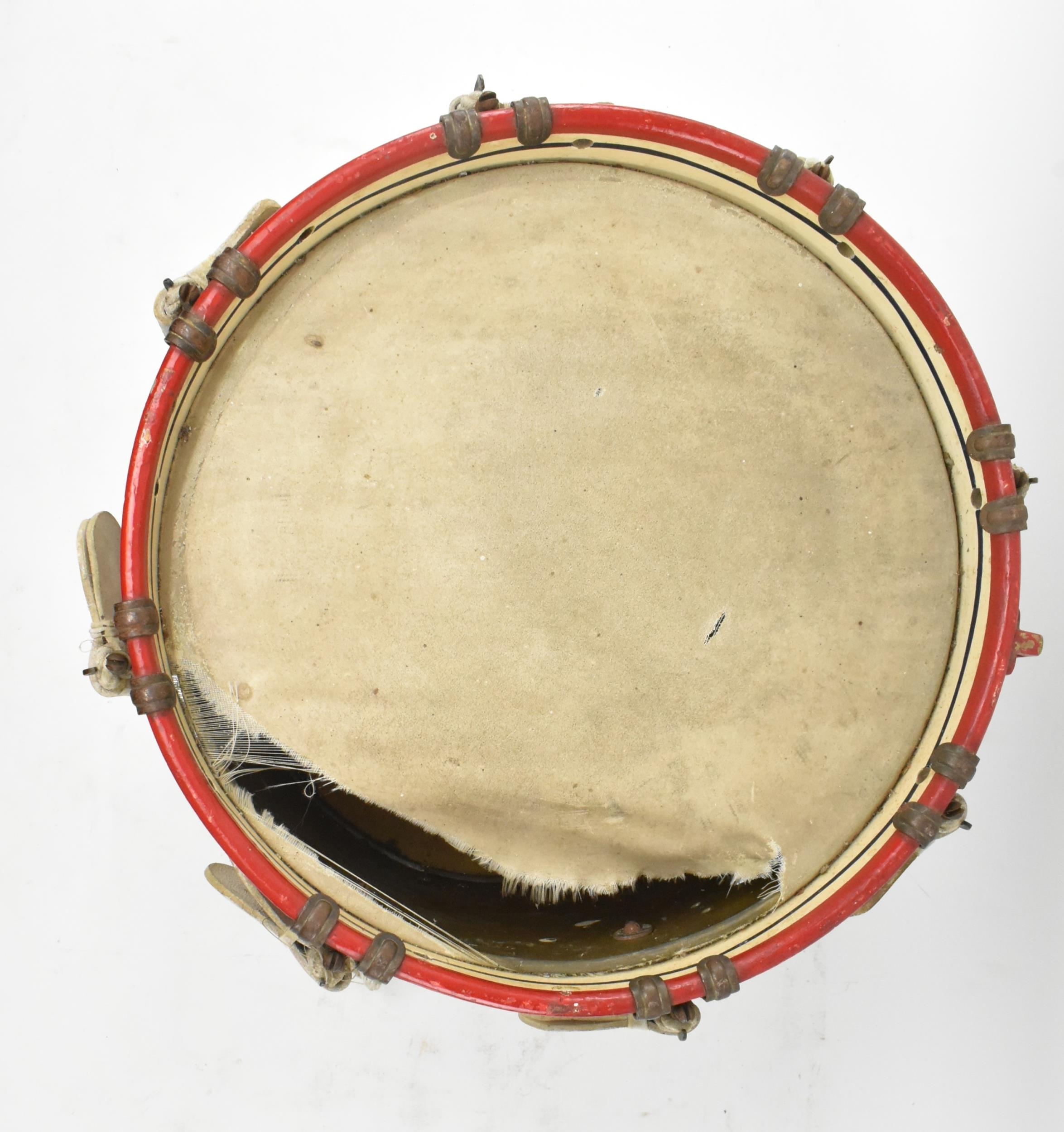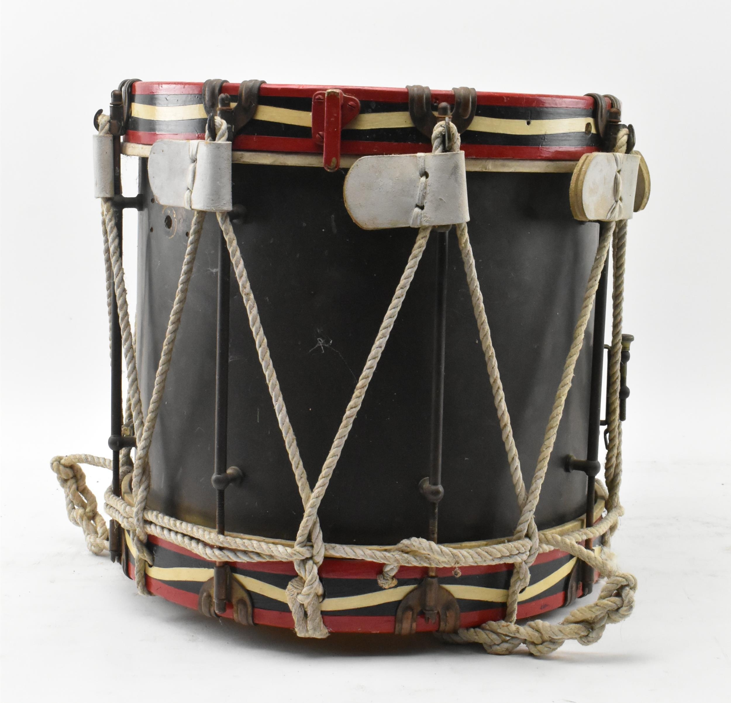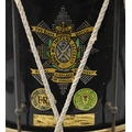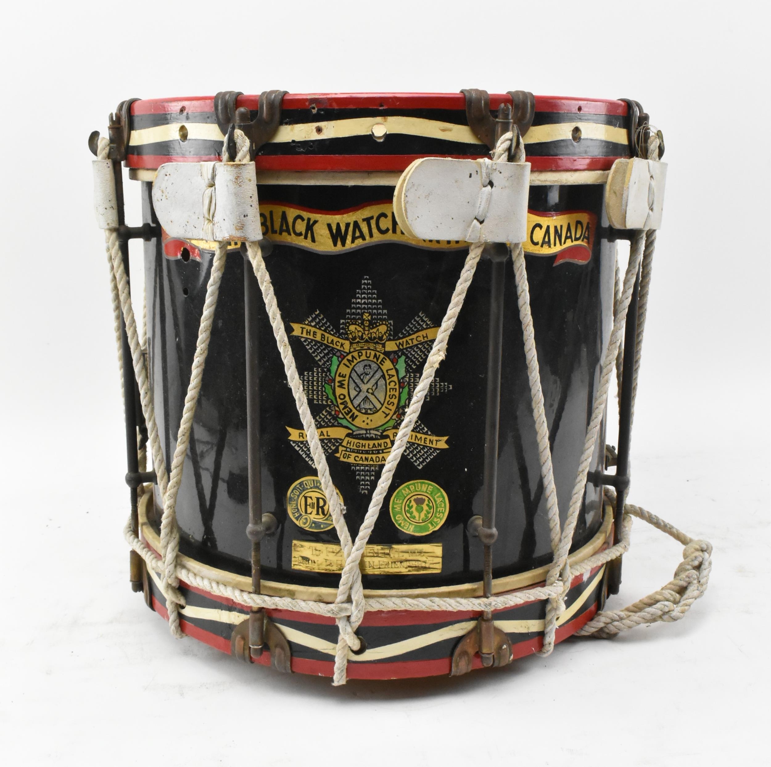 A 2nd Battalion, The Black Watch (Royal Highland Regiment) of Canada, CASF regimental drum. The drum having a ' Memo Me Impune Lacessit ' medal crest painted to front. Dedicated brass plaque to base. Tear to the batter head. Measures approx. 40cm tall x 37cm in diameter.
