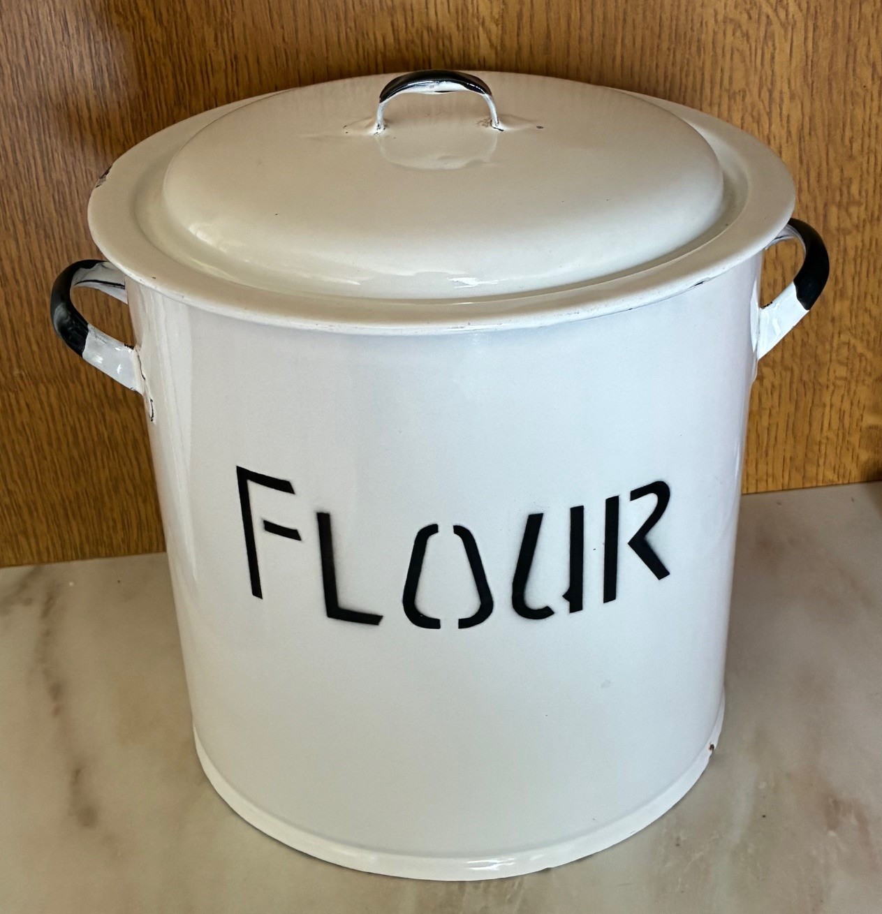 Vintage enamel FLOUR bin with lid, 22cm high.