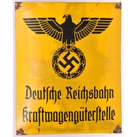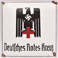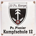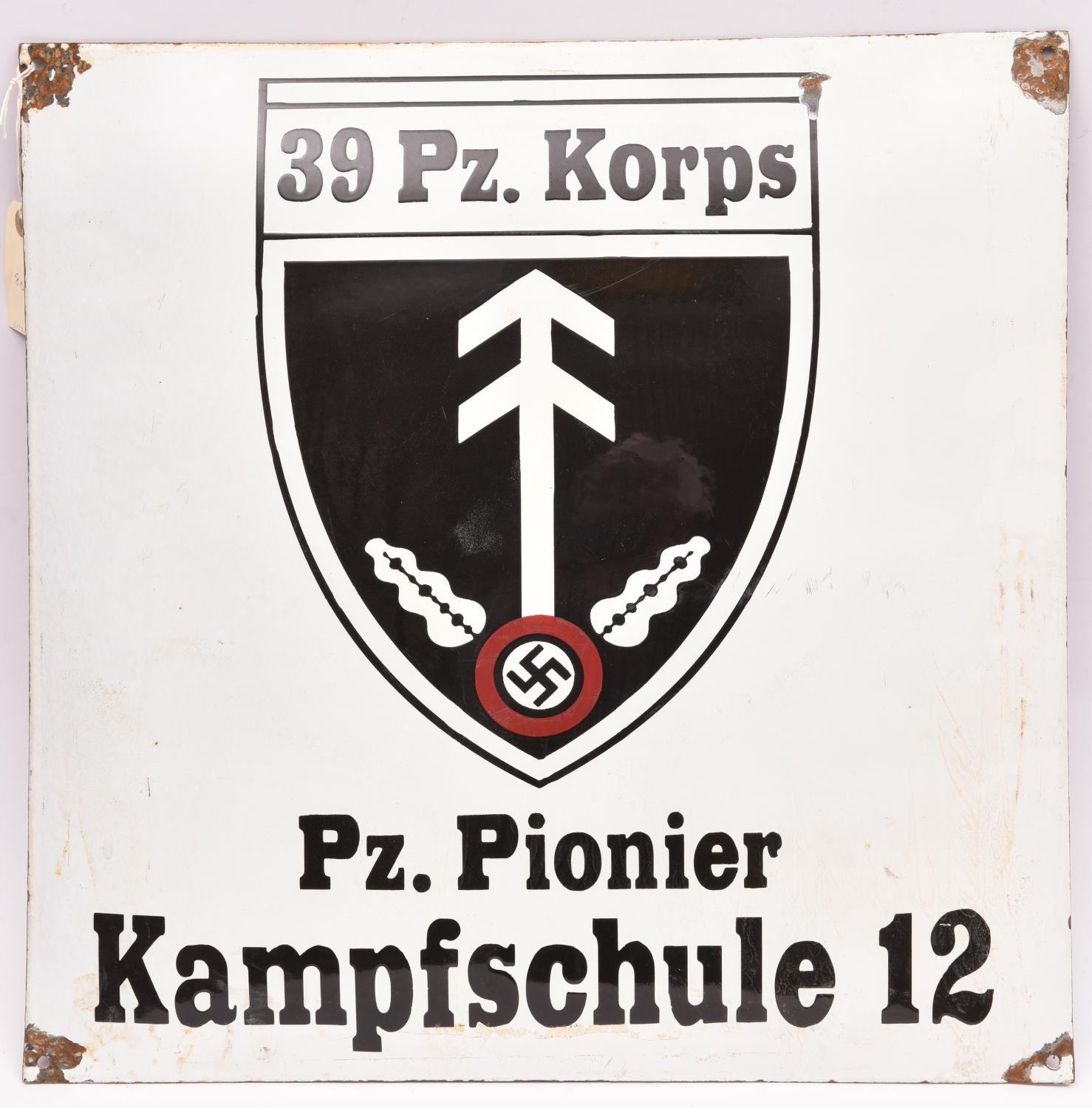 A black on white enamelled sign, bearing shield badge of “39 Pz Korps” and “Pz Pionier Kampfschule 12”, 20" x 20", GC (enamel chipped around the corner screw holes). £50-60