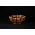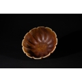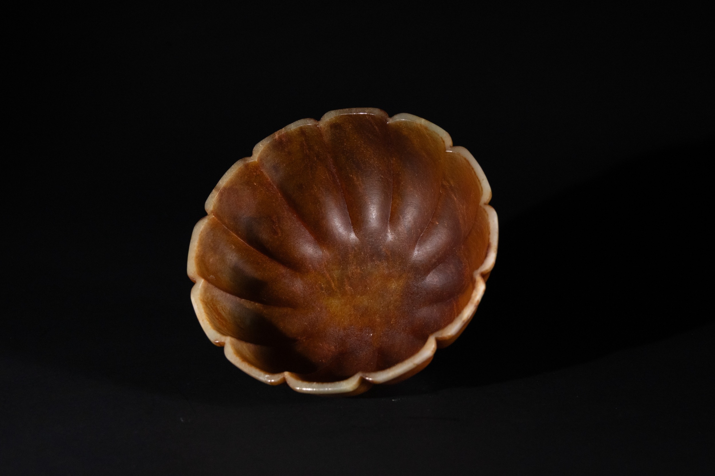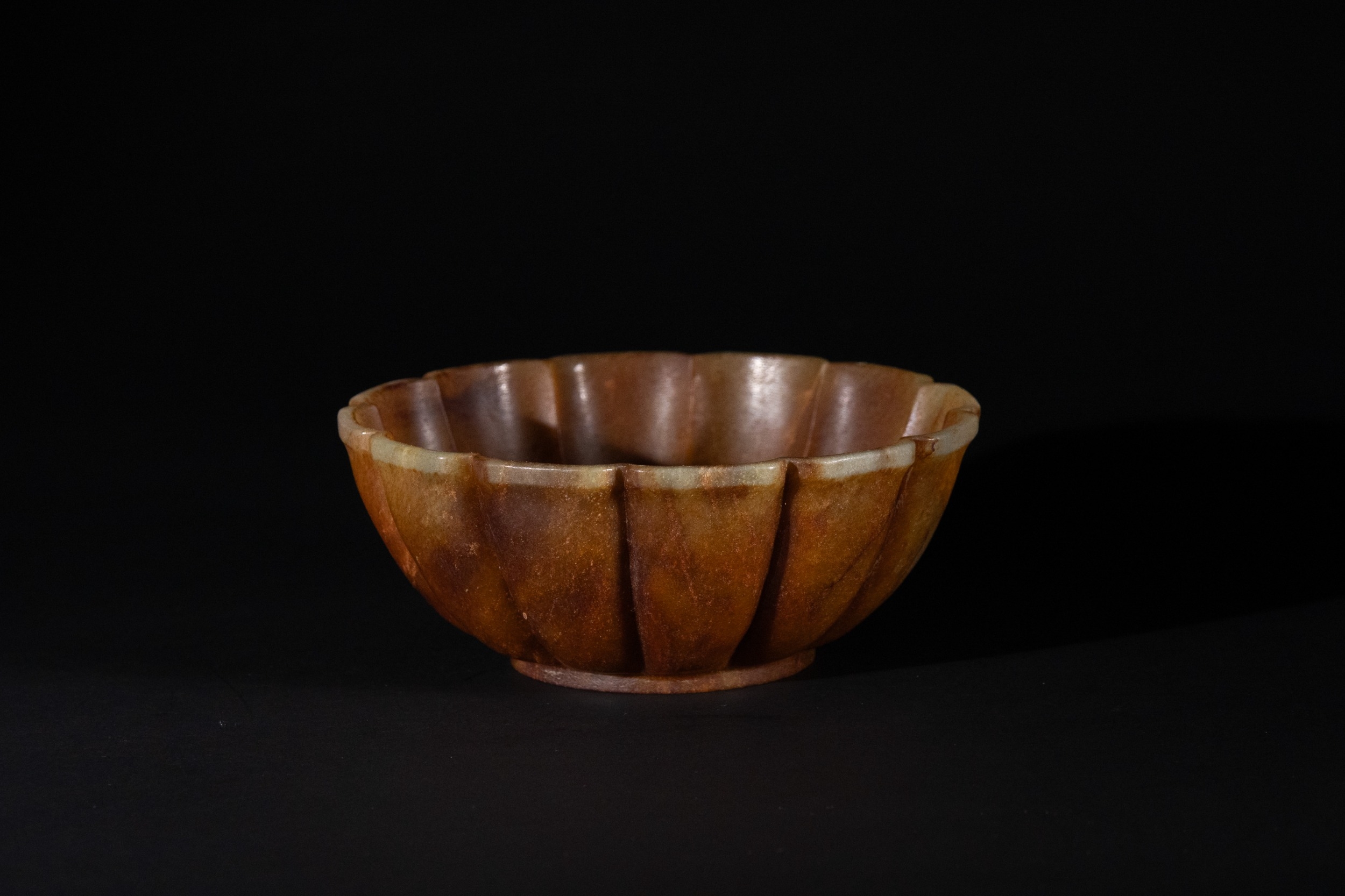 A Chinese Jade Lobed Melon-Form Bowl, 20th Century - A lobed bowl carved from jade displaying a spectrum of earthy tones including brown, amber, and areas of lighter celadon or grey. The object features a fluted, melon-form body with an undulating, scalloped rim, consistent with a lobed foliate rim form. The surface appears polished, and the item presents with a natural patina and inherent stone variations.