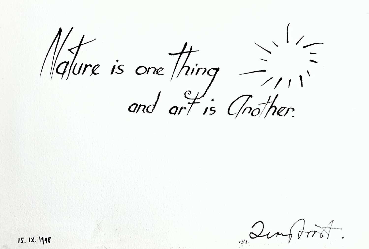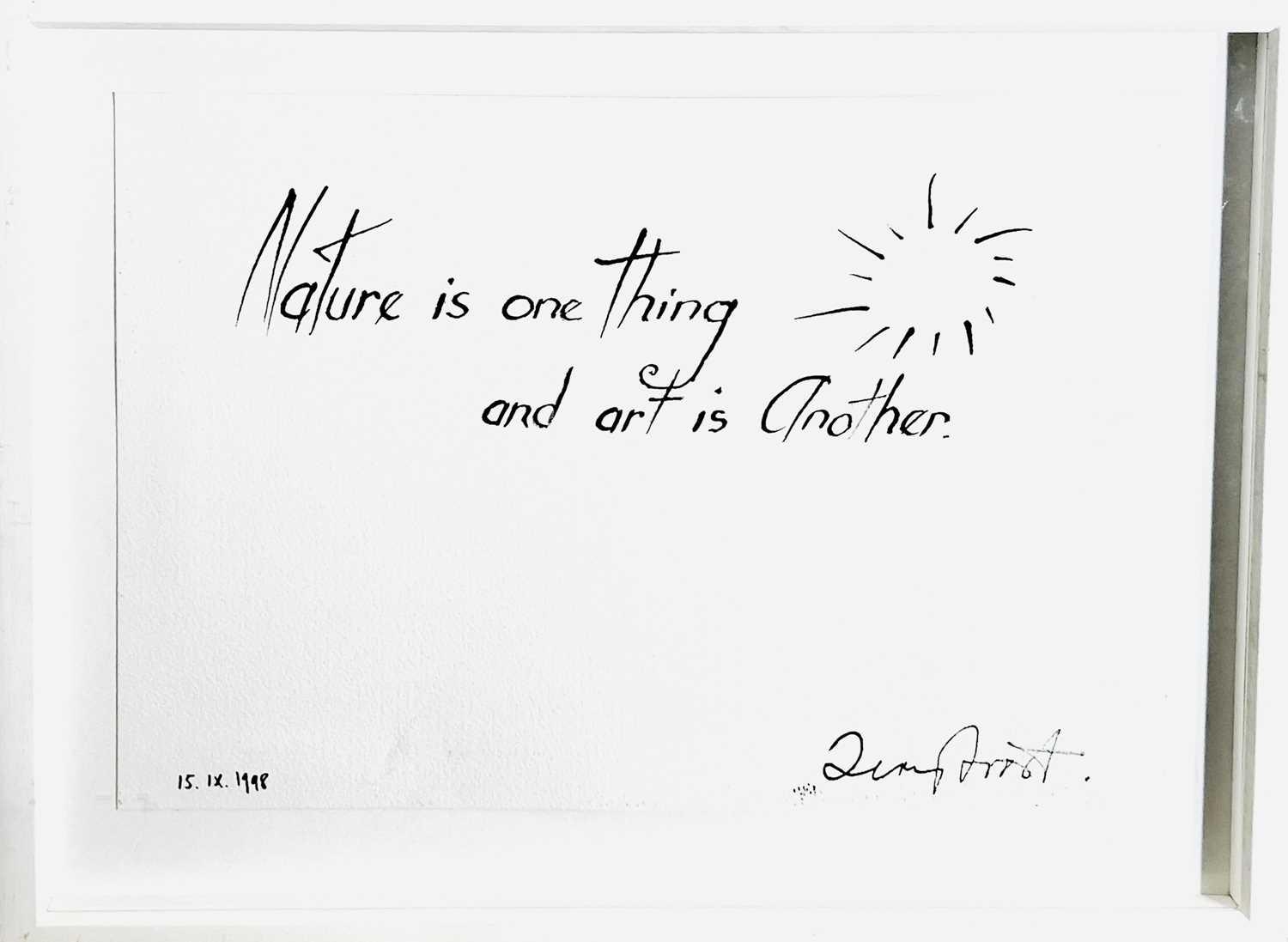 Sir Terry FROST (1915-2003) Nature is one thing and art is another... Ink on paper Signed and dated 1998 Paper size 29 x 41.5cm 'Terry and I had a conversation about his ‘process’ of painting, about trying to capture the feeling/ emotion of the experience rather than representing it, even in an abstract way - and this was something he quoted and attributed to Roger Hilton. After coffee in the house, we went back to the garden studio, and whilst I was selecting work for the gallery, he took a bamboo ‘stylus’, from the garden, sharpened the end, and wrote out the quote and signed it.' Ron Howell