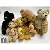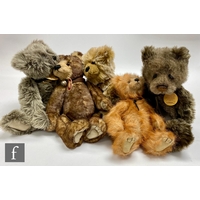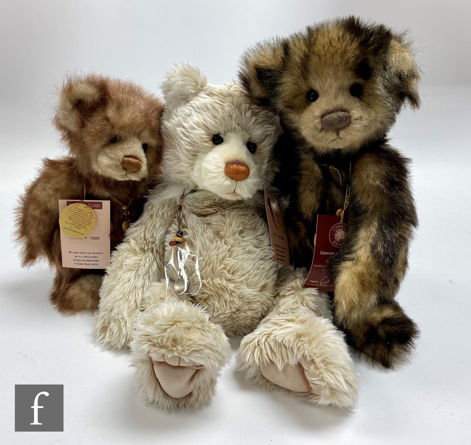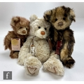 Three Charlie Bears teddy bears, Porridge (CB125091), QVC exclusive from the Four Seasons set, limited edition 81 of 4000), plumo with beige plush and cream mohair, height 43cm, and Rhubarb (CB194403A) and Crumble (CB194403B) pair of teddy bears, limited edition 2436 of 7000, each in mink plush with dark taps and magnetised paws to hold hands, all with swing tags and certificates. (3)