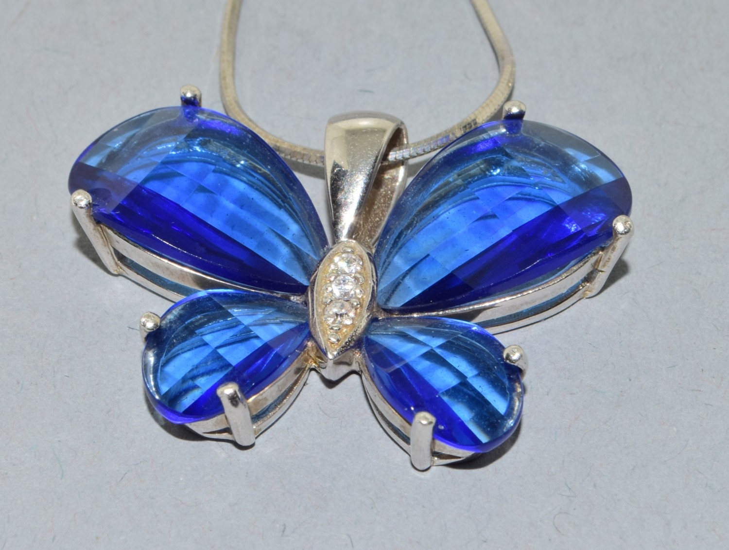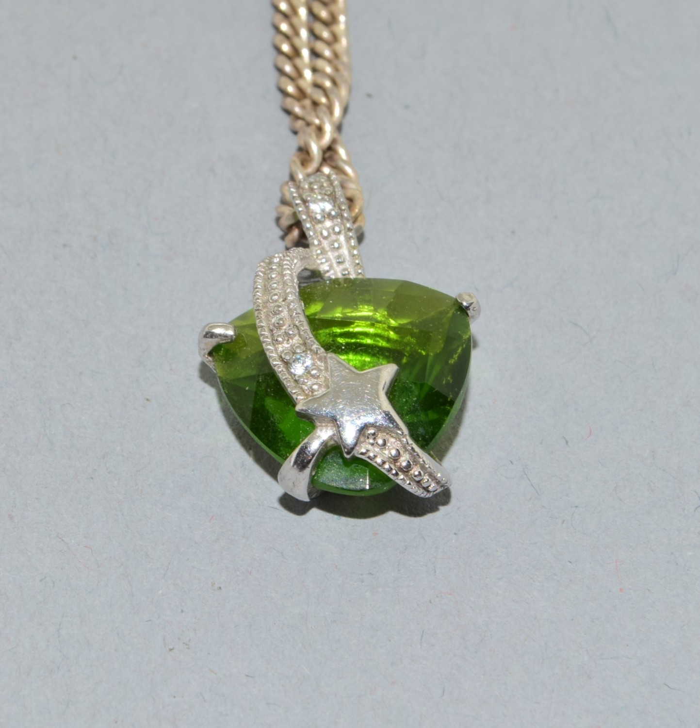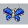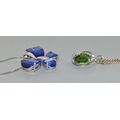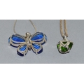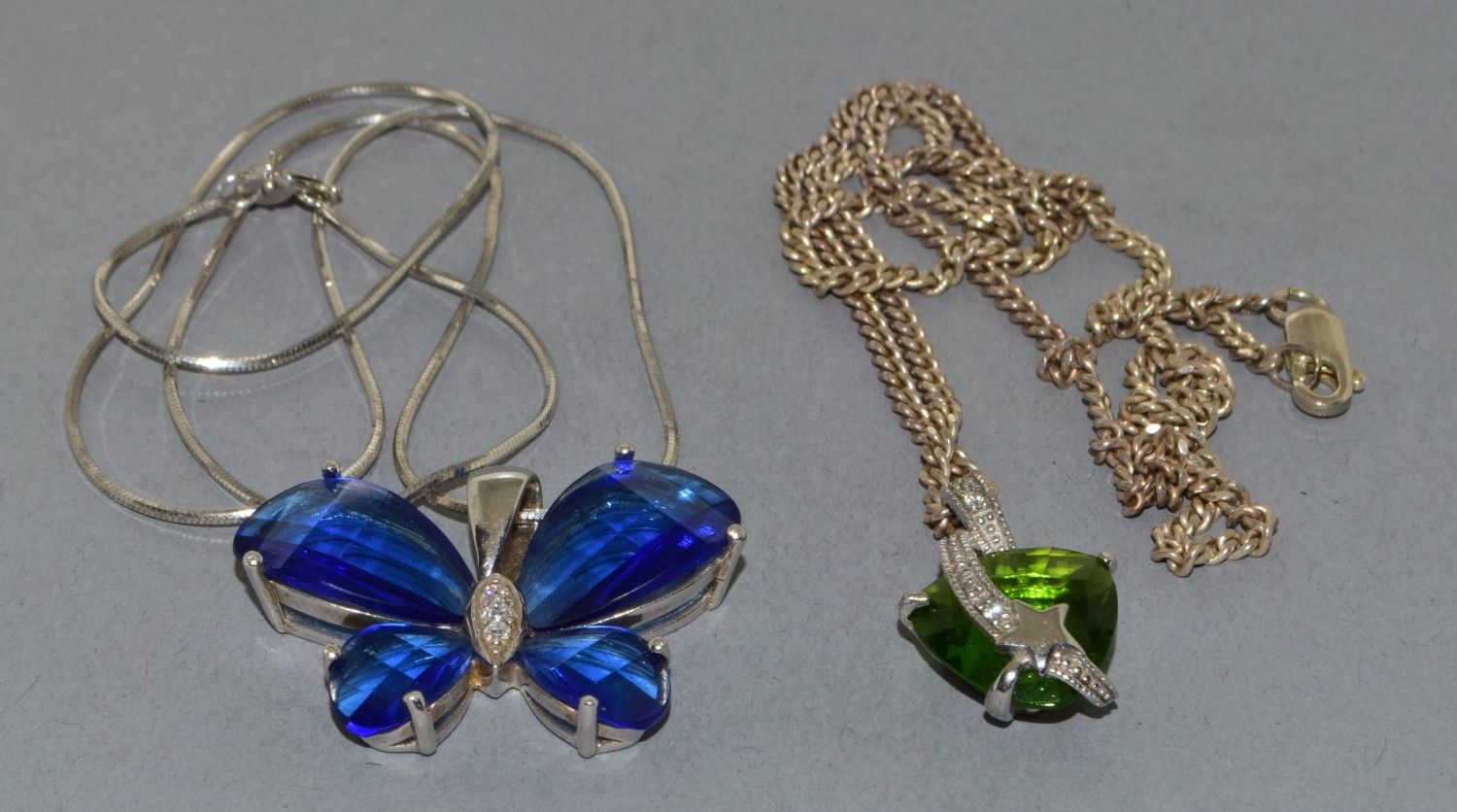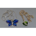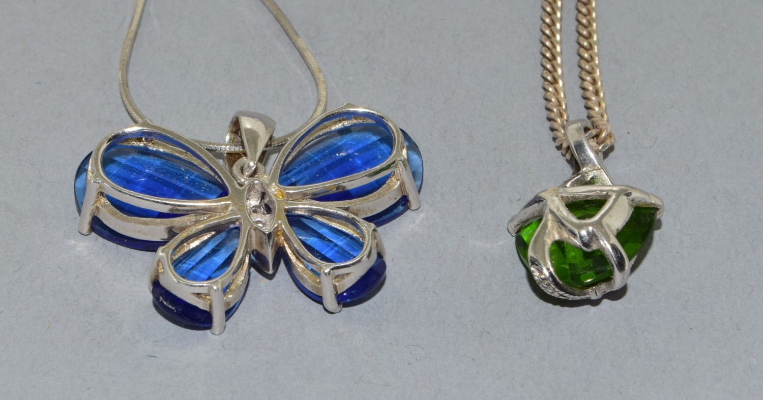 2 x 925 silver pendant necklaces a Butterfly pend and chain together with a green stone pendant and chain, chains 44cm each long