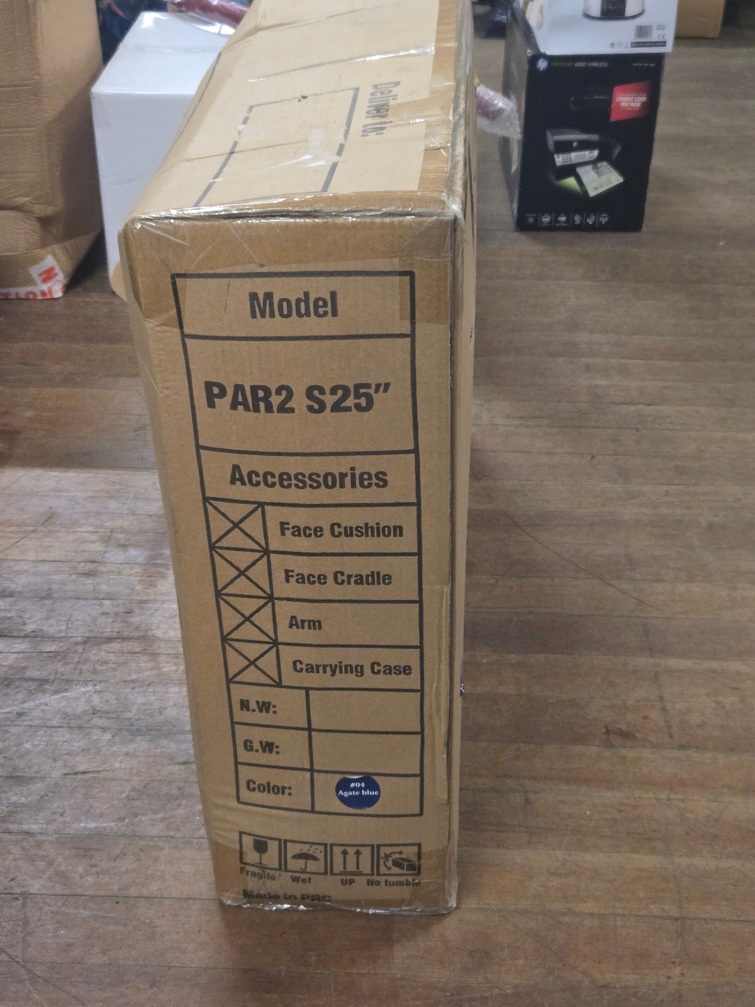 New & Boxed, Olympic PAR2 S25 massage table with face cushion, face cradle, arm & carrying case in agate blue.