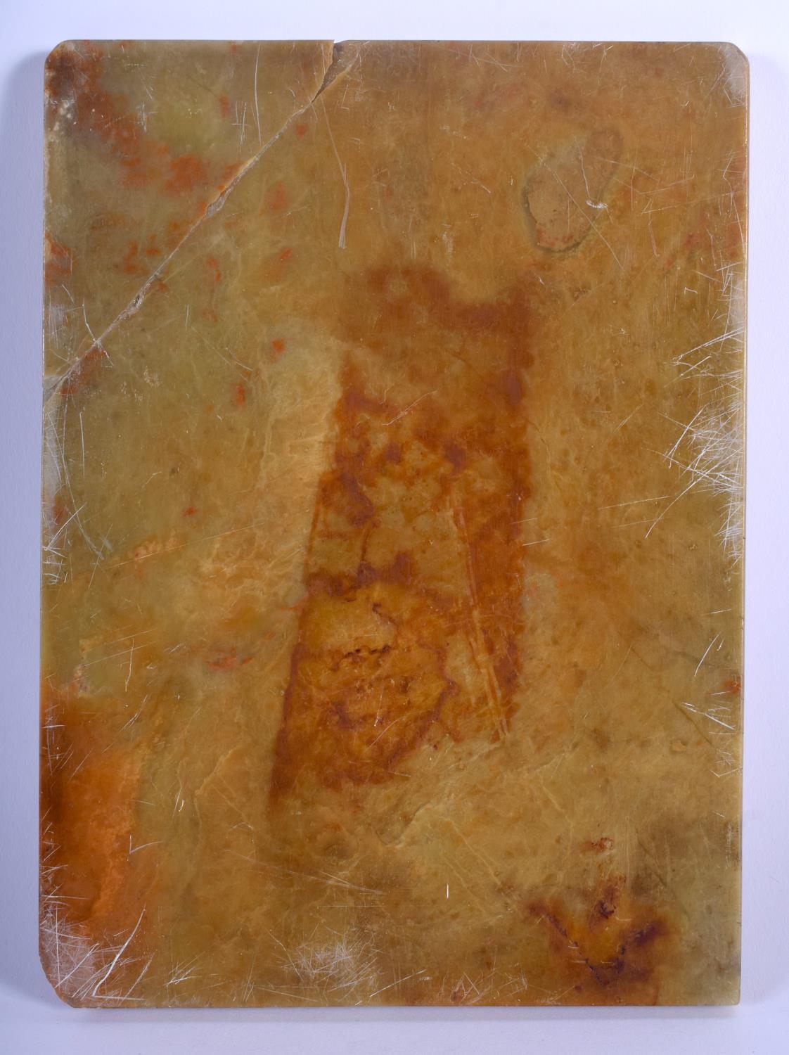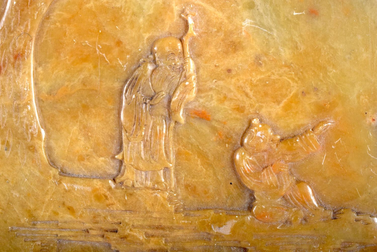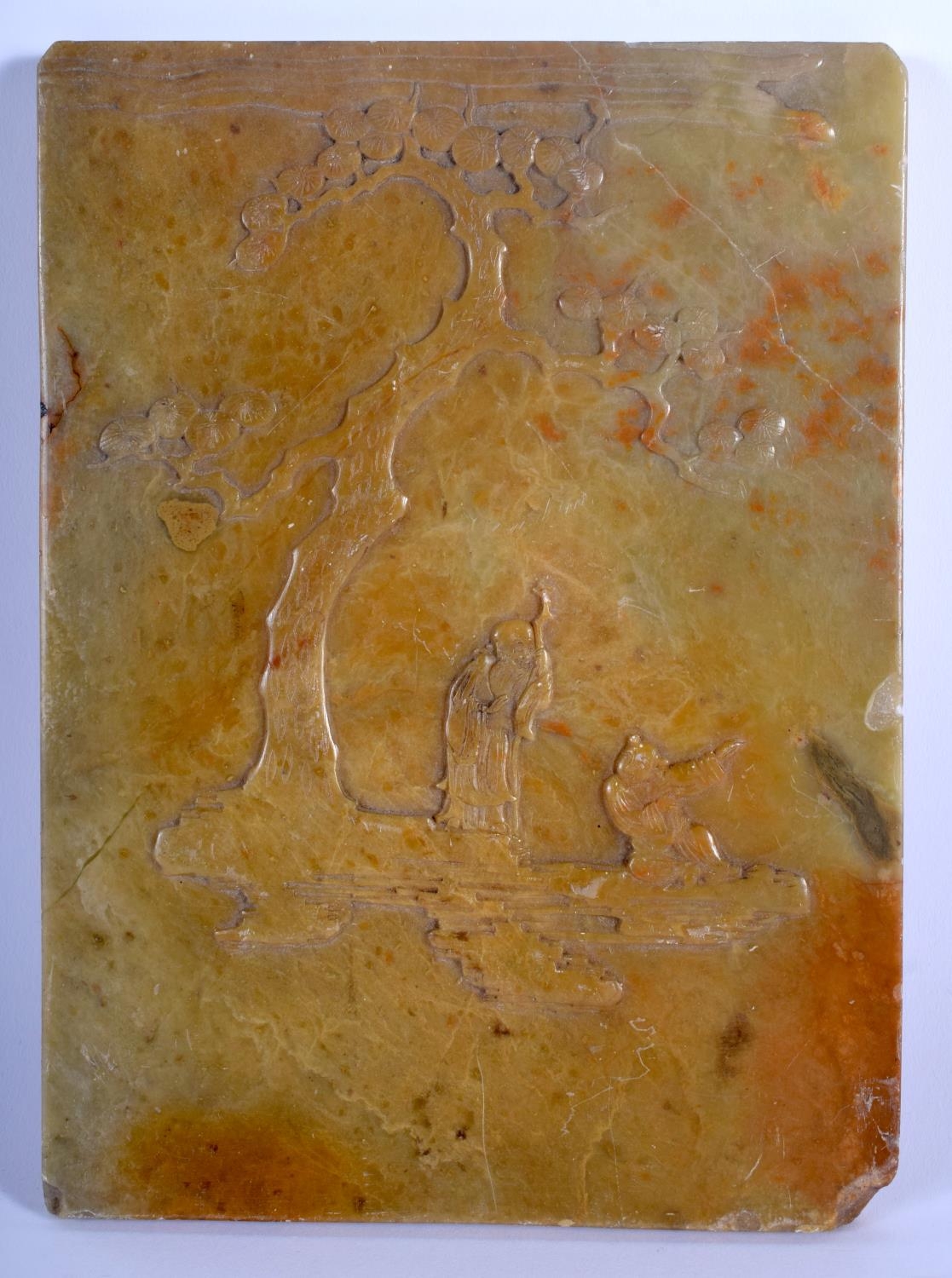AN 18TH/19TH CENTURY CHINESE CARVED SOAPSTONE SCHOLARS PANEL Qianlong/Jiaqing, depicting figures within landscapes. 15 cm x 21 cm.