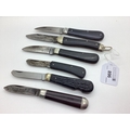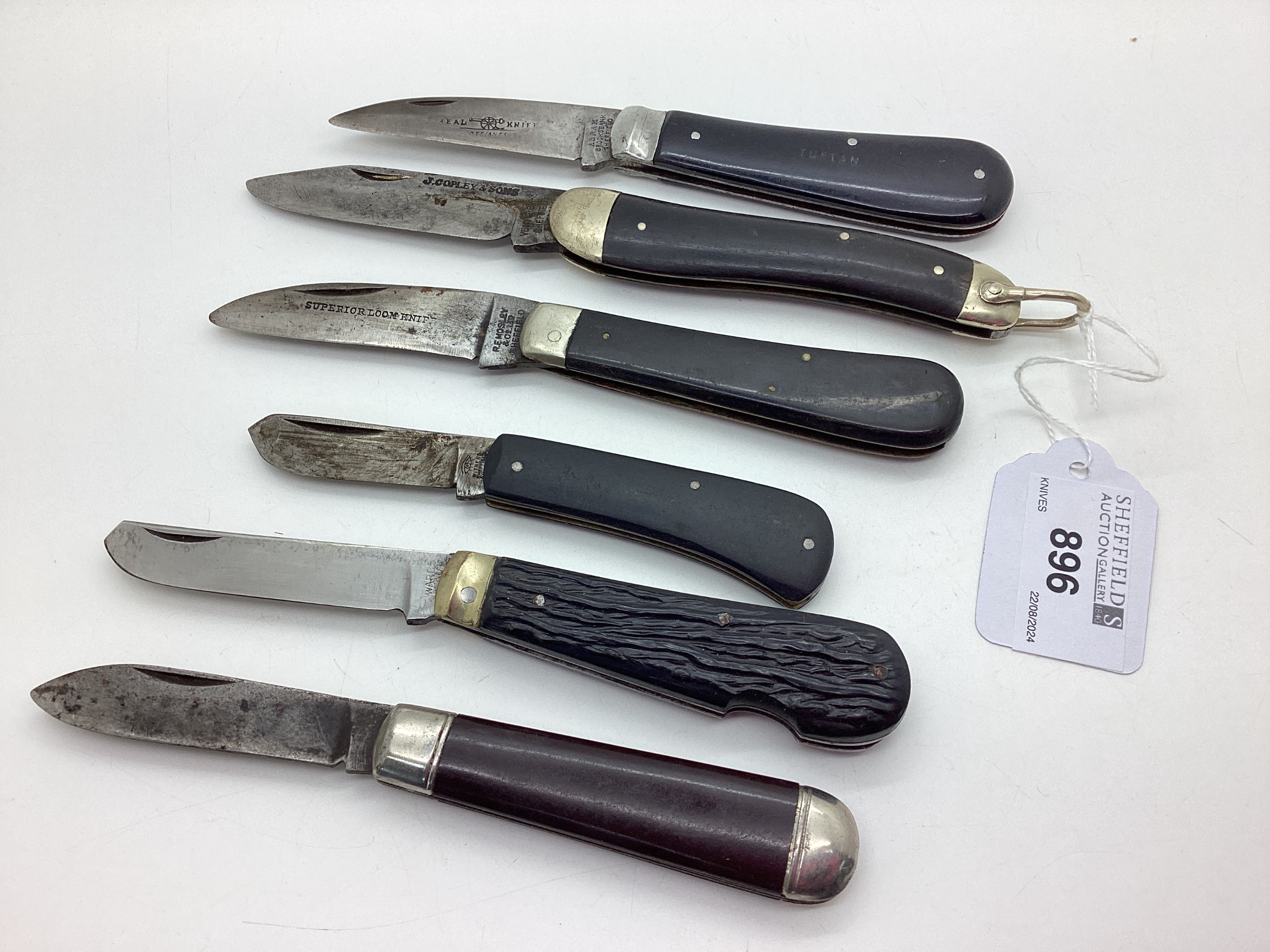 Single Blade Folding Knives, including Abram Brooksbank Real Defiance Knife, J Copley & Sons, Taylors Eye Witness, R.E. Mosley Superior Loom Knife, etc (7.1cm-10.3cm closed). (6)