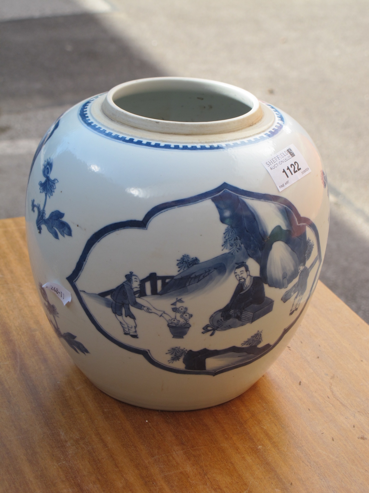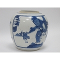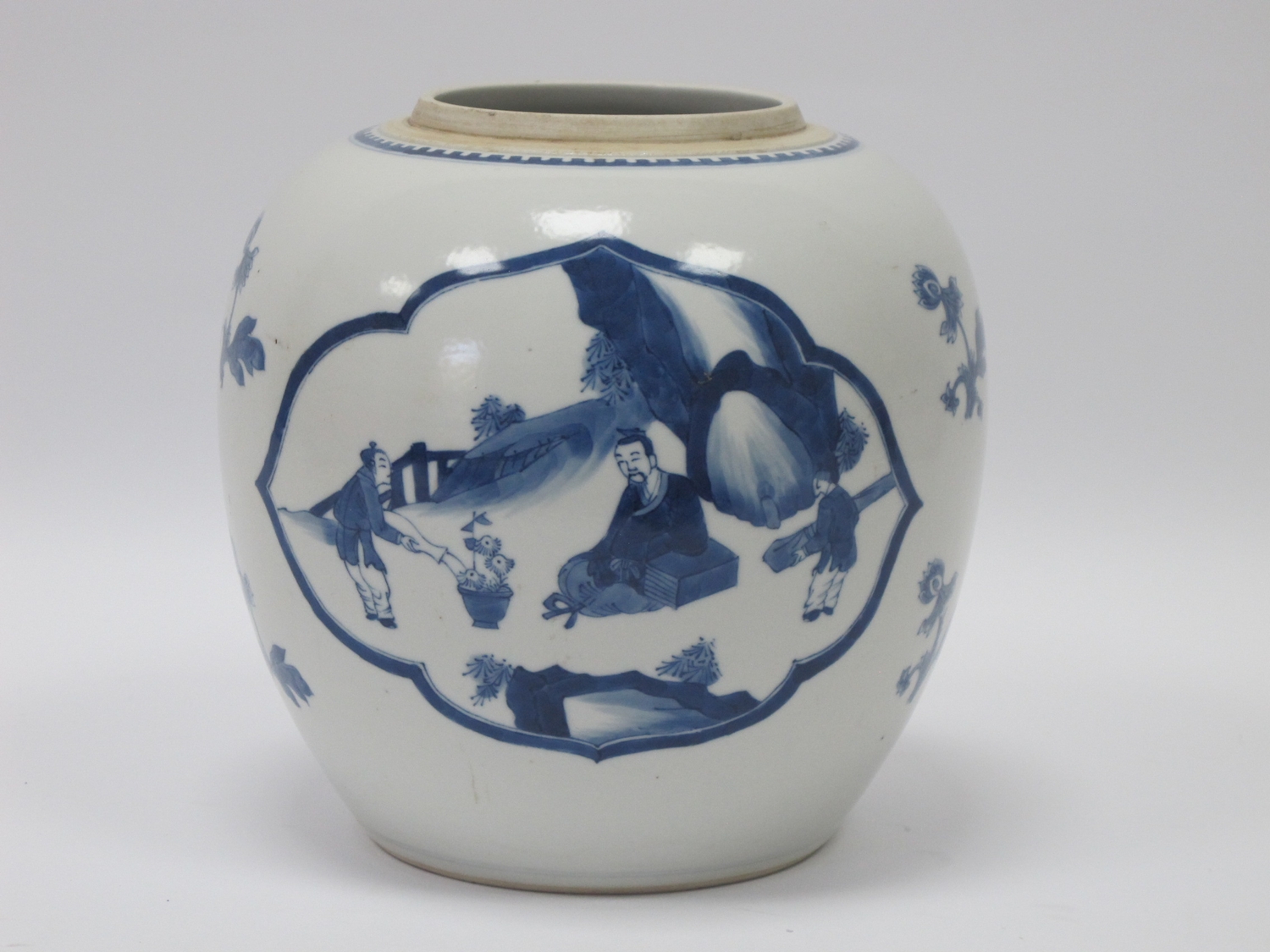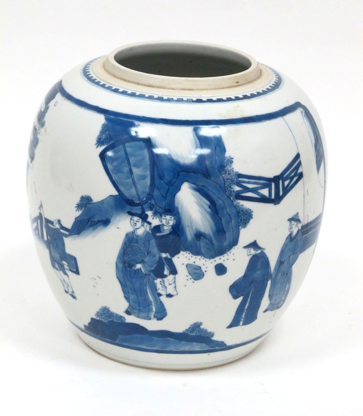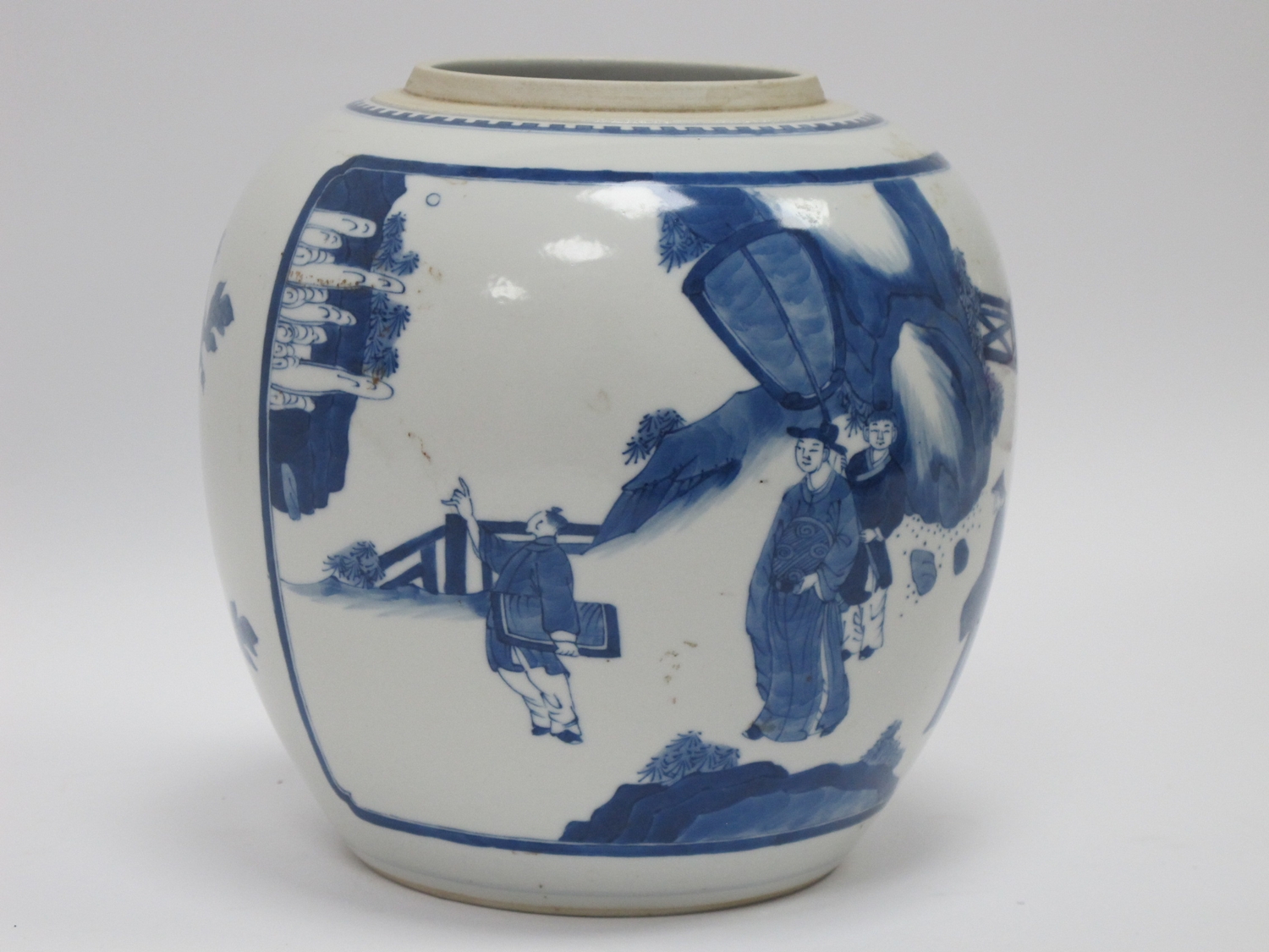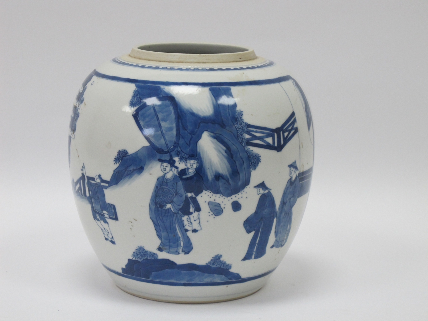 A Late XIX Century Chinese Porcelain Ginger Jar (lacking cover), painted in blue with figures in rocky landscapes, 20cm high.