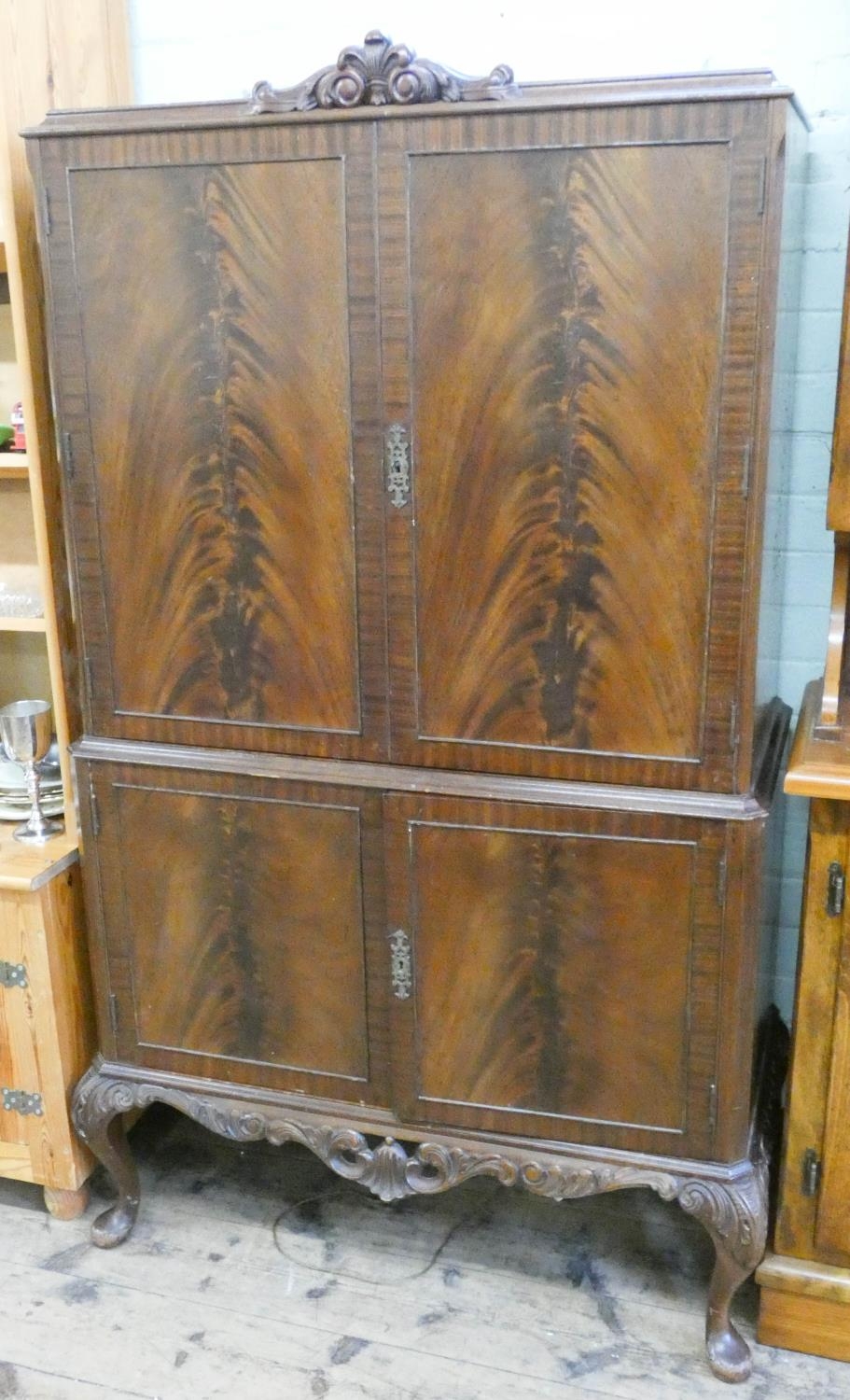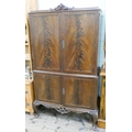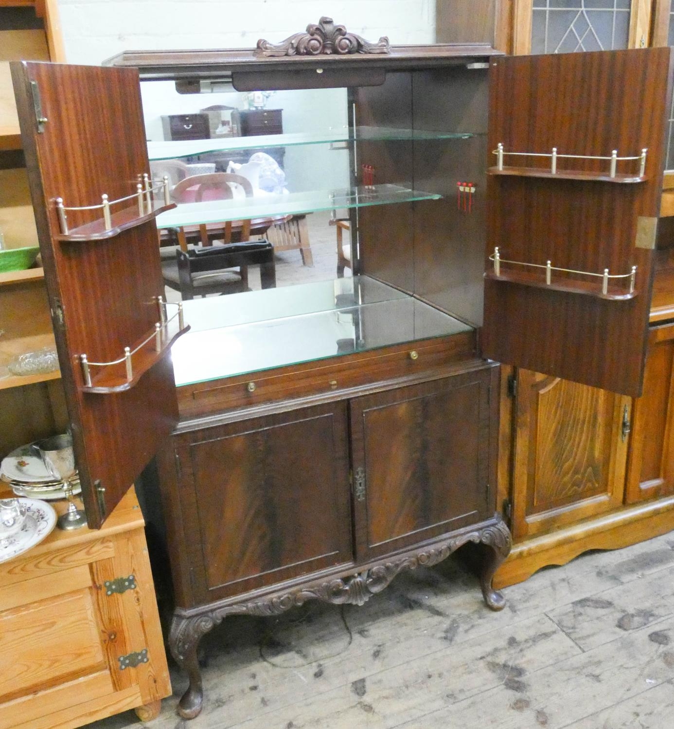 A flame mahogany cocktail cabinet on carved apron and cabriole legs