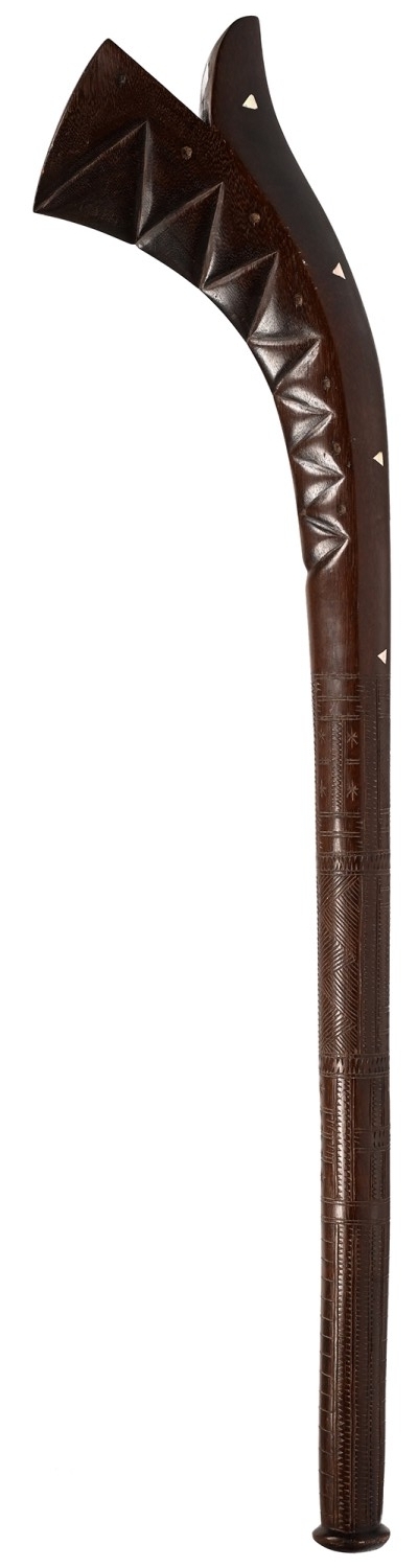 Tribal art. A Fijian 'gunstock' club, first half 20th c, of carved hardwood and inlaid with shell, 99cm l