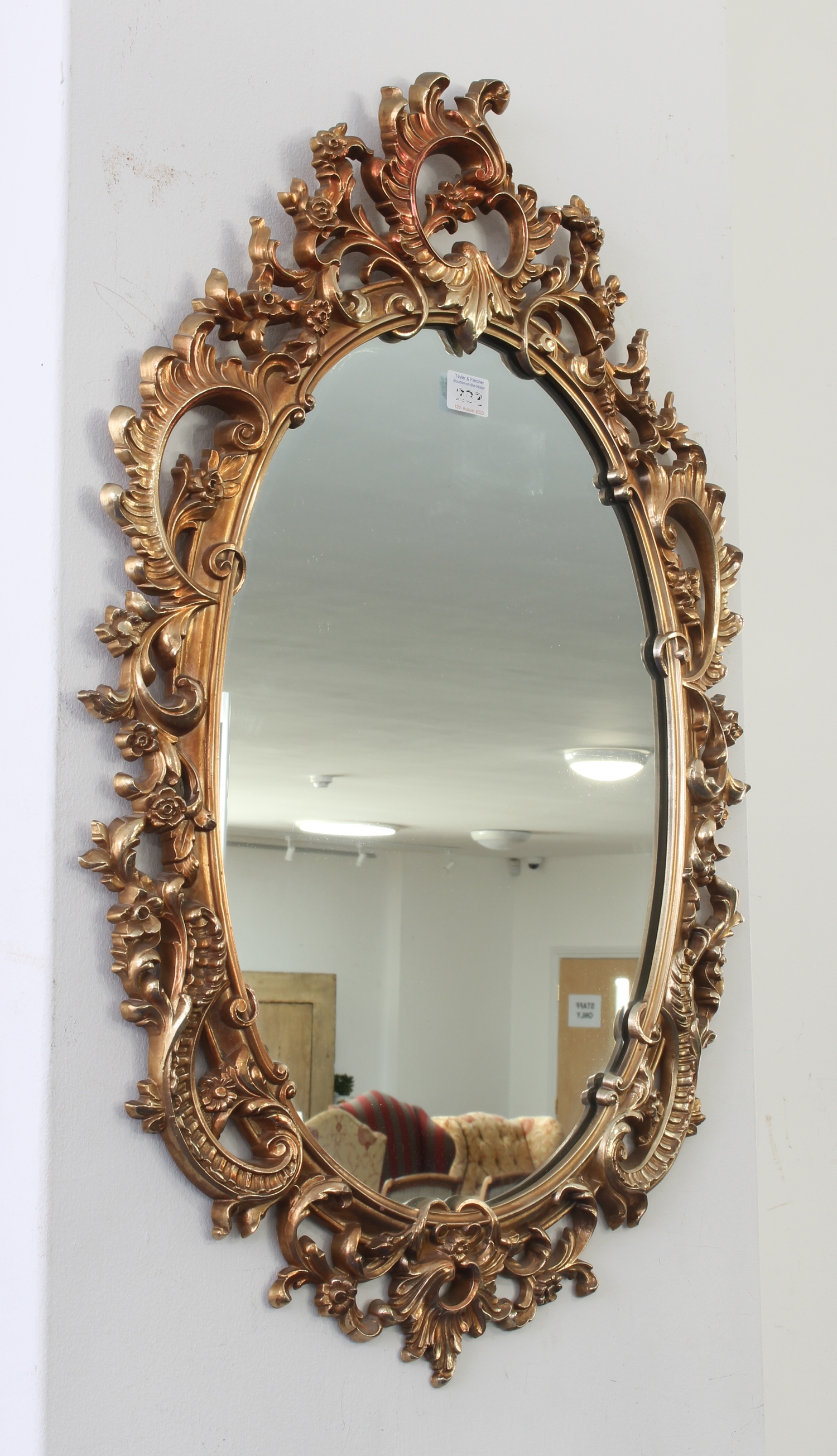 A modern gilt framed composition wall-hanging looking glass in high Rococo style (73.5 x 49 cm)