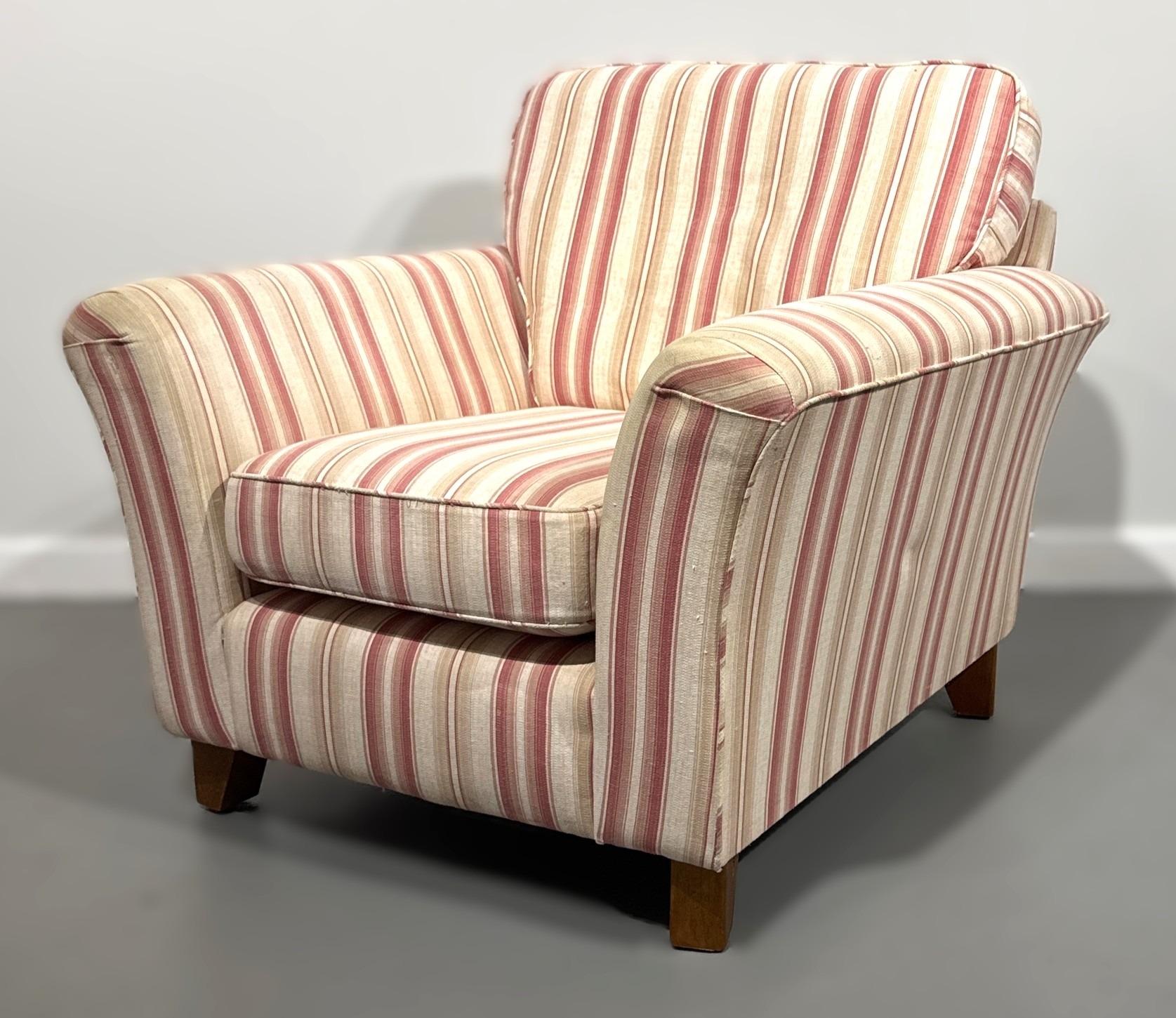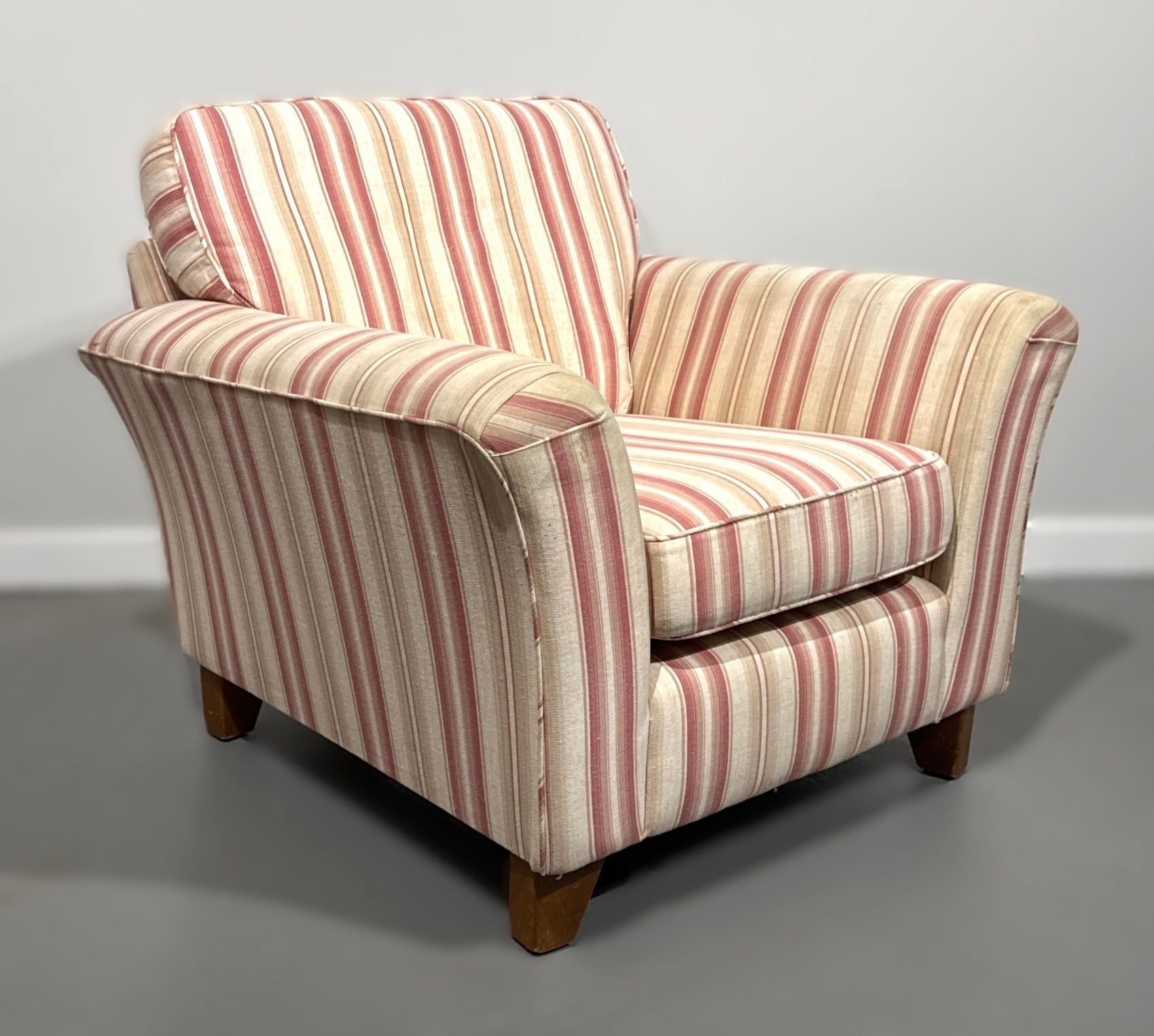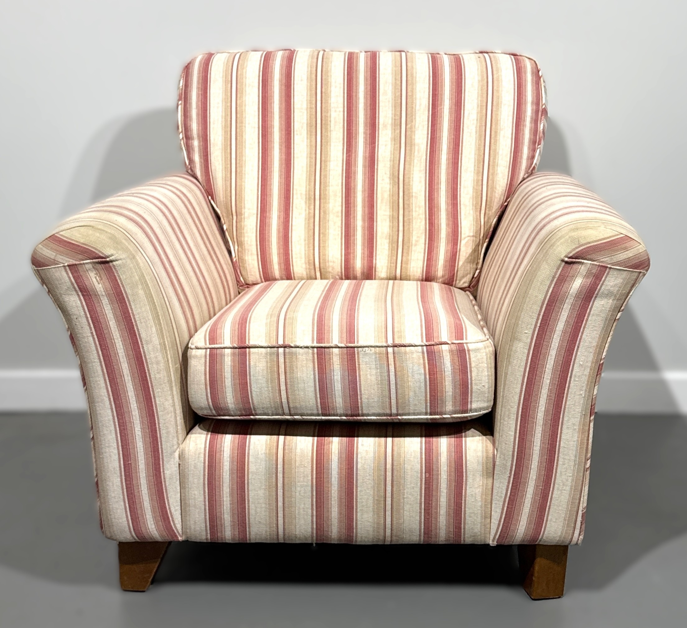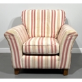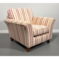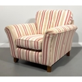 Pink and white modern armchair; 85cm high, 94cm width, 92cm depth.